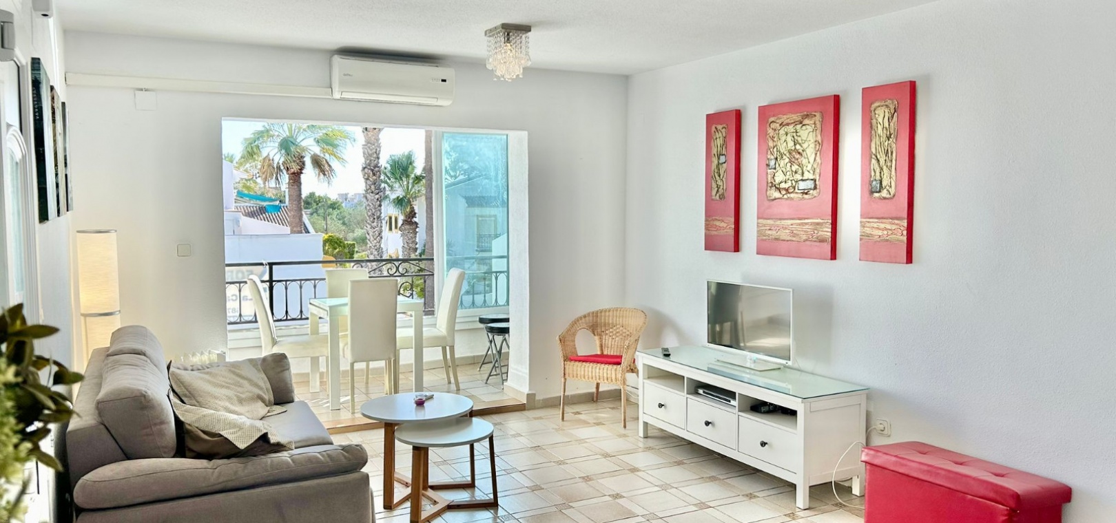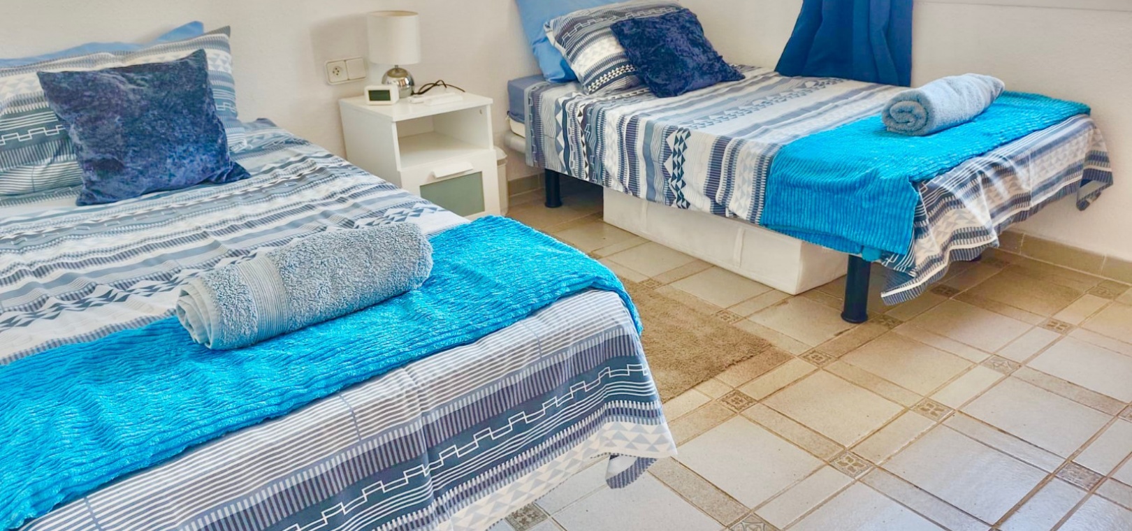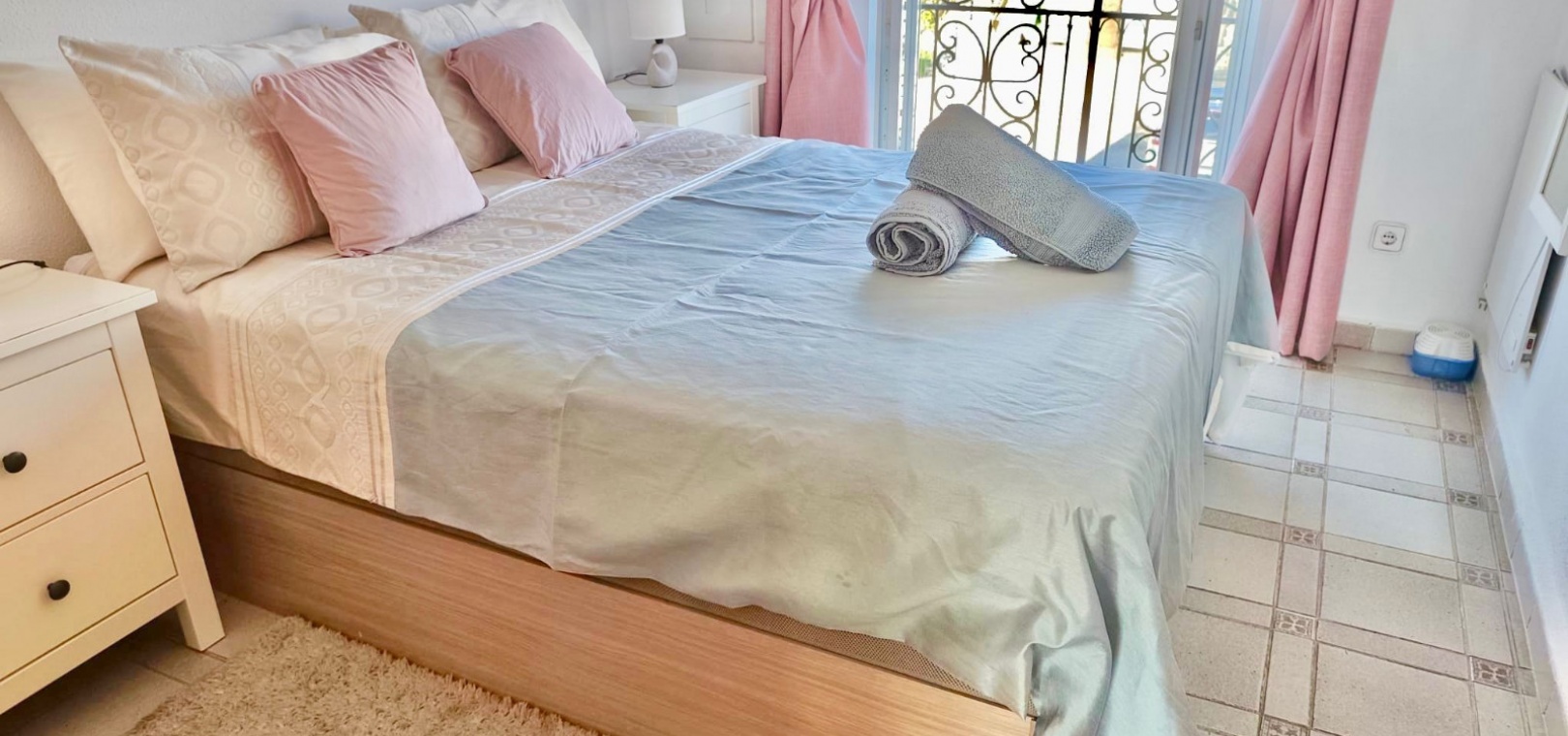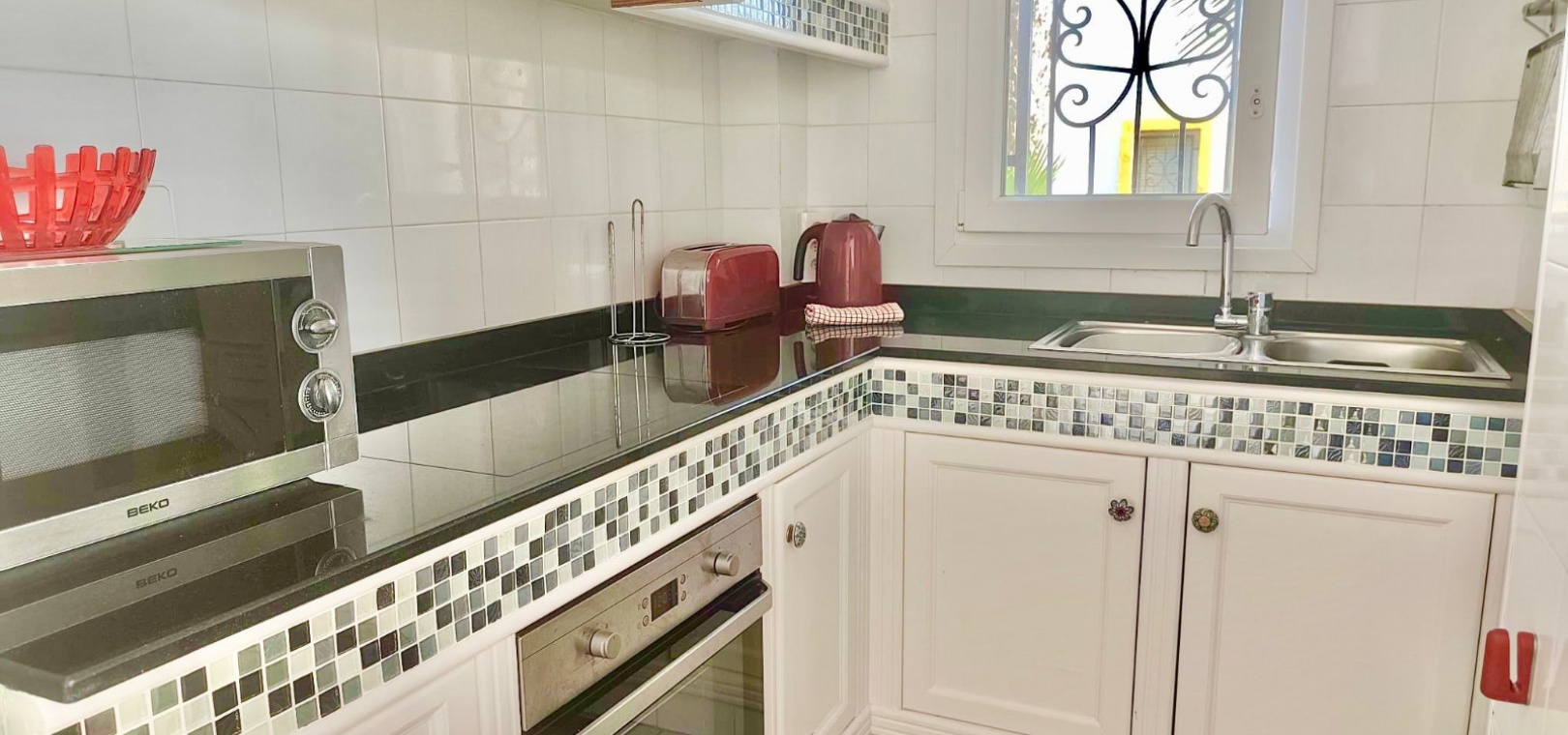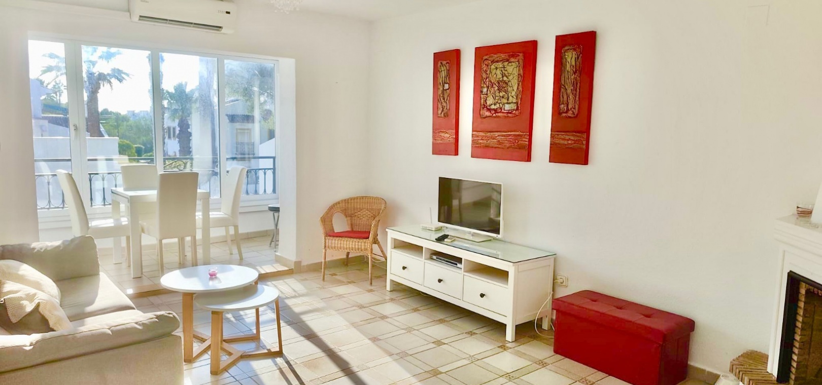 Salon/salle à manger lumineux avec climatisation réversible et portes-fenêtres donnant sur un balcon privé Un escalier extérieur relie le balcon à un spacieux solarium privé sur le toit, équipé d'un barbecue. Cuisine ouverte entièrement équipée avec buanderie séparée Salle de bain avec douche à l'italienne Deux chambres doubles, toutes deux avec placards intégrés Jardin privé sur le côté et à l'arrière Accès à une belle piscine commune et à des espaces communs bien entretenus