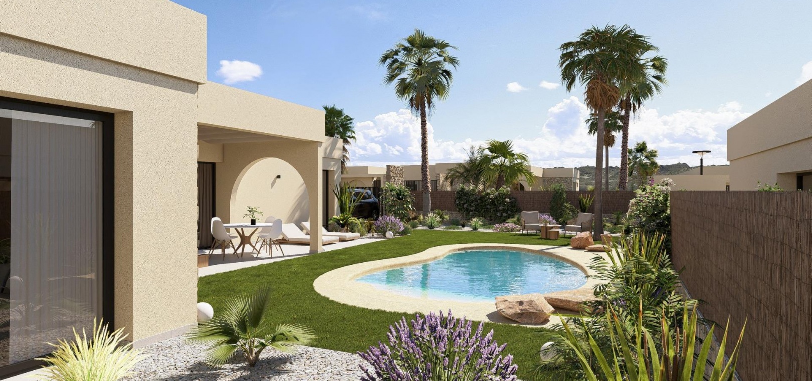 Chaque villa comprend un système d'interphone vidéo, une domotique avec deux interrupteurs intelligents et un accès motorisé à la communauté fermée. Le jardin privé est livré aménagé avec un système d'irrigation goutte à goutte et une piscine privée accueillante, idéale pour profiter du climat méditerranéen toute l'année.