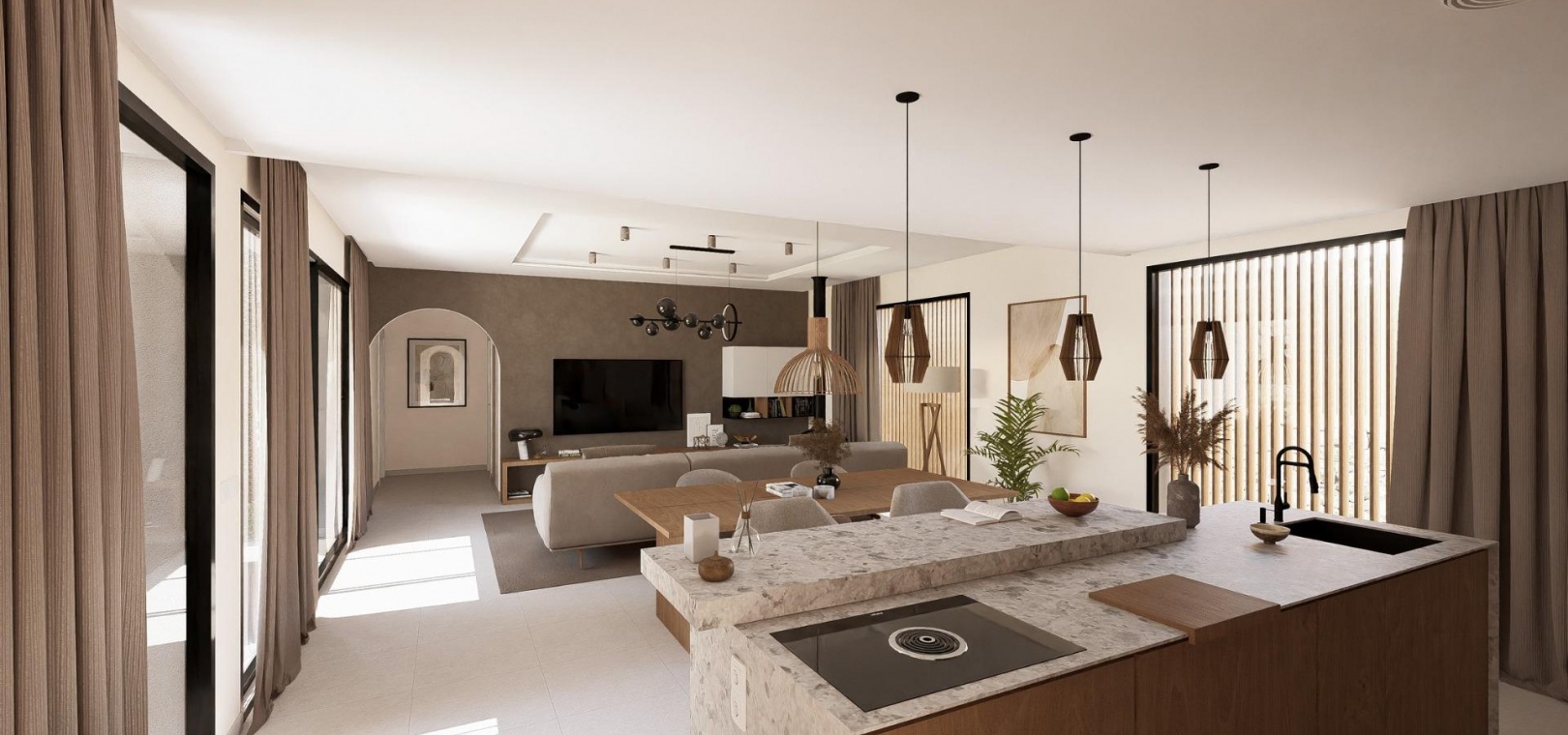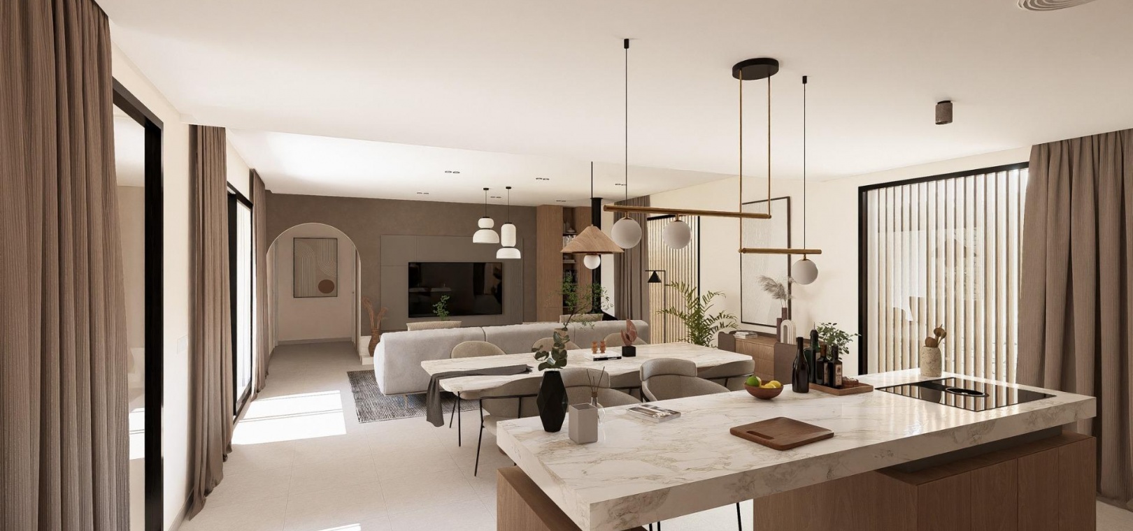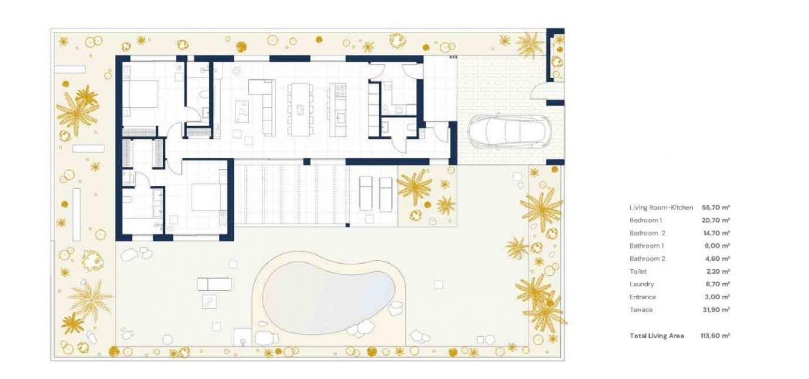 Ces élégantes villas sont conçues de plain-pied pour un maximum de confort et de fonctionnalité. Les acheteurs peuvent choisir entre 2, 3 ou 4 chambres et 2 ou 3 salles de bains, plus des toilettes pour invités. Chaque maison dispose d'une cuisine ouverte et d'un salon qui communiquent directement avec la terrasse extérieure et le jardin paysager privé avec piscine. Une place de parking privée est incluse dans la parcelle, garantissant commodité et intimité.