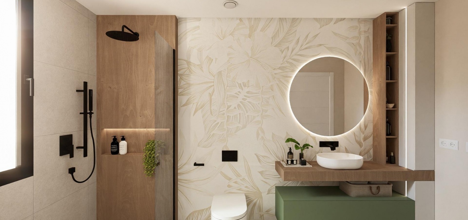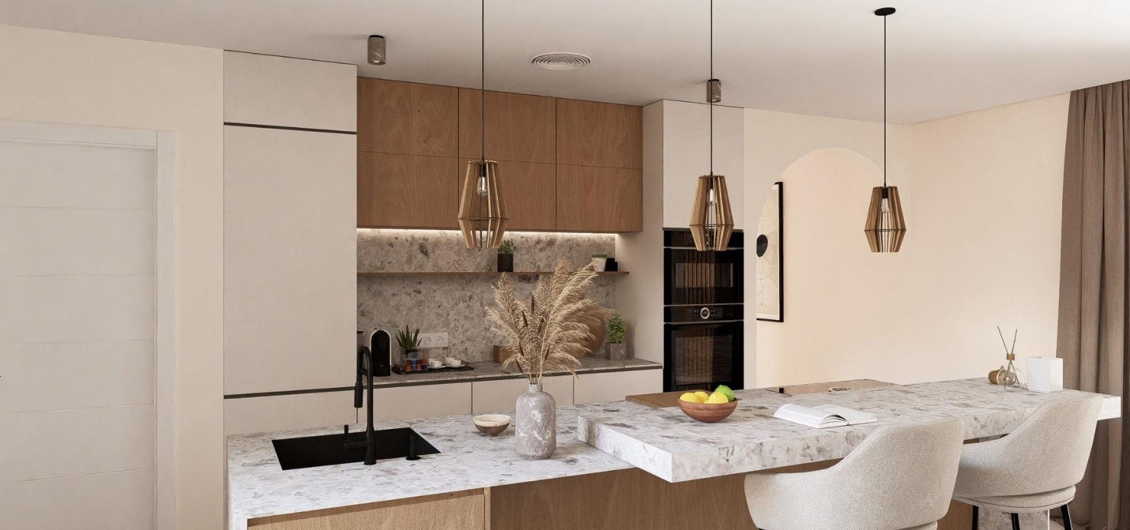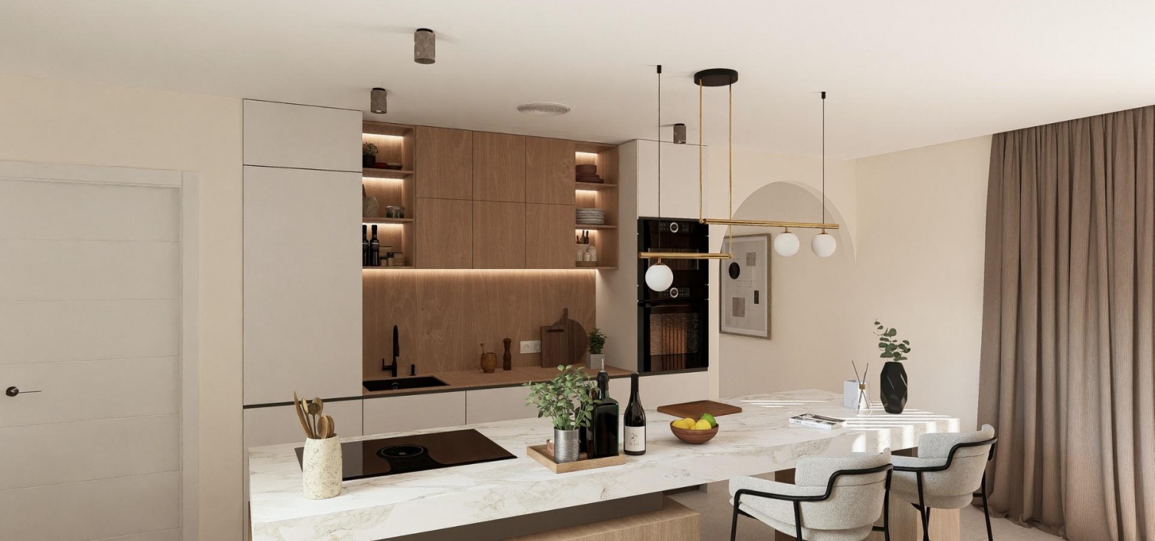 La cuisine est équipée d'une hotte aspirante et d'une plaque à induction électrique. L'éclairage LED est inclus dans le salon, le couloir et les espaces extérieurs, tandis que les autres pièces sont prévues pour que le propriétaire puisse personnaliser l'éclairage. Les chambres sont équipées de prises USB pour plus de commodité.