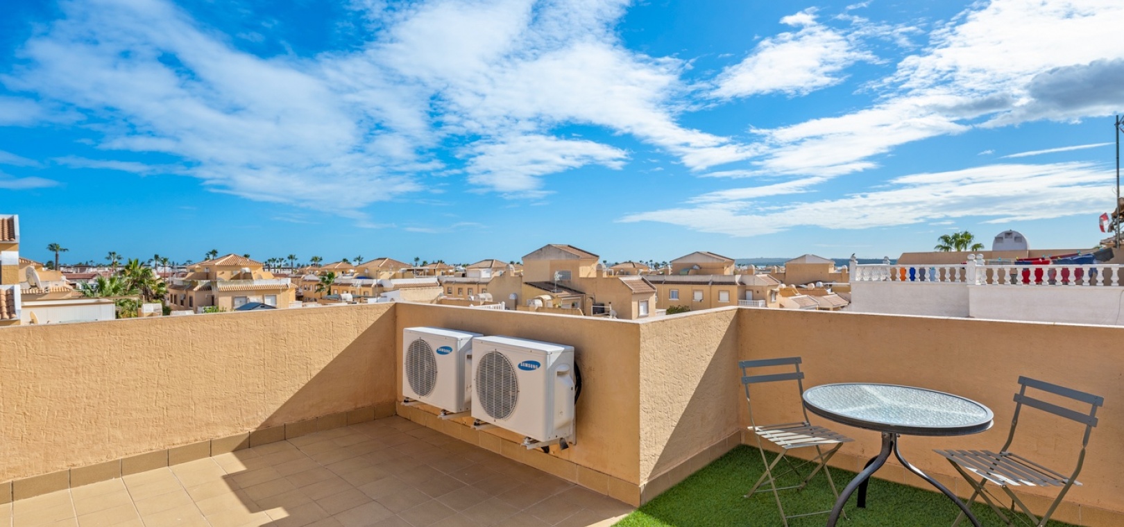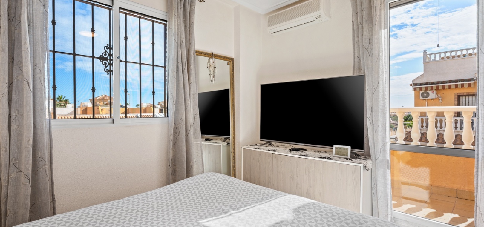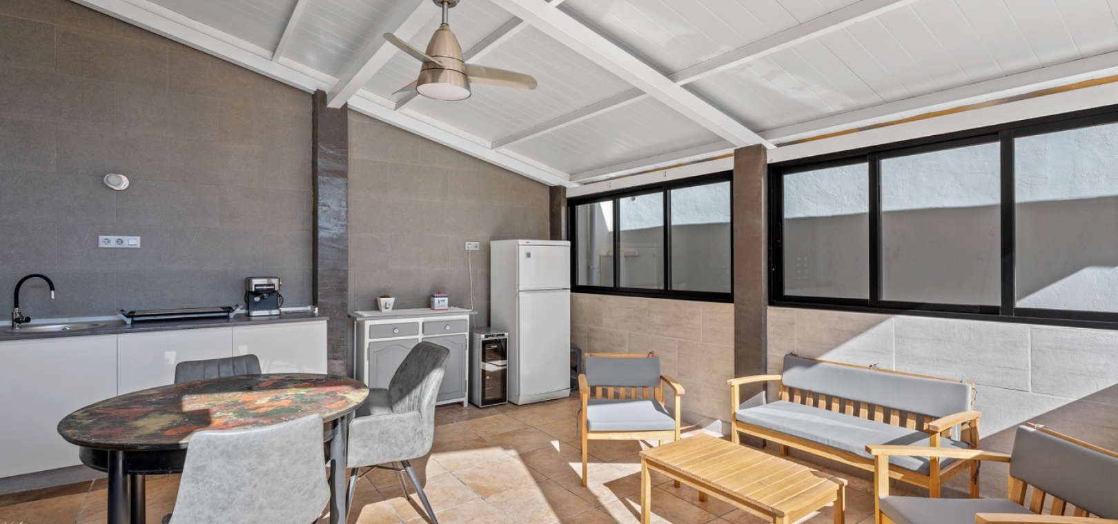 À l'étage, trois chambres vous attendent : une grande chambre double avec terrasse privative, climatisation et ventilateur de plafond, ainsi que deux chambres simples idéales pour la famille, les invités ou un bureau. De ce niveau, vous accédez à un magnifique solarium avec jacuzzi, un espace parfait pour se détendre et profiter du soleil toute l'année.