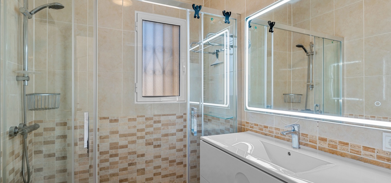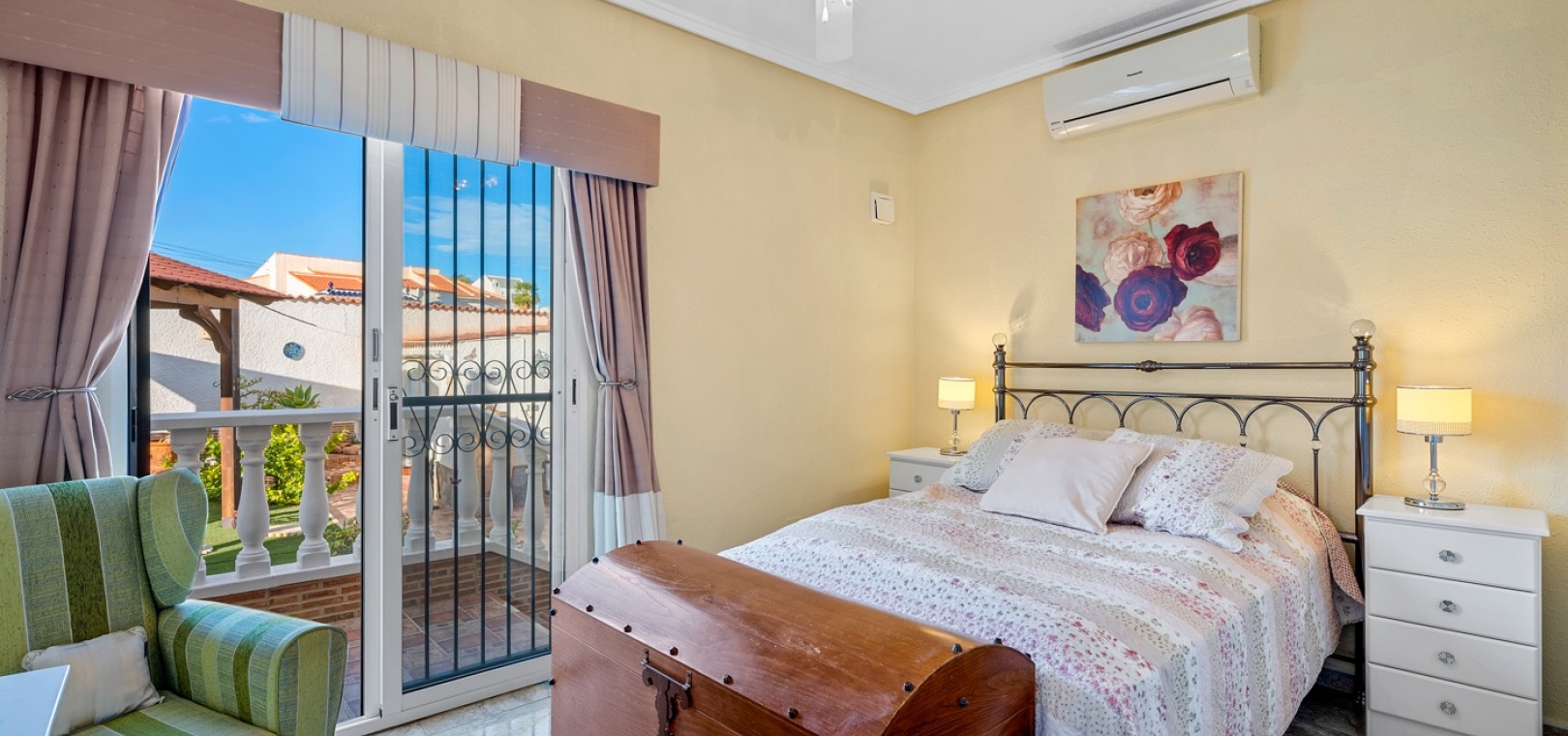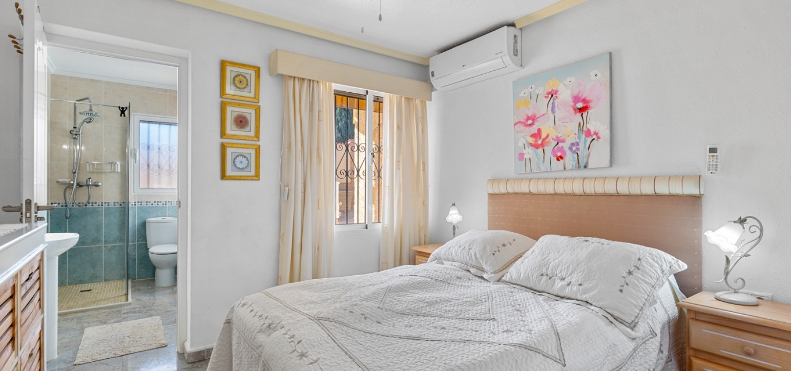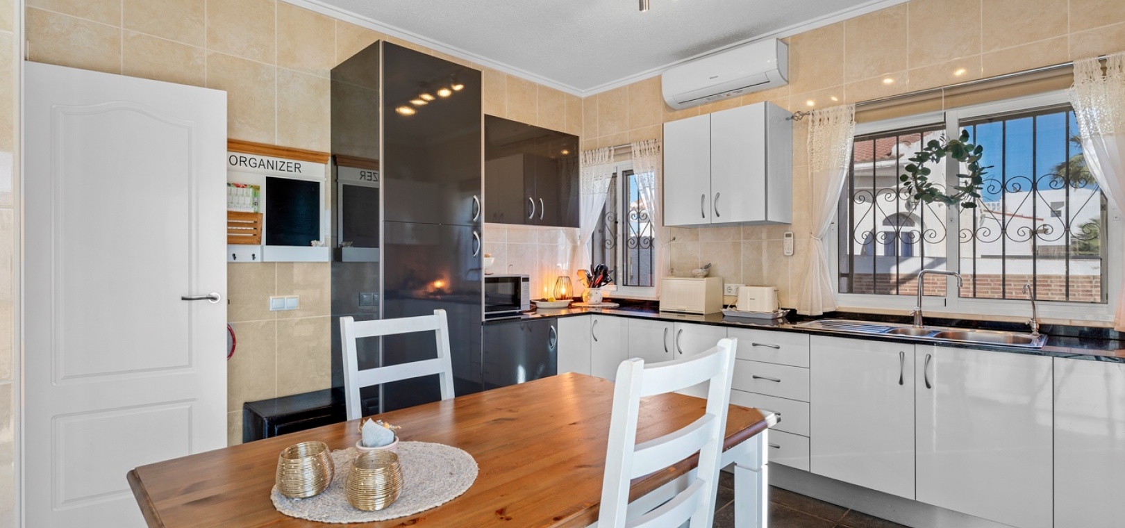 La villa offre environ 150 m² habitables répartis sur deux niveaux. Elle dispose de quatre grandes chambres avec placards intégrés et de trois salles de bains élégantes, idéales pour une famille ou pour recevoir des invités. La maison comprend une cuisine de luxe entièrement équipée, une seconde cuisine d’été parfaite pour les réceptions, ainsi qu’un agréable salon avec cheminée et climatisation dans toute la maison.
