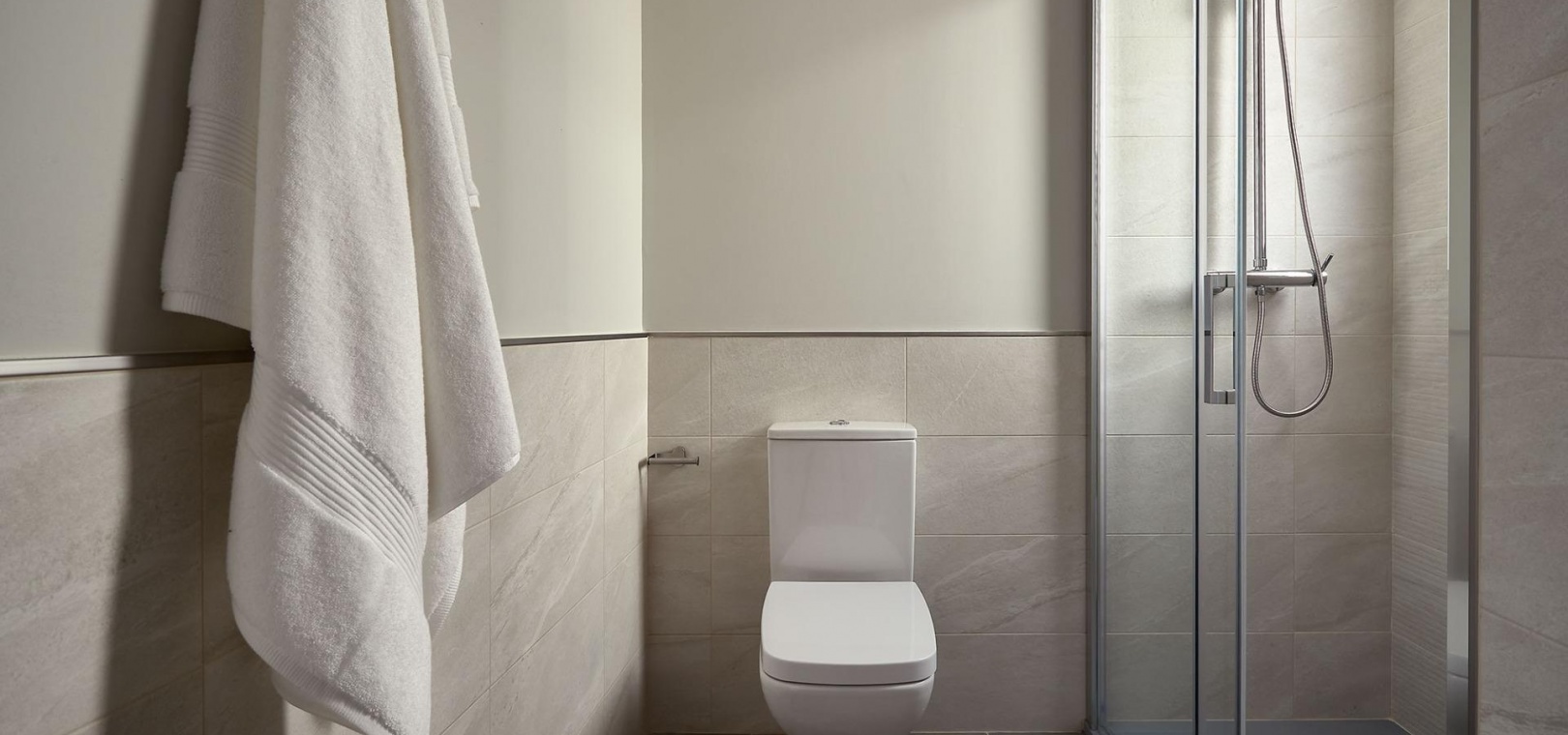Toutes les salles de bains sont équipées d'une douche au lieu d'une baignoire, de miroirs encastrés et également d'un comptoir en pierre et d'une cloison en verre dans la salle de bains principale.