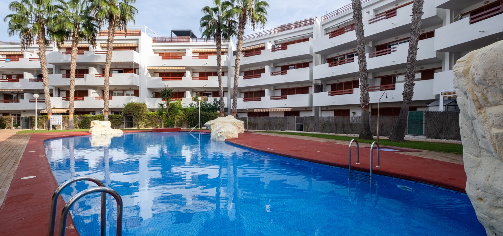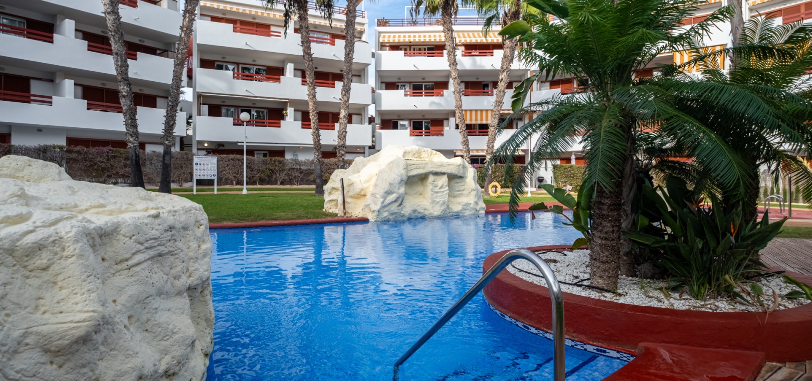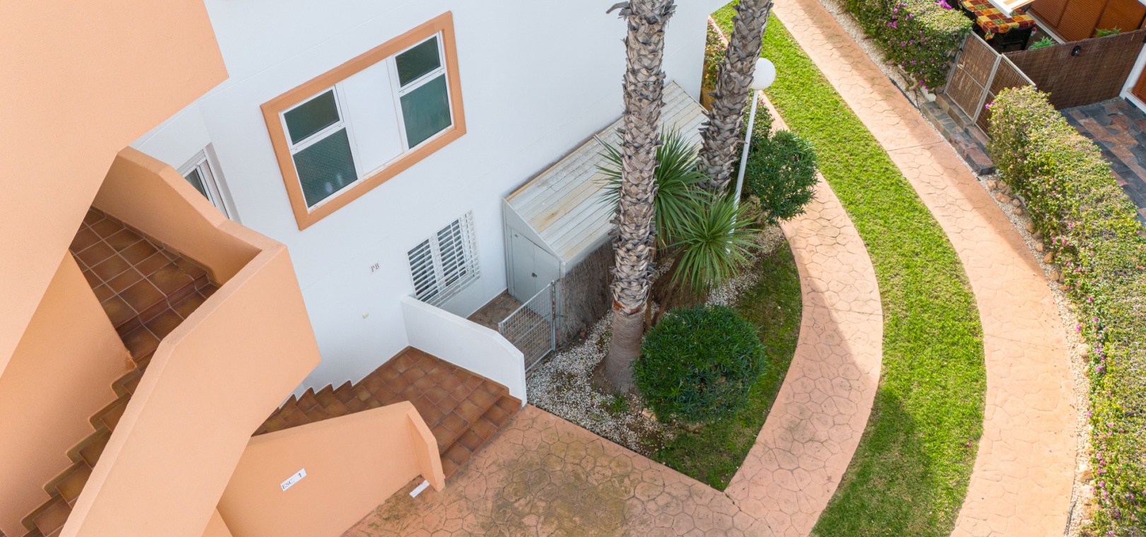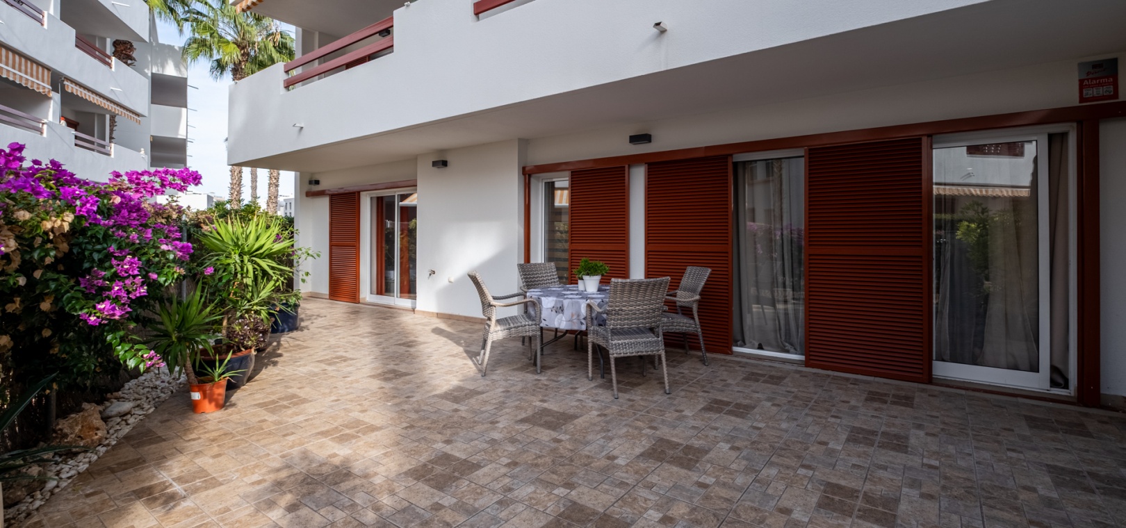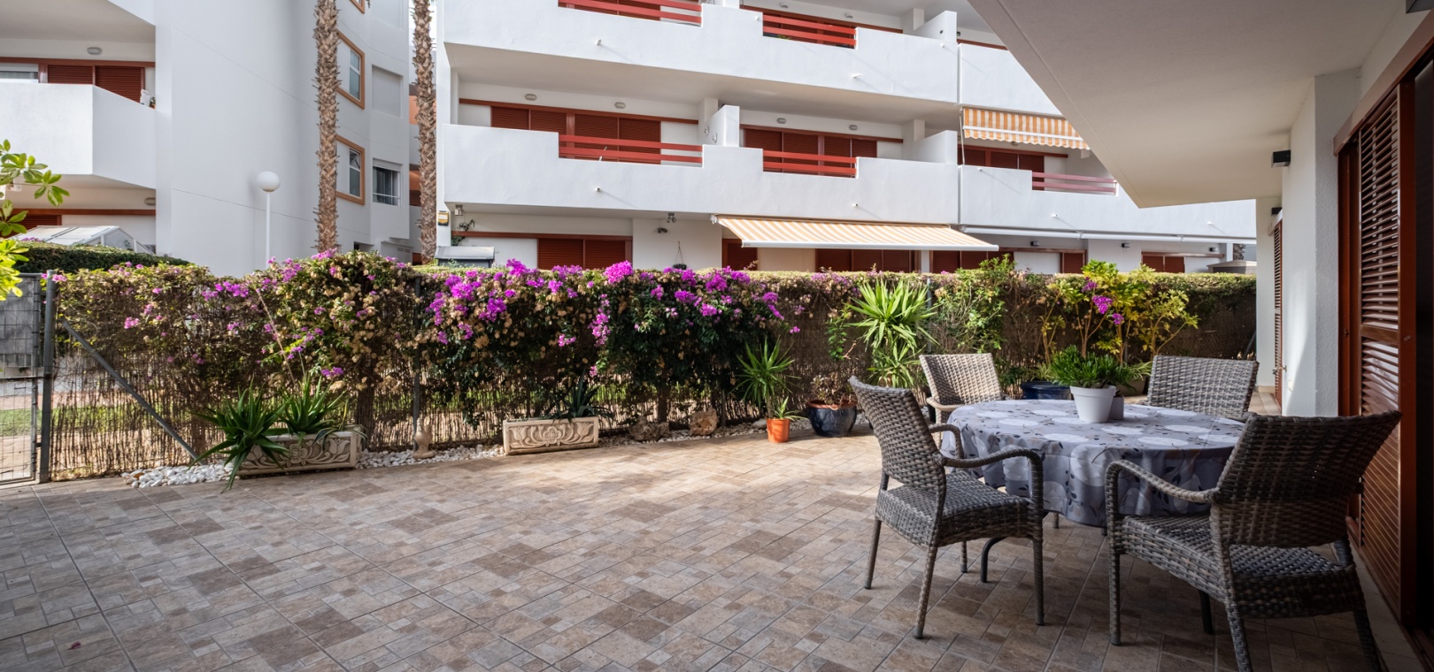 Depuis le salon et les deux chambres, on accède à une grande terrasse privée ensoleillée donnant sur les jardins communautaires magnifiquement entretenus — l'endroit idéal pour dîner en plein air, se détendre et profiter du climat méditerranéen.