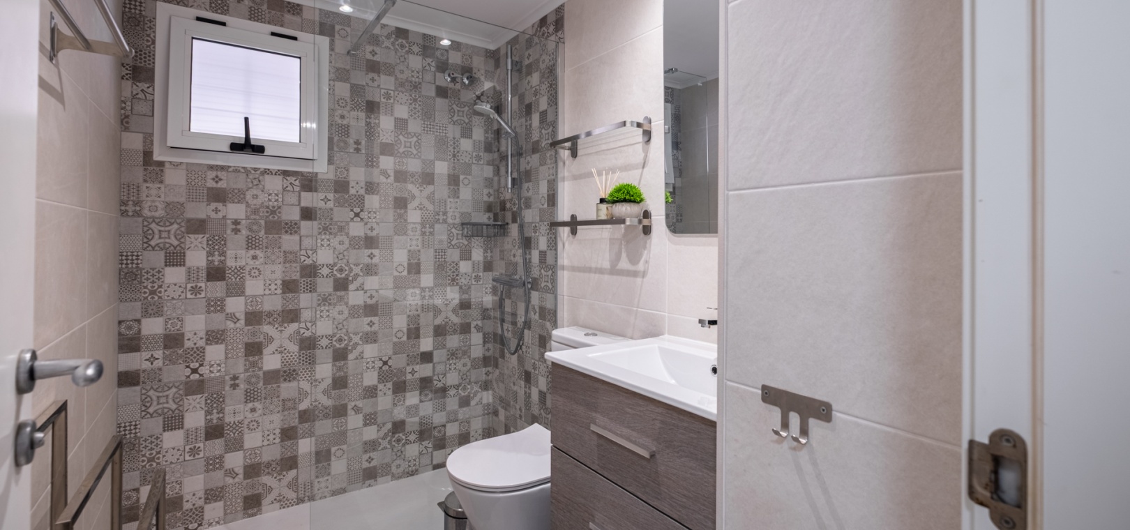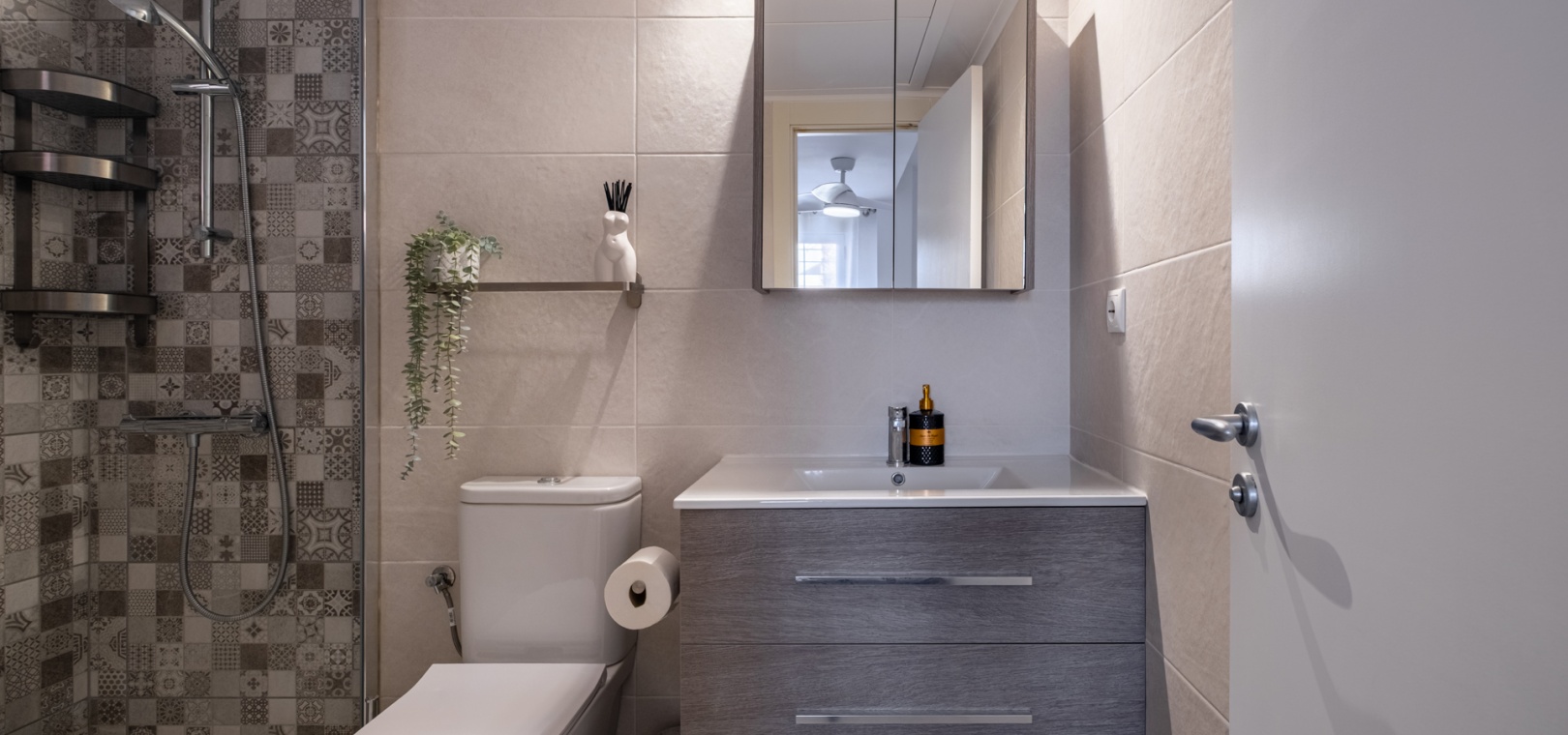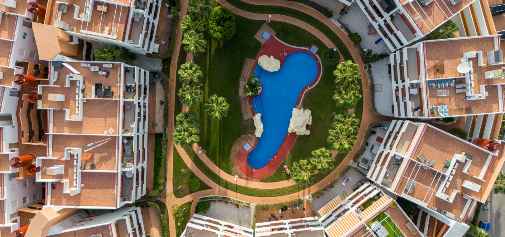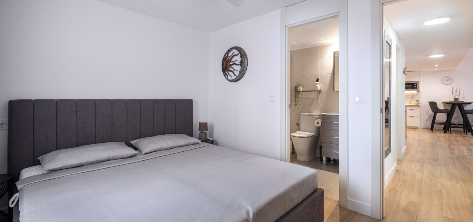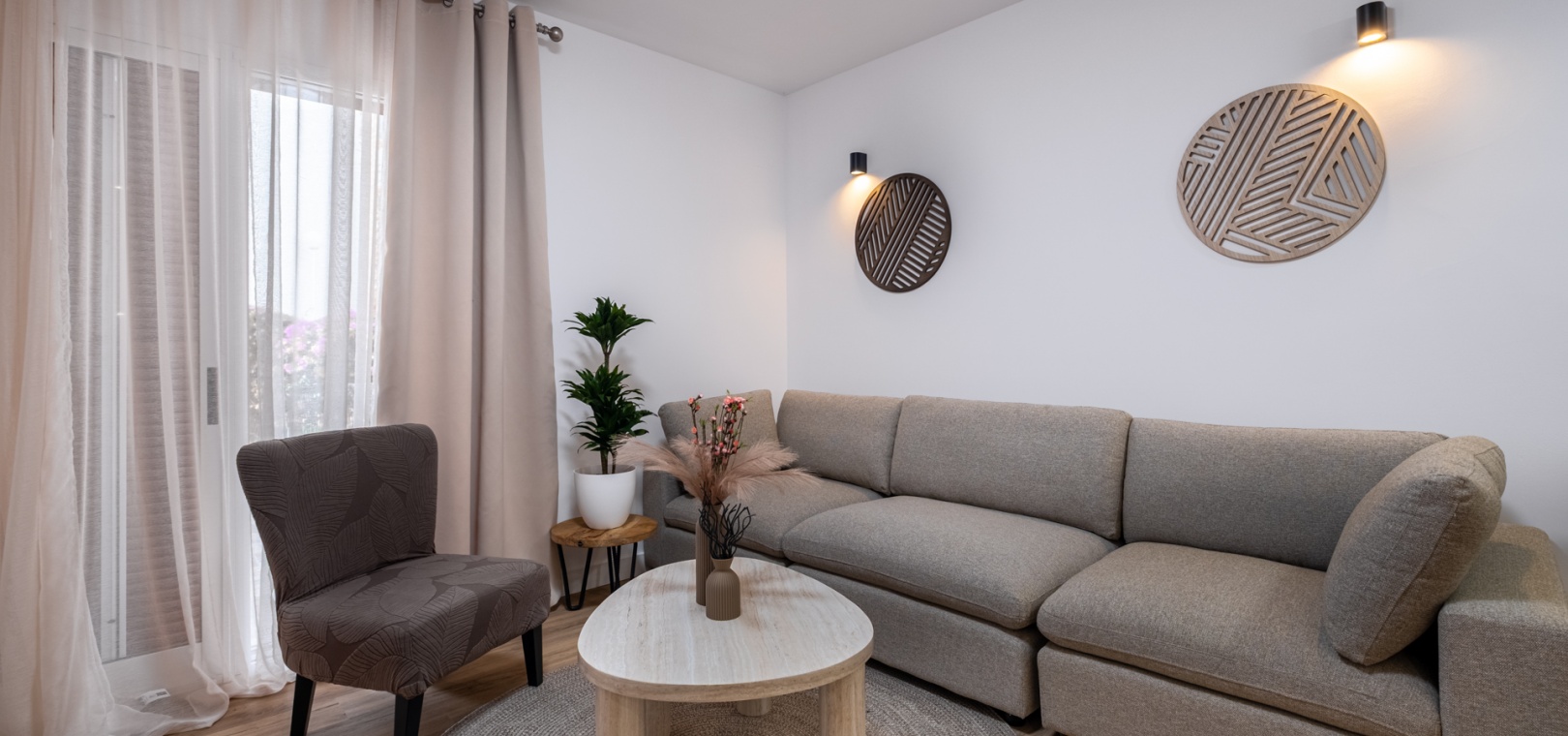 Depuis le salon et les deux chambres, on accède à une grande terrasse privée ensoleillée donnant sur les jardins communautaires magnifiquement entretenus — l'endroit idéal pour dîner en plein air, se détendre et profiter du climat méditerranéen.