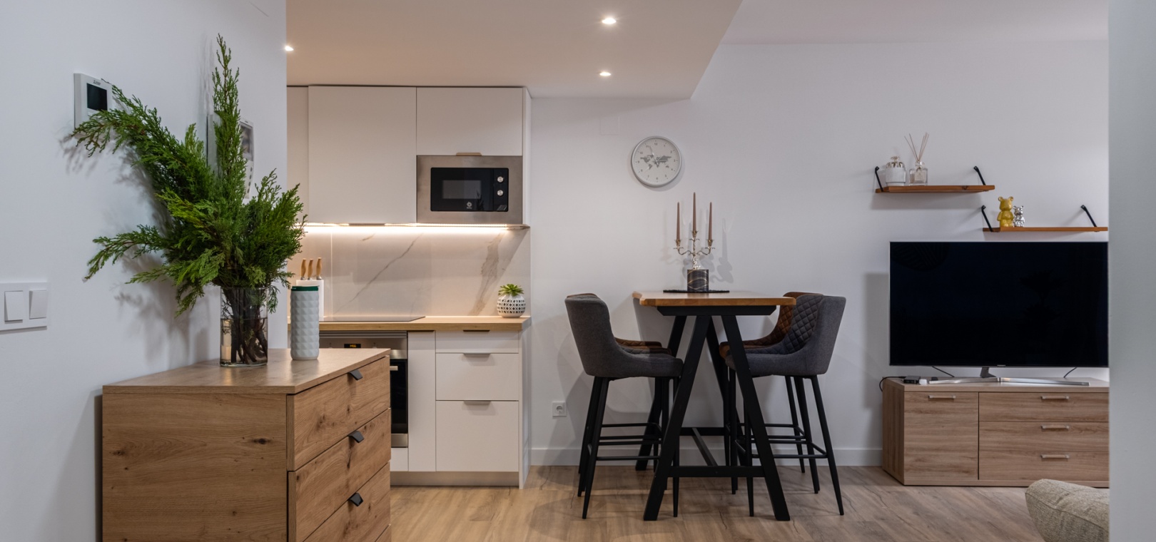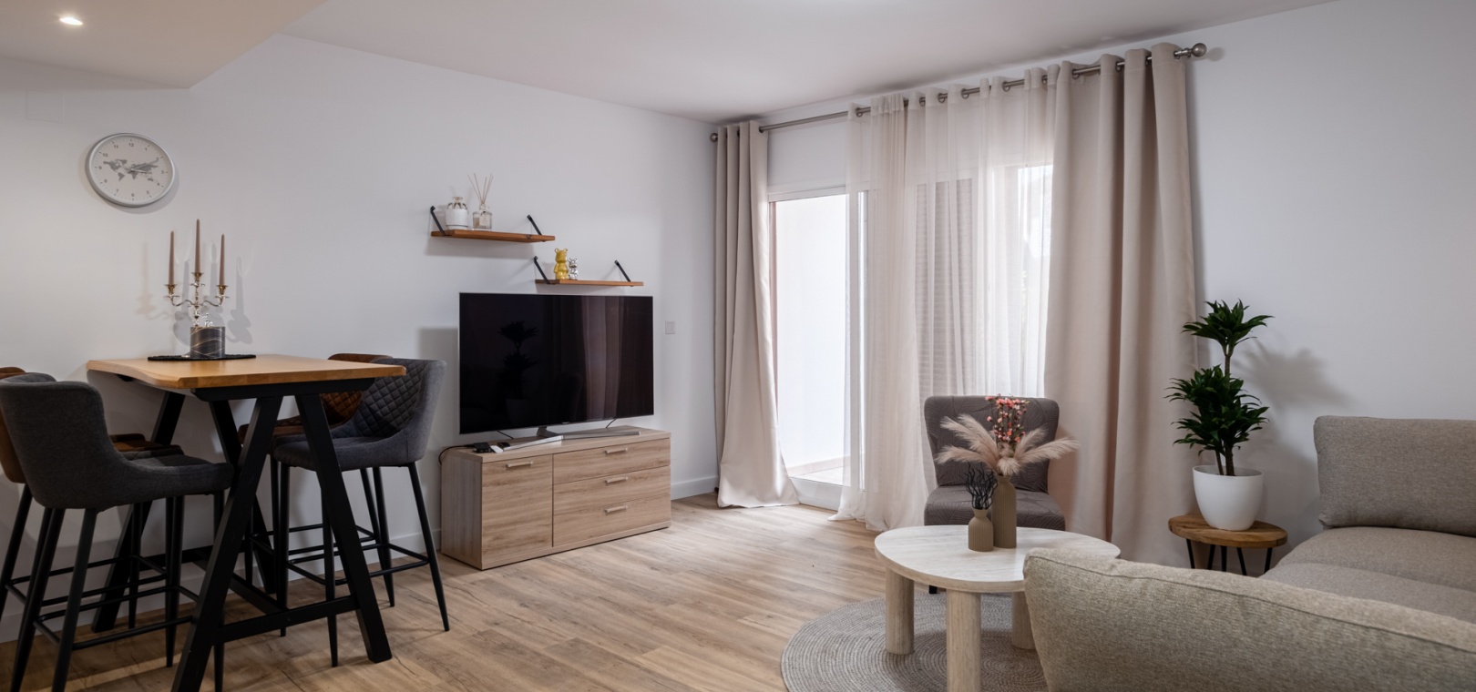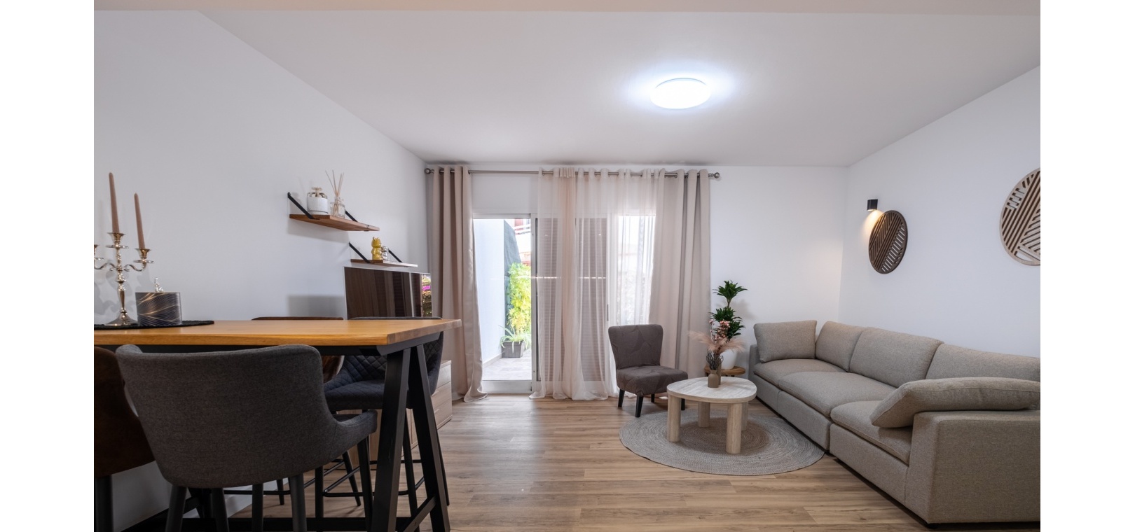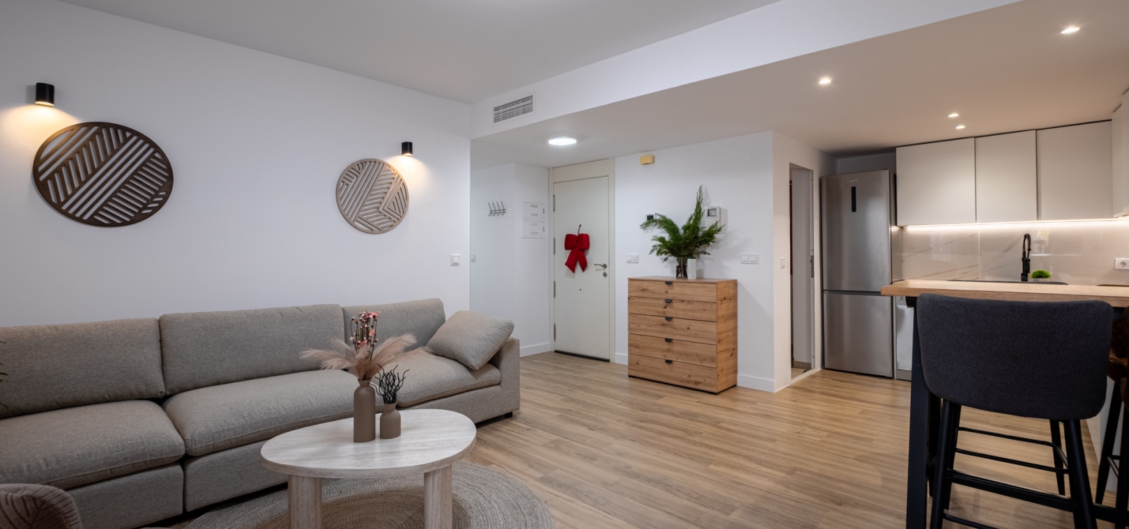 Élégant appartement de plain-pied entièrement rénové, offrant un agencement optimisé et des finitions haut de gamme. Le lumineux séjour/salle à manger ouvert comprend une cuisine moderne équipée d'appareils électroménagers neufs, dont un lave-vaisselle et un lave-linge : idéal pour un quotidien confortable et des réceptions réussies.