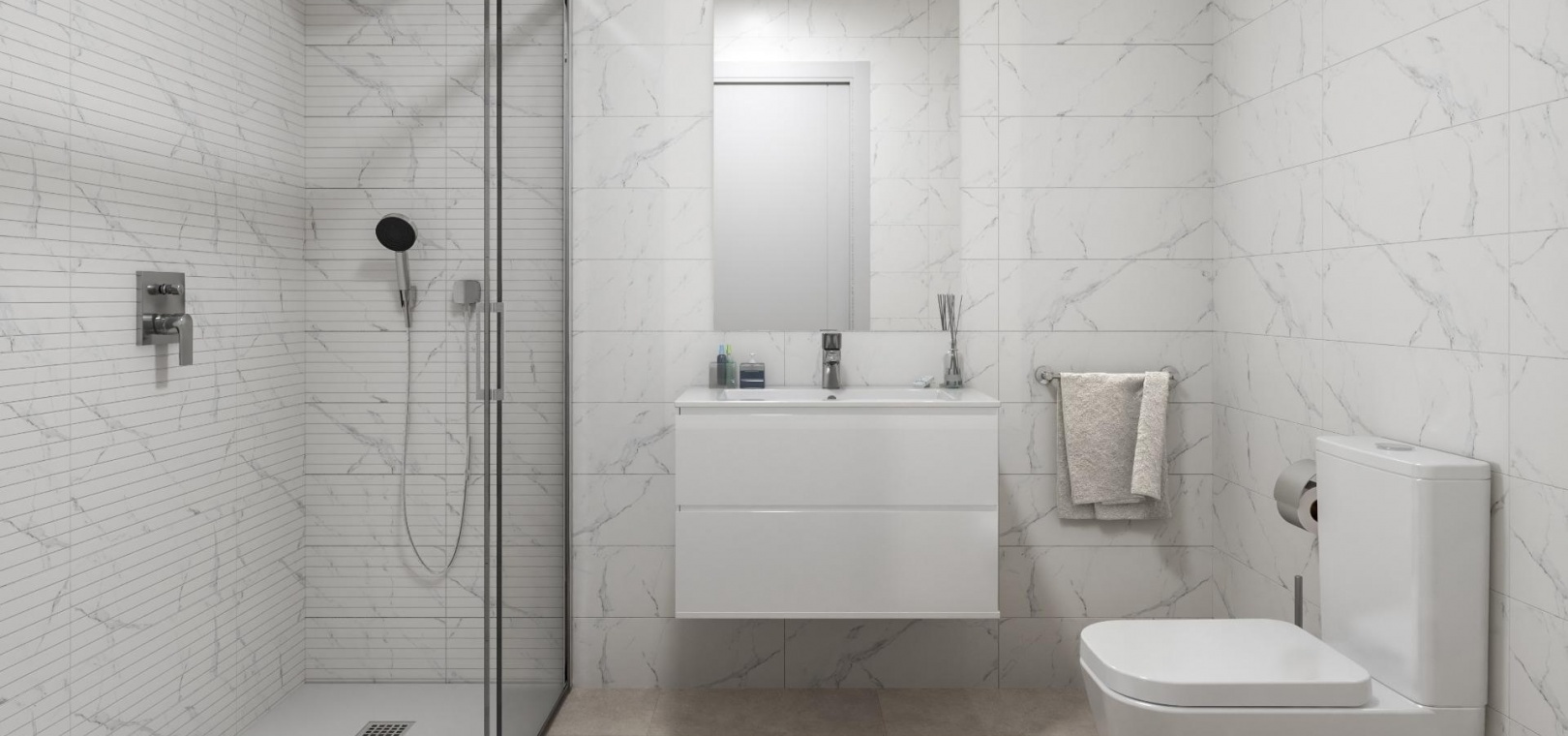 Salles de bains aux finitions modernes, avec sèche-serviettes, receveurs de douche avec parois en verre et meubles encastrés
