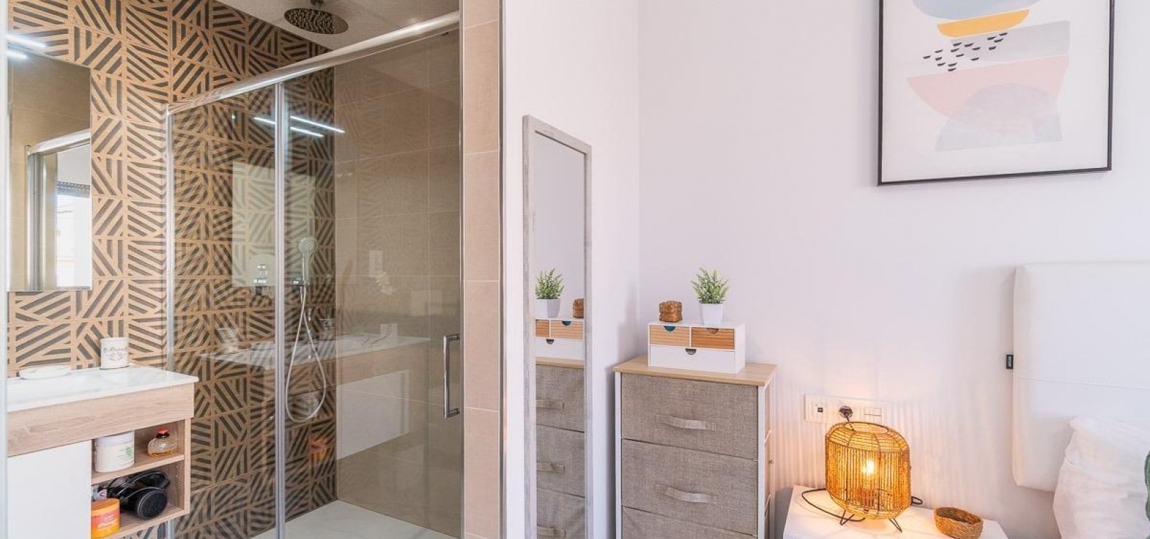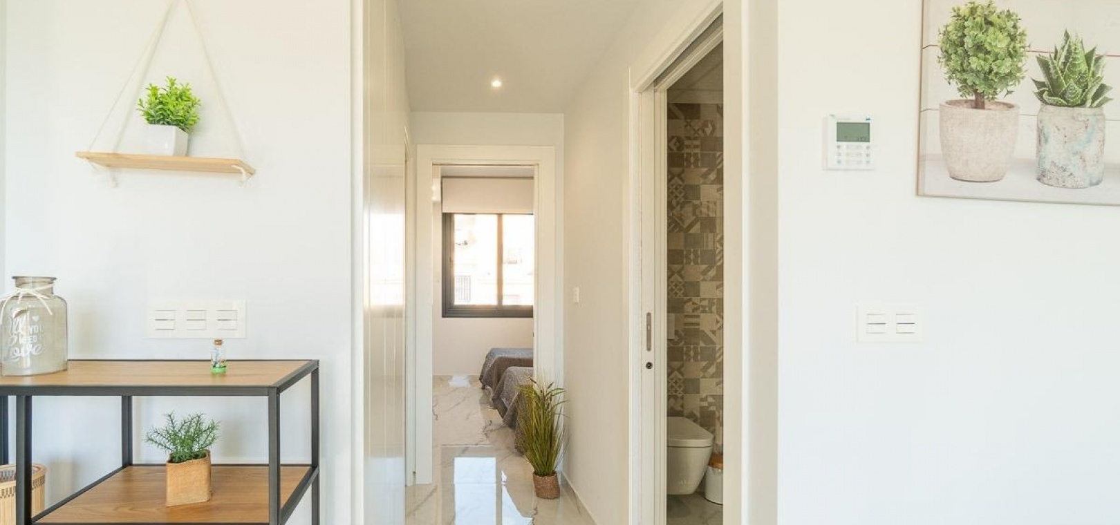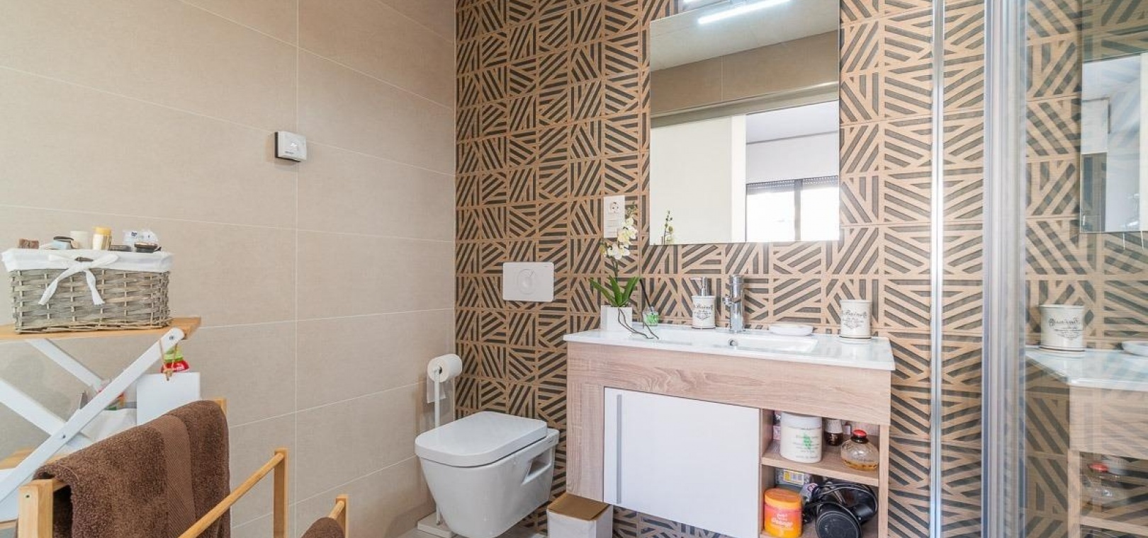 La propriété comprend deux grandes chambres doubles et deux salles de bains entièrement aménagées, toutes deux équipées d'un chauffage au sol pour plus de confort, ainsi qu'une buanderie séparée.
