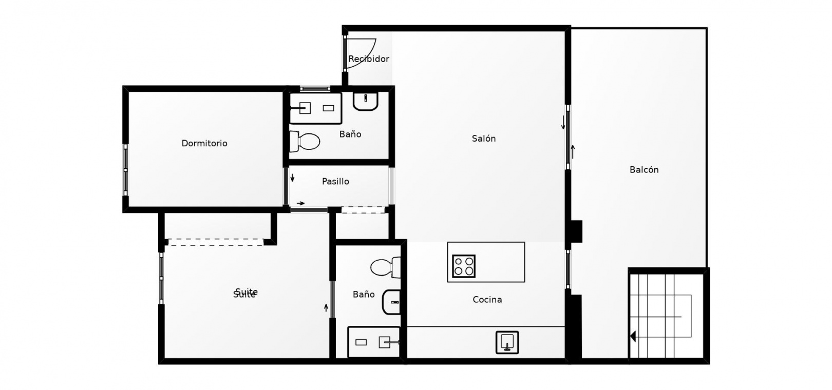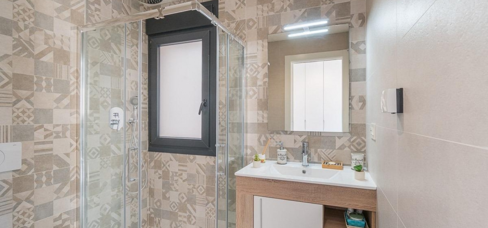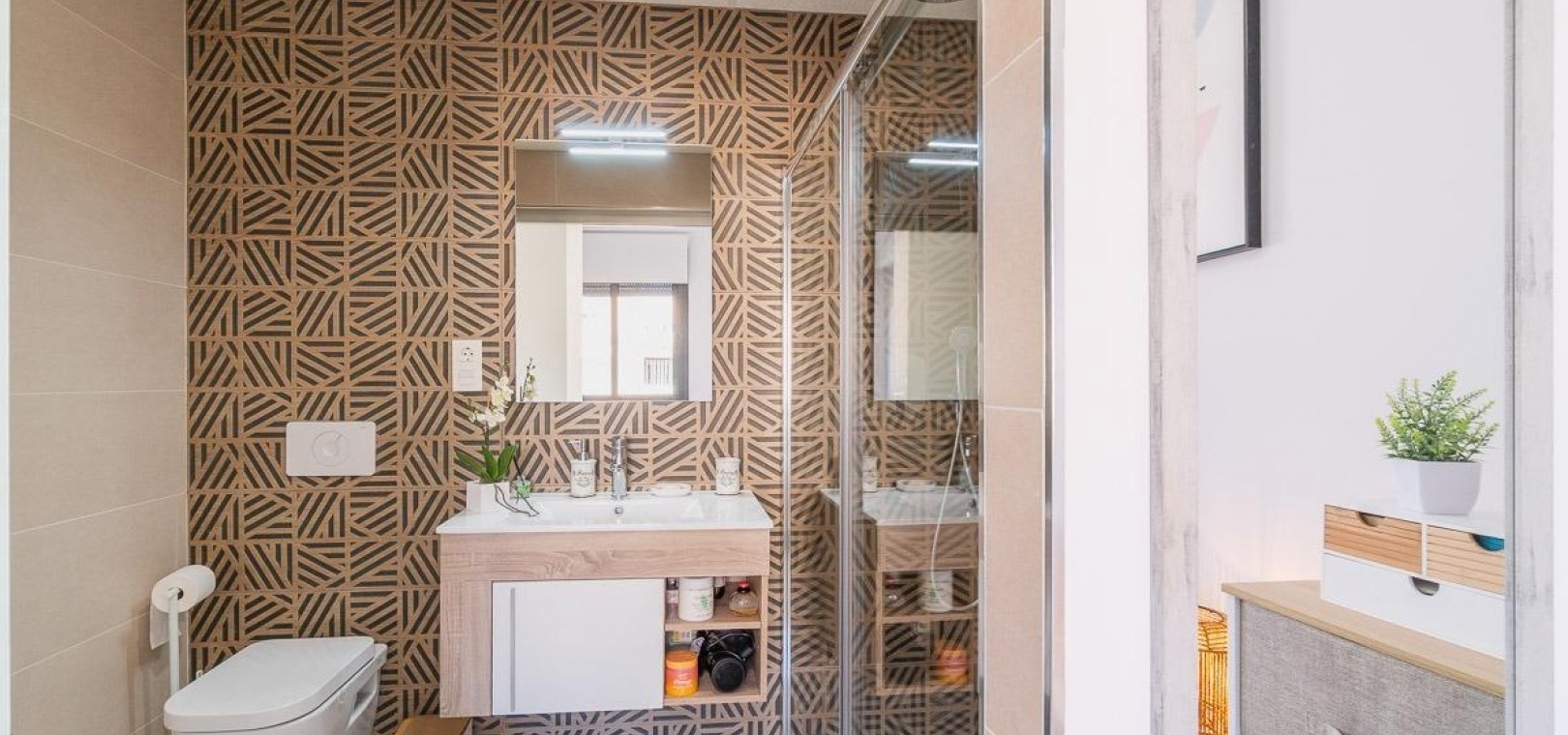 La propriété comprend deux grandes chambres doubles et deux salles de bains entièrement aménagées, toutes deux équipées d'un chauffage au sol pour plus de confort, ainsi qu'une buanderie séparée.