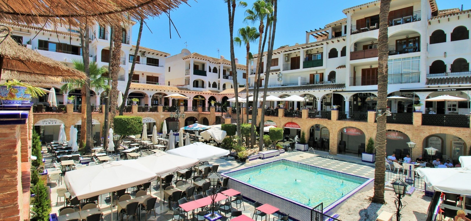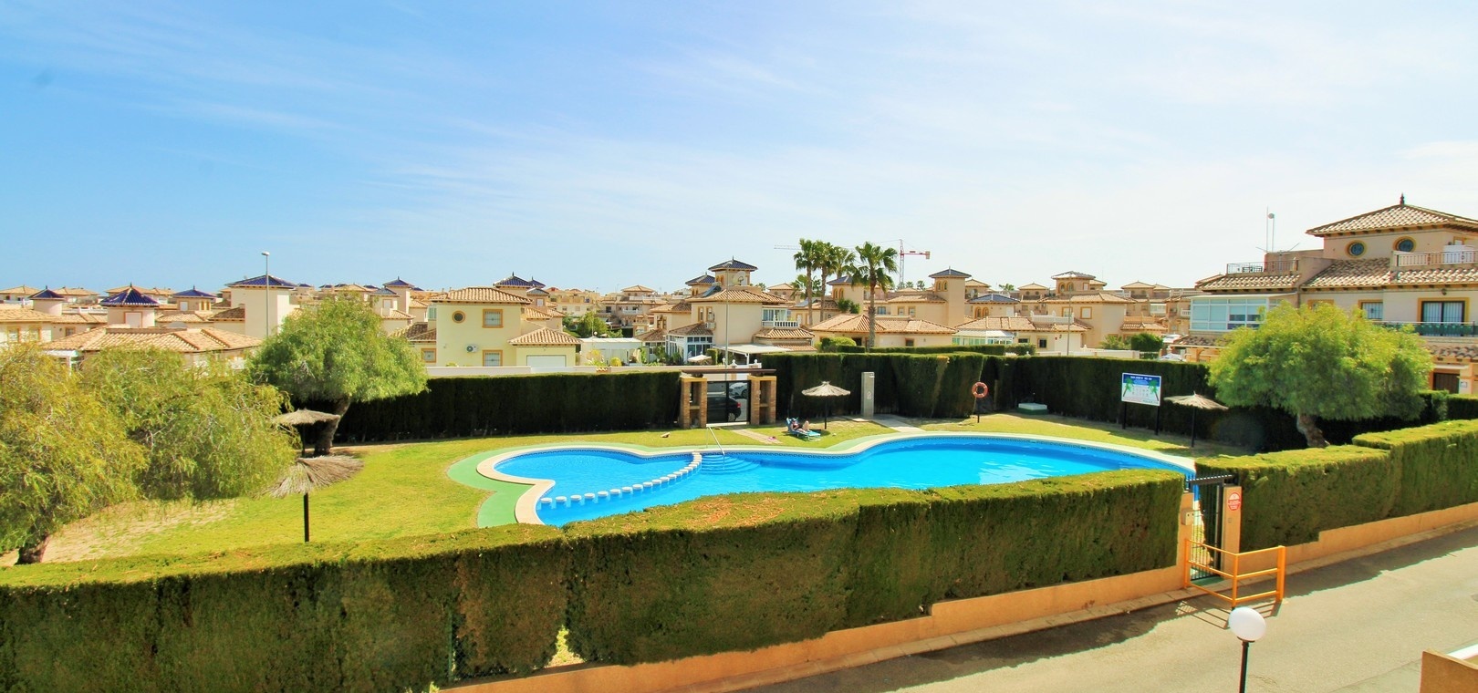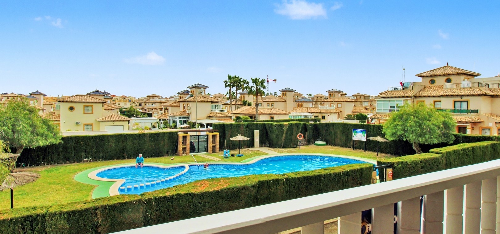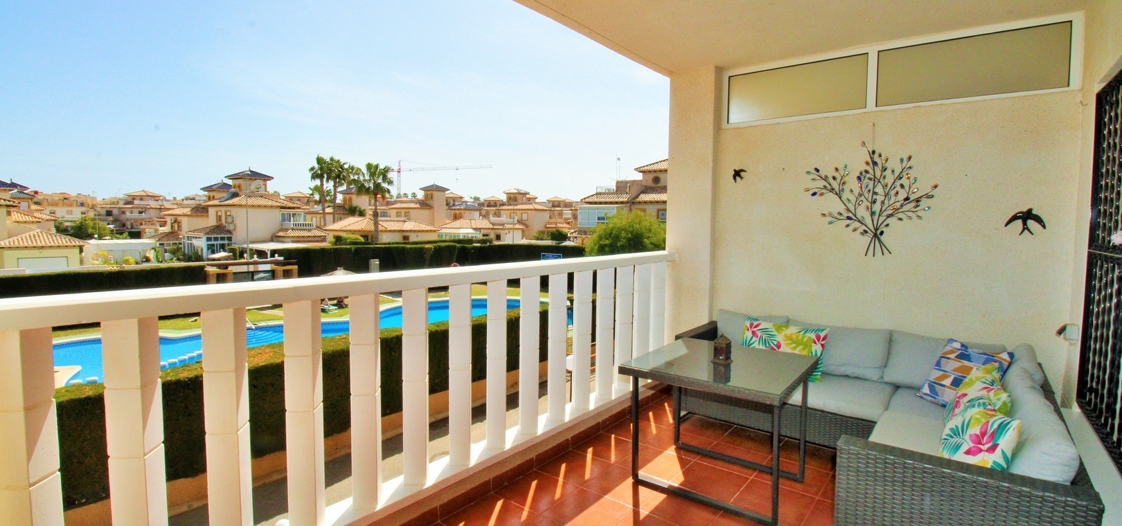 L'appartement dispose d'une terrasse couverte à l'avant offrant une vue dégagée agréable sur la piscine et les jardins, un endroit idéal pour se détendre et profiter du soleil toute la journée.