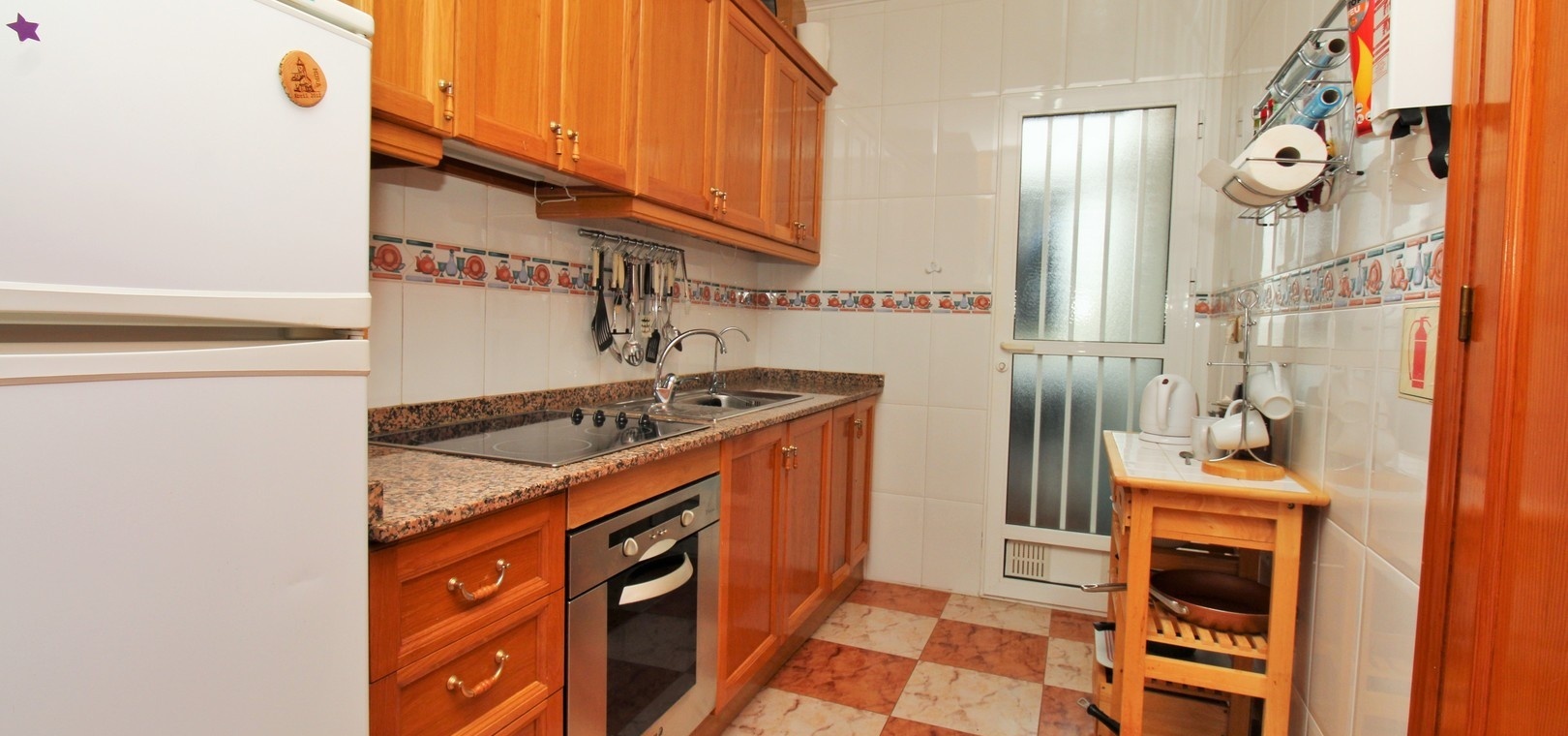 À l'intérieur, la propriété offre un salon-salle à manger lumineux et aéré, une cuisine séparée entièrement équipée avec une buanderie pratique, deux chambres doubles spacieuses avec placards intégrés et une salle de bains moderne avec douche à l'italienne.