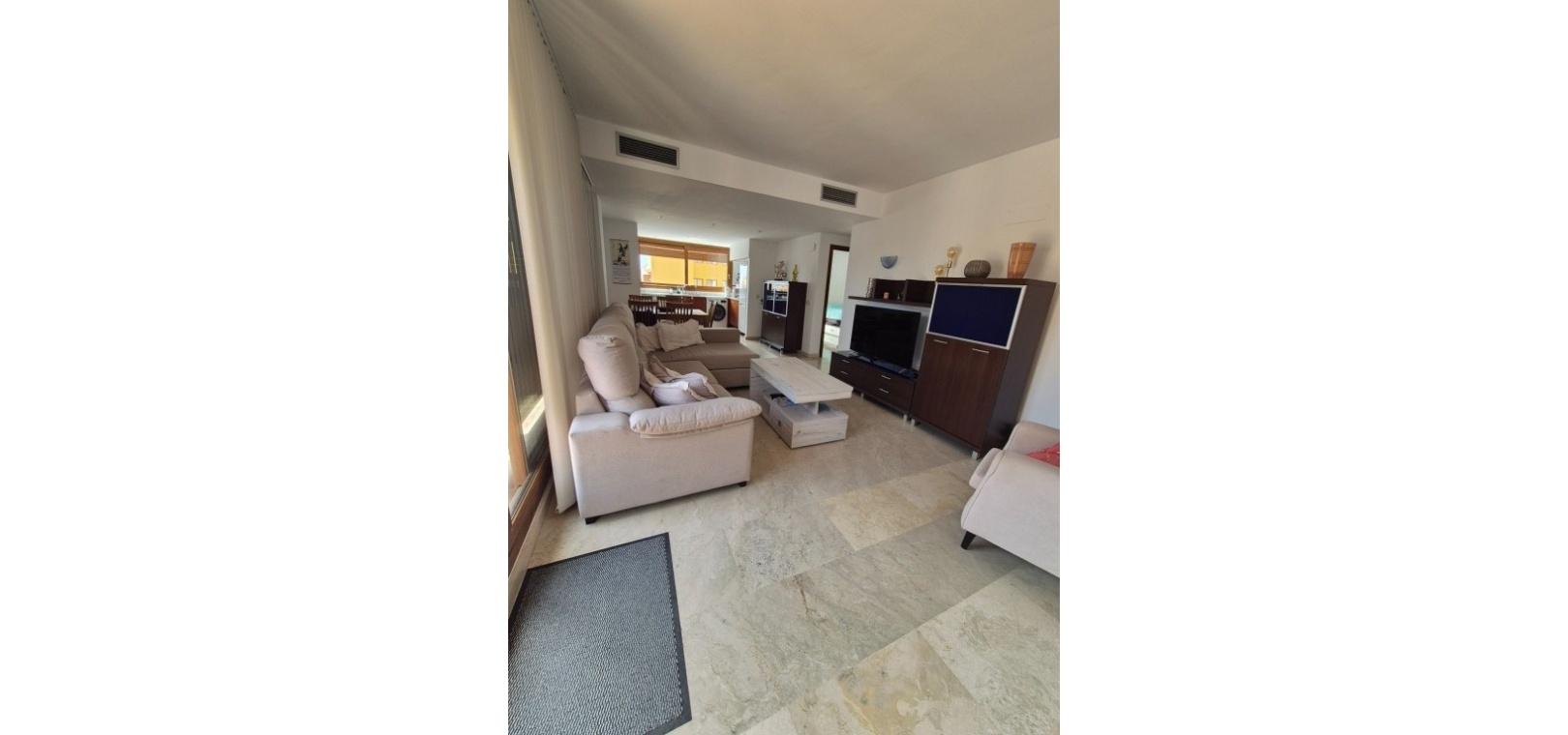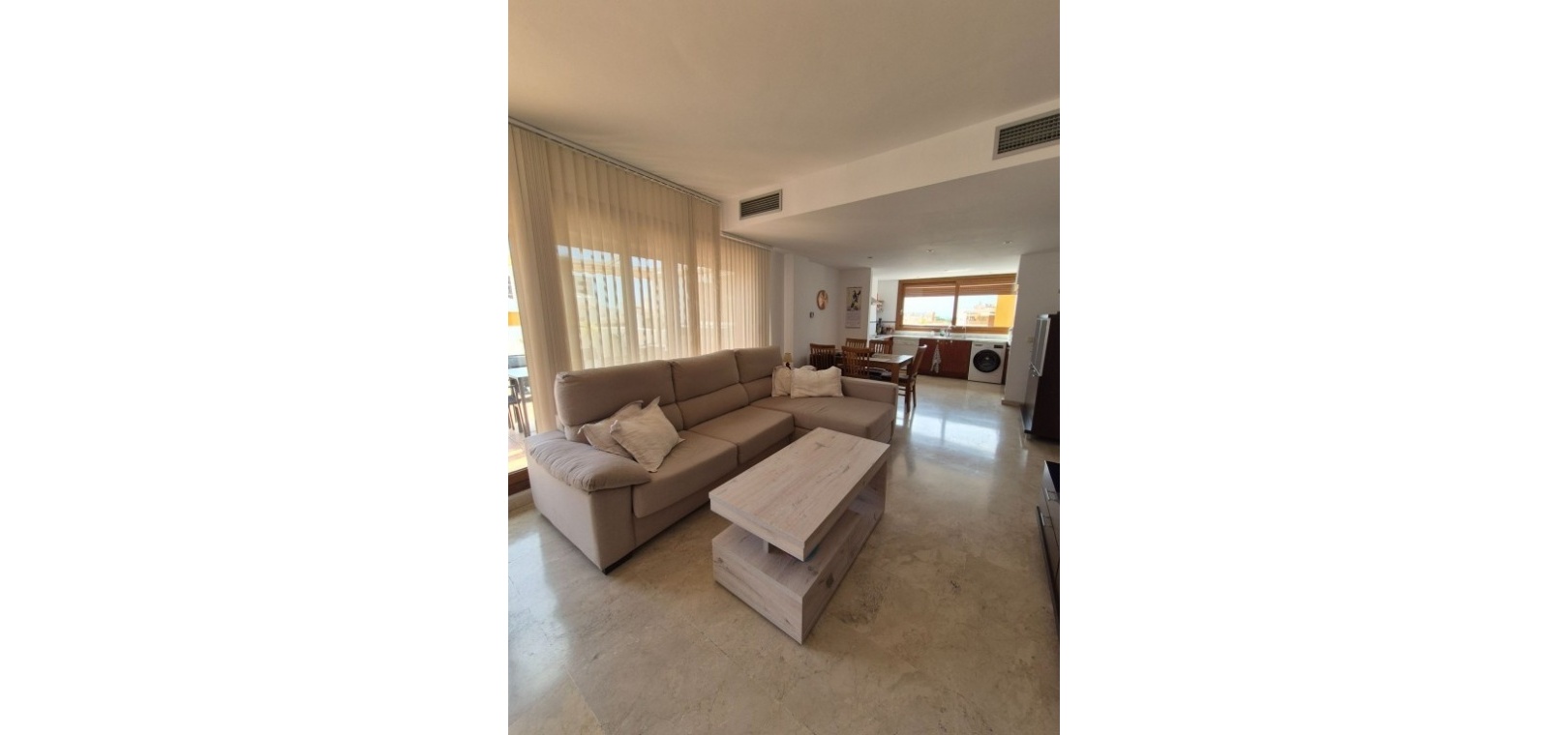 D'une surface habitable d'environ 85 m², ce bien offre une distribution lumineuse et harmonieuse. La pièce de vie principale combine un salon et une salle à manger élégants avec une cuisine américaine contemporaine, entièrement équipée d'électroménagers intégrés haut de gamme. De larges fenêtres laissent entrer une abondante lumière naturelle, accentuant la sensation d'espace.