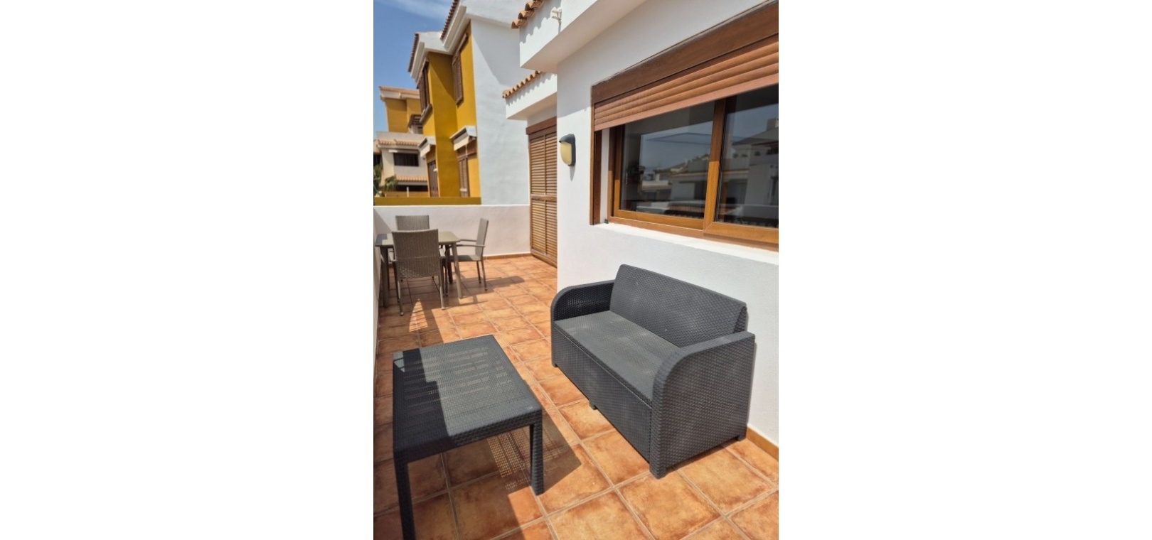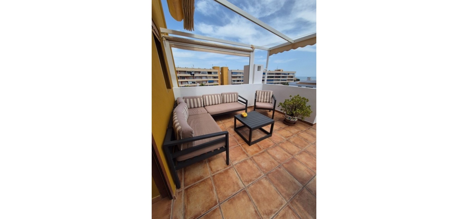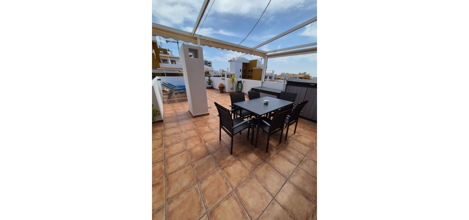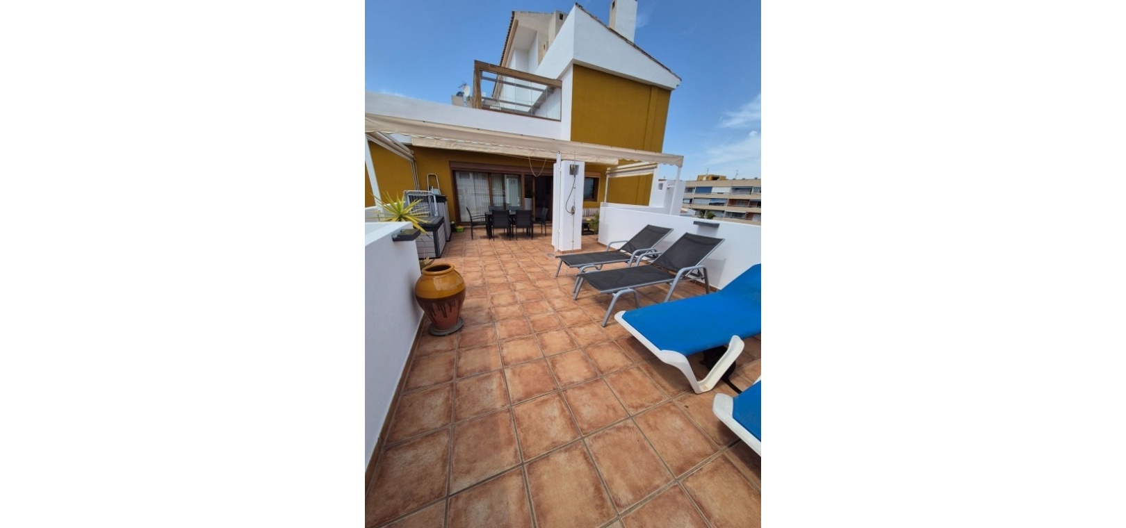 La vie en plein air est un atout majeur de cette maison. Une terrasse de 15 m² orientée sud-ouest offre une vue imprenable sur les jardins paysagers, les piscines communes et la mer. De plus, un solarium privatif sur le toit d'environ 35 m² propose un espace extérieur entièrement équipé avec salon de jardin, transats, parasols et coin repas – idéal pour profiter du climat en toute saison.