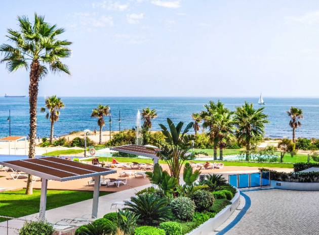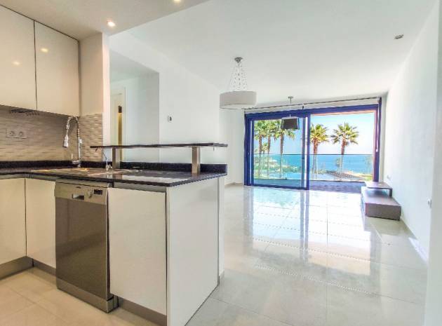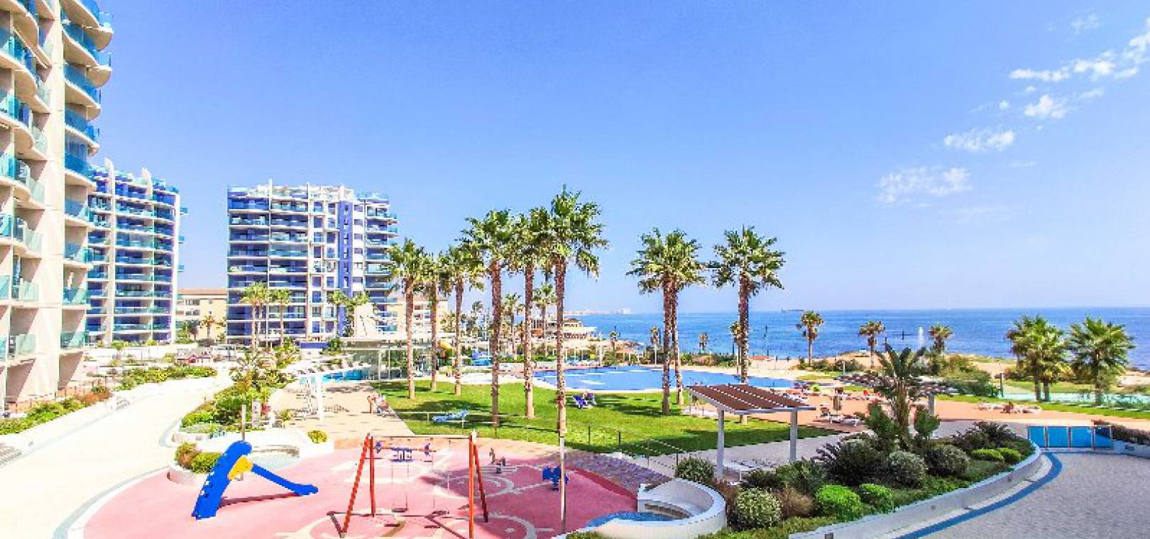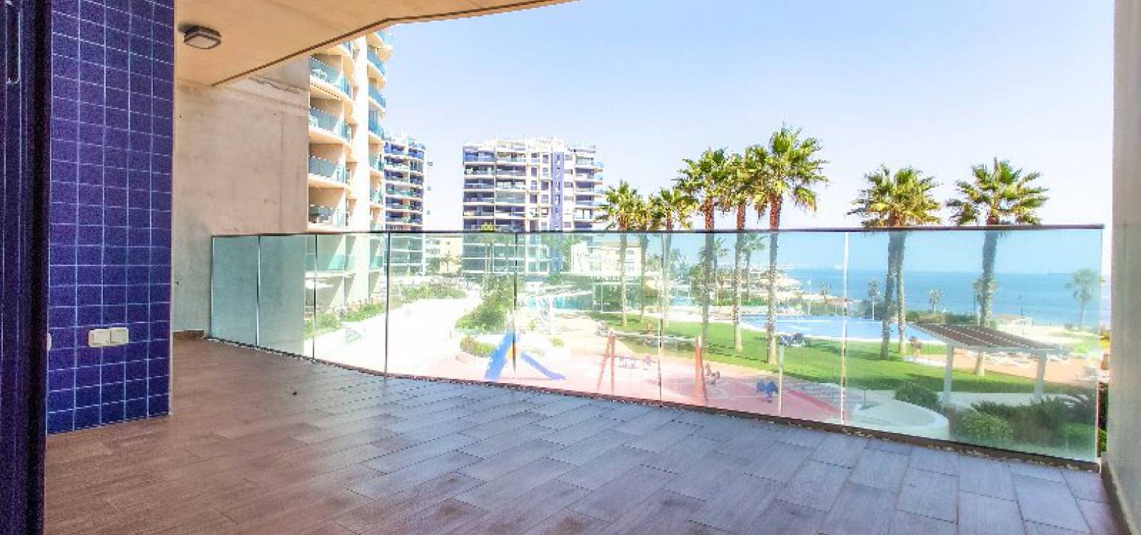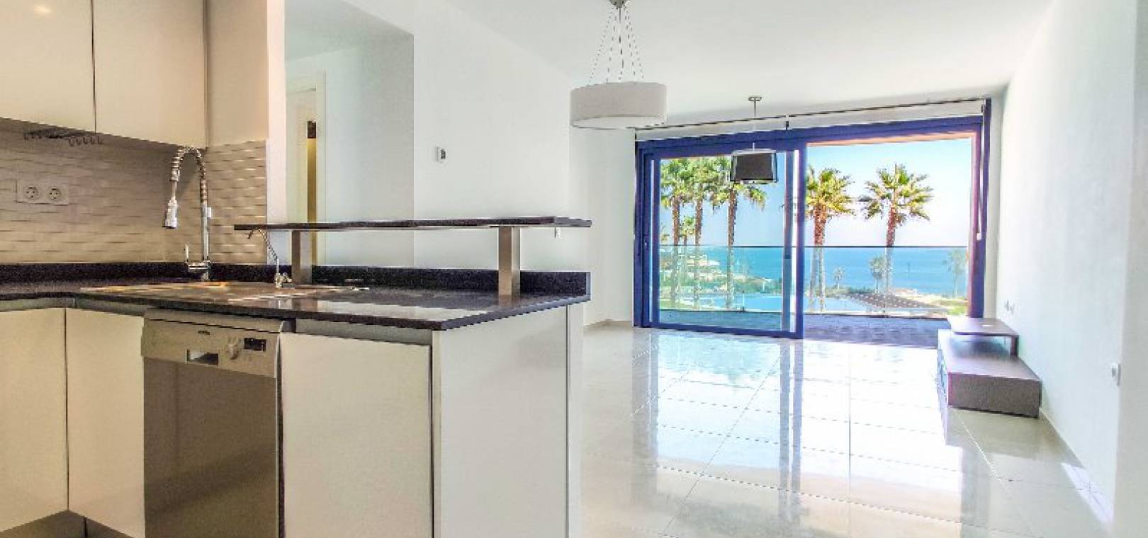 Un appartement avec 2 chambres et 2 salles de bains en première ligne avec vue sur la mer et vue sur la mer situé à Res. Sea Senses, Punta Prima, Costa Blanca.