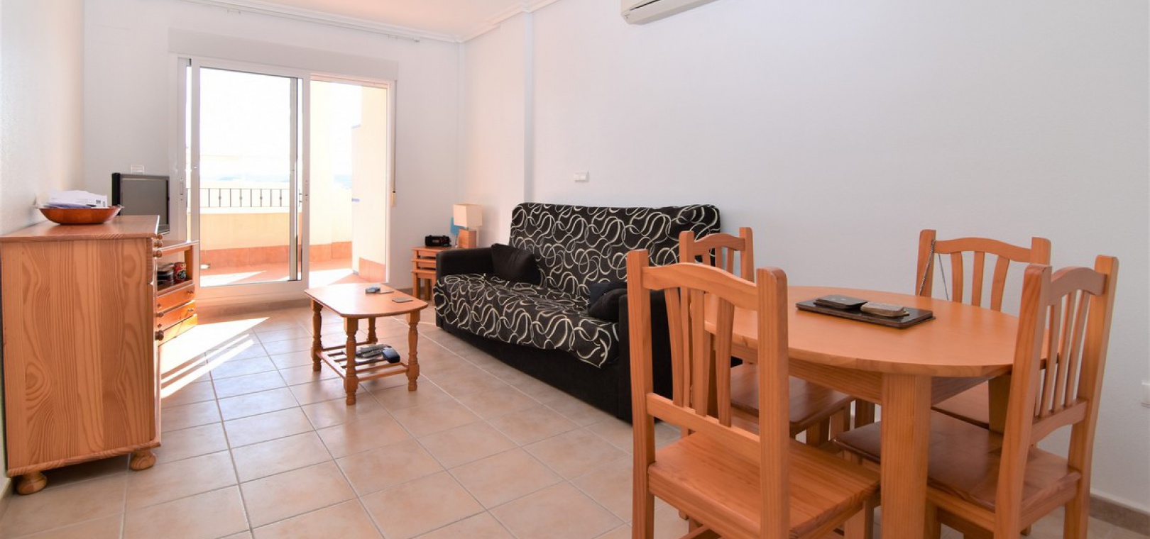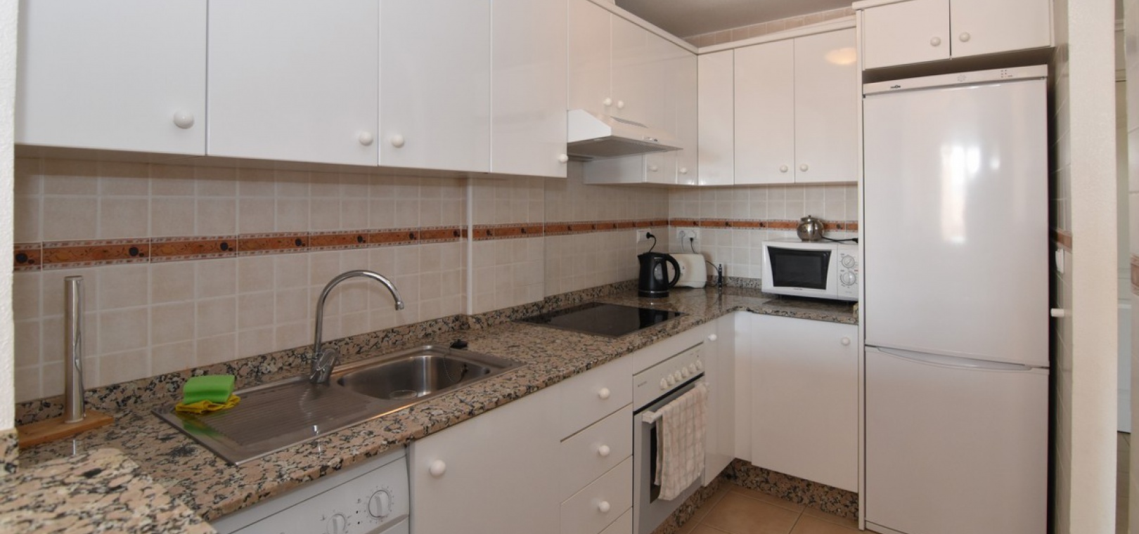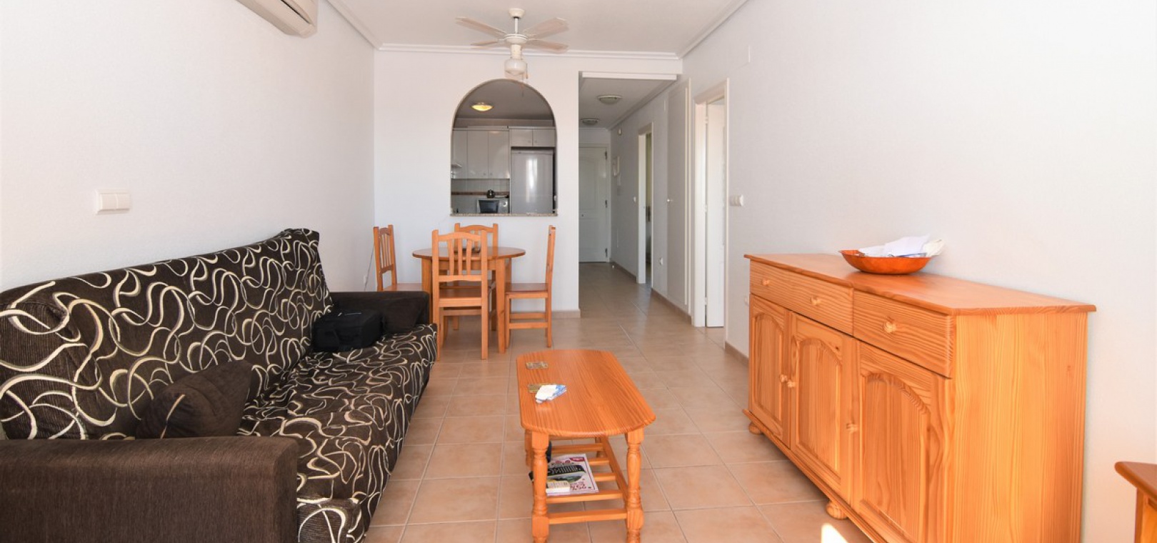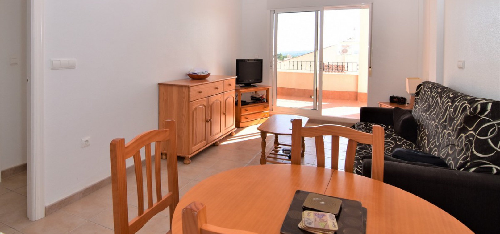 Woon / eetkamer met warme en koude airconditioning en een plafondventilator, open volledig ingerichte keuken met achtertuin en een wasruimte en berging, 1 x slaapkamer met inbouwkasten, 1 slaapkamer met twee eenpersoonsbedden met inbouwkasten, 1 x familie badkamer, 1 x doucheruimte, groot privé dakterras solarium, volledig betegelde voortuin met een oprit voor off-road parking en het pand heeft toegang tot een gemeenschappelijk zwembad.