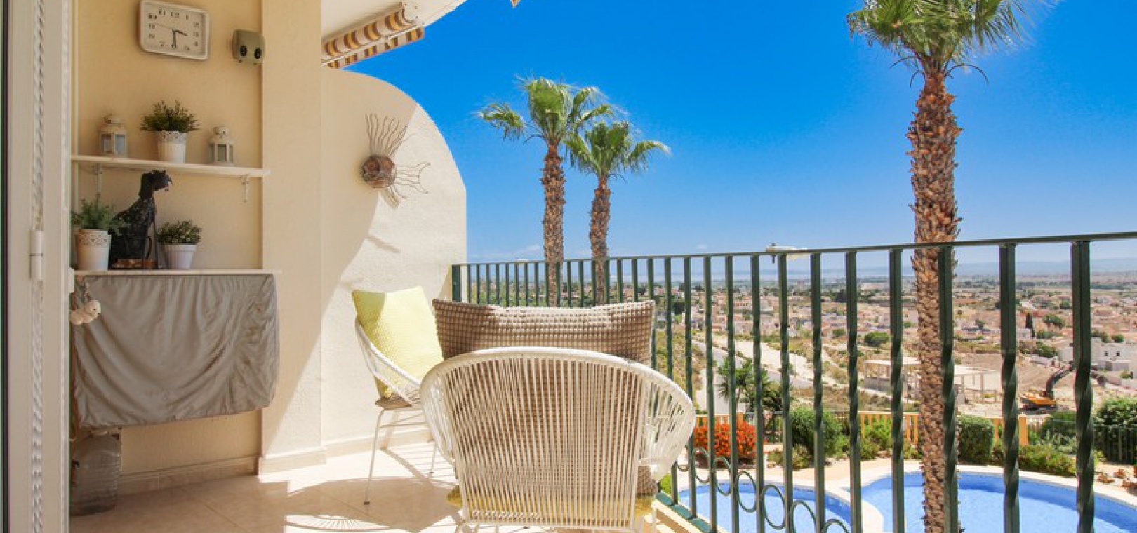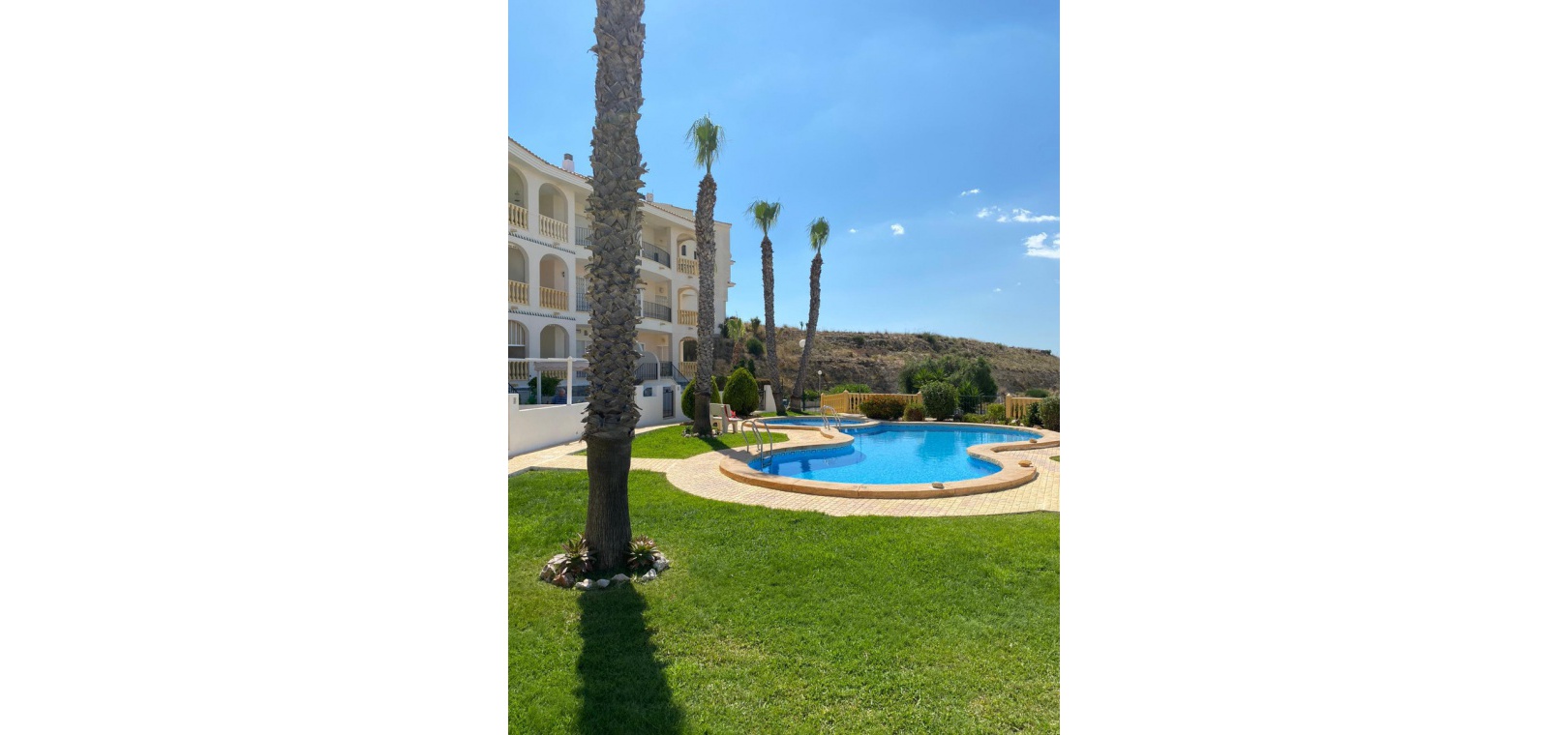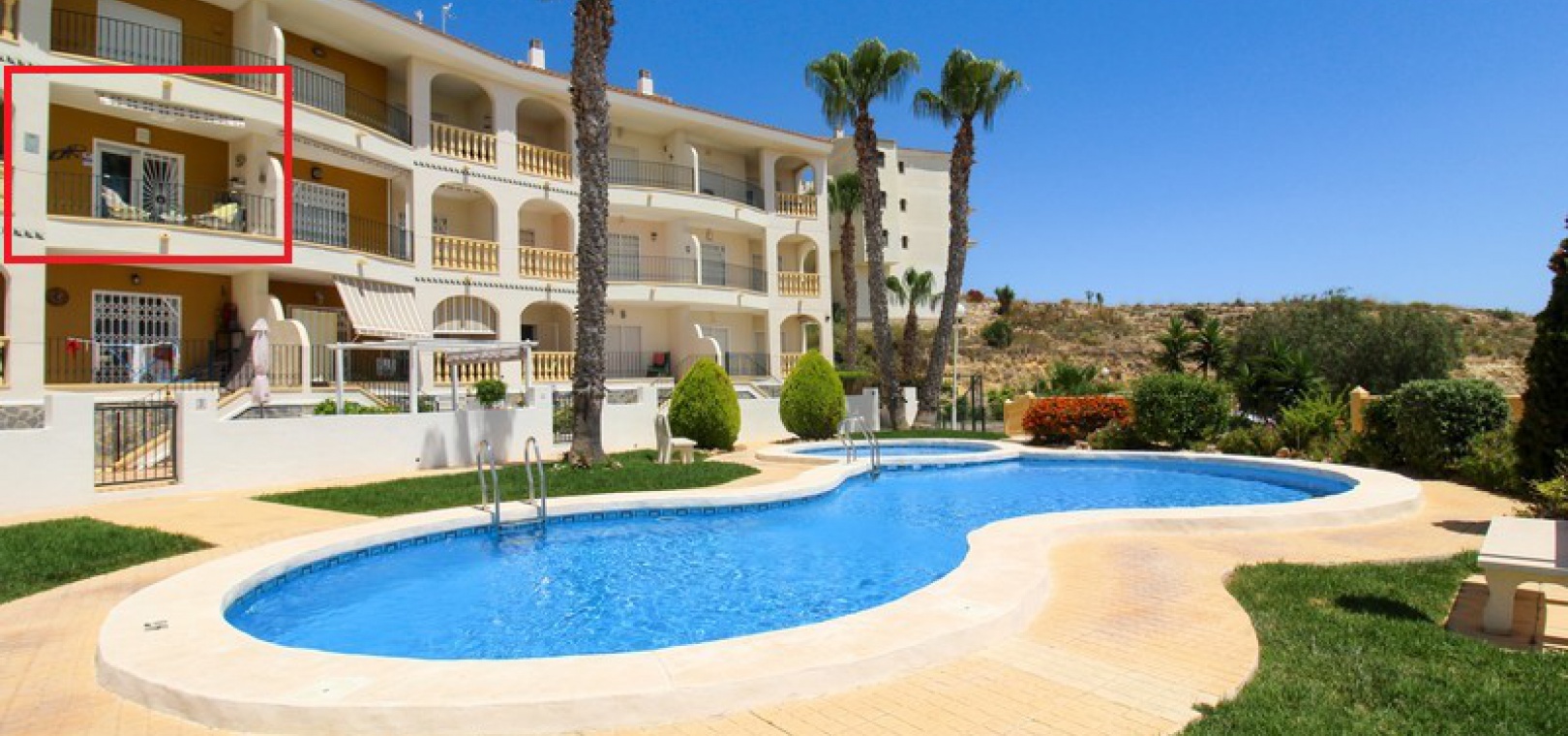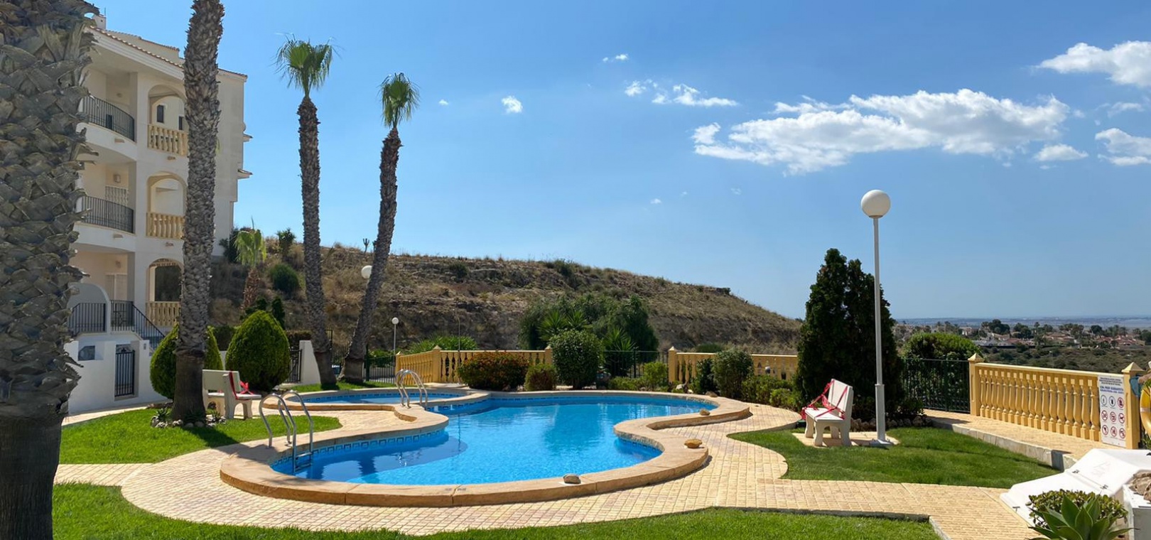 Een op het westen gelegen appartement met 2 slaapkamers en 1 badkamer op de bovenste verdieping met uitzicht op het gemeenschappelijke zwembad in Res.Buena Vista, Ciudad Quesada, Costa Blanca.