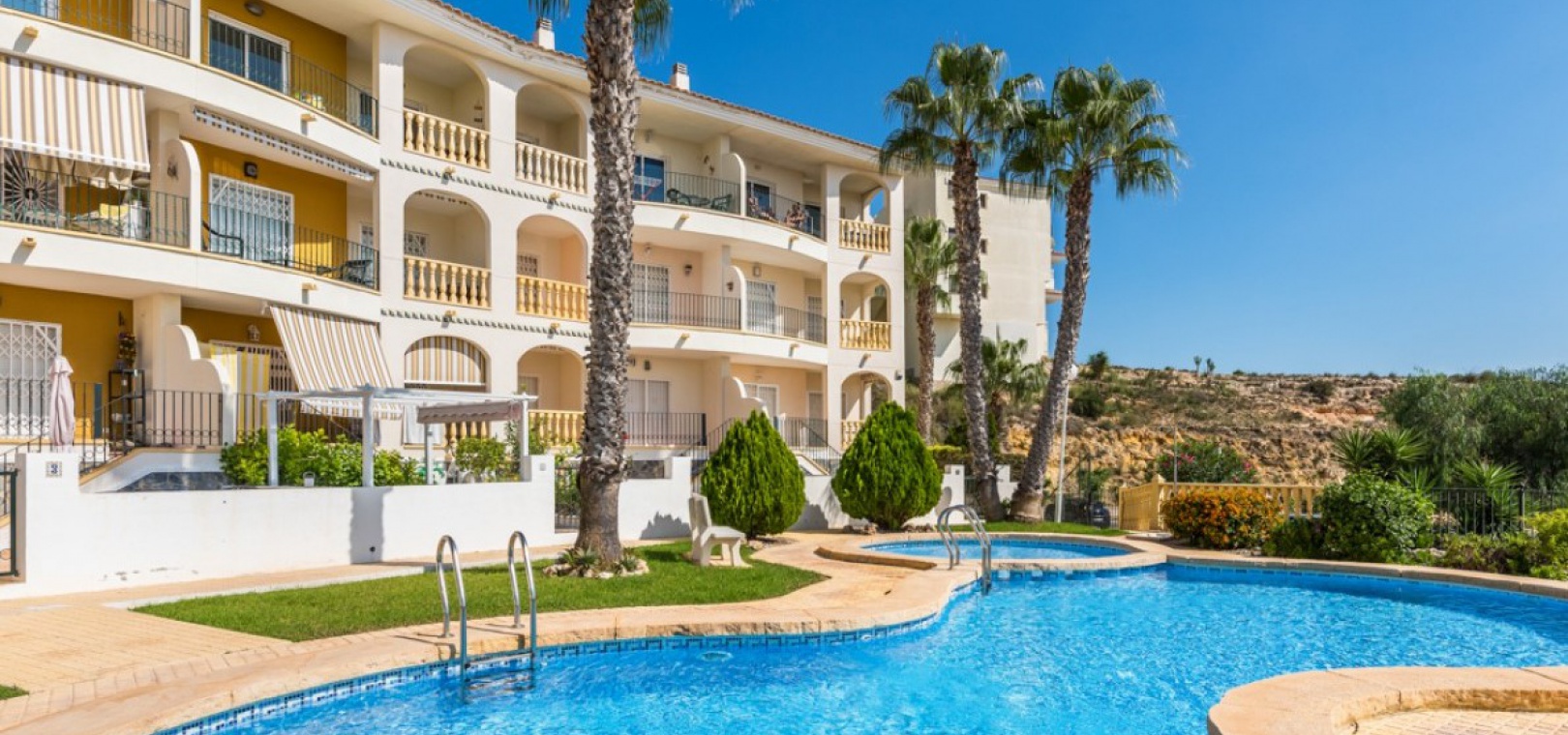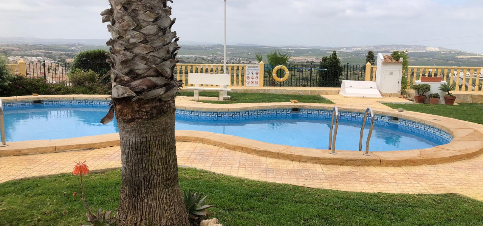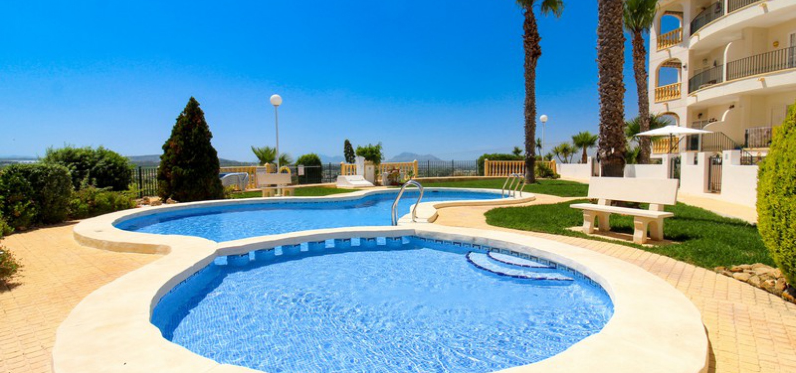 Een op het westen gelegen appartement met 2 slaapkamers en 1 badkamer op de bovenste verdieping met uitzicht op het gemeenschappelijke zwembad in Res.Buena Vista, Ciudad Quesada, Costa Blanca.
