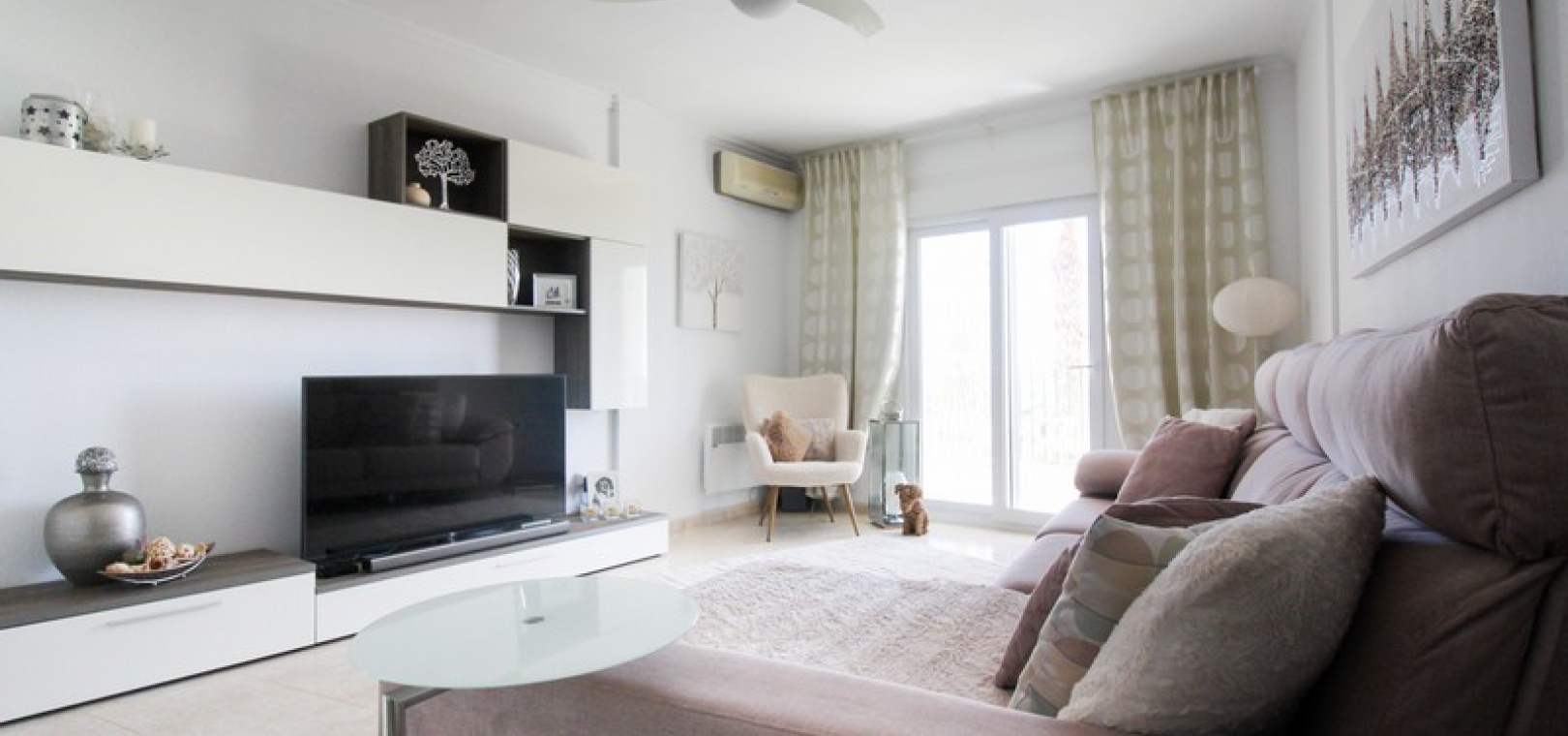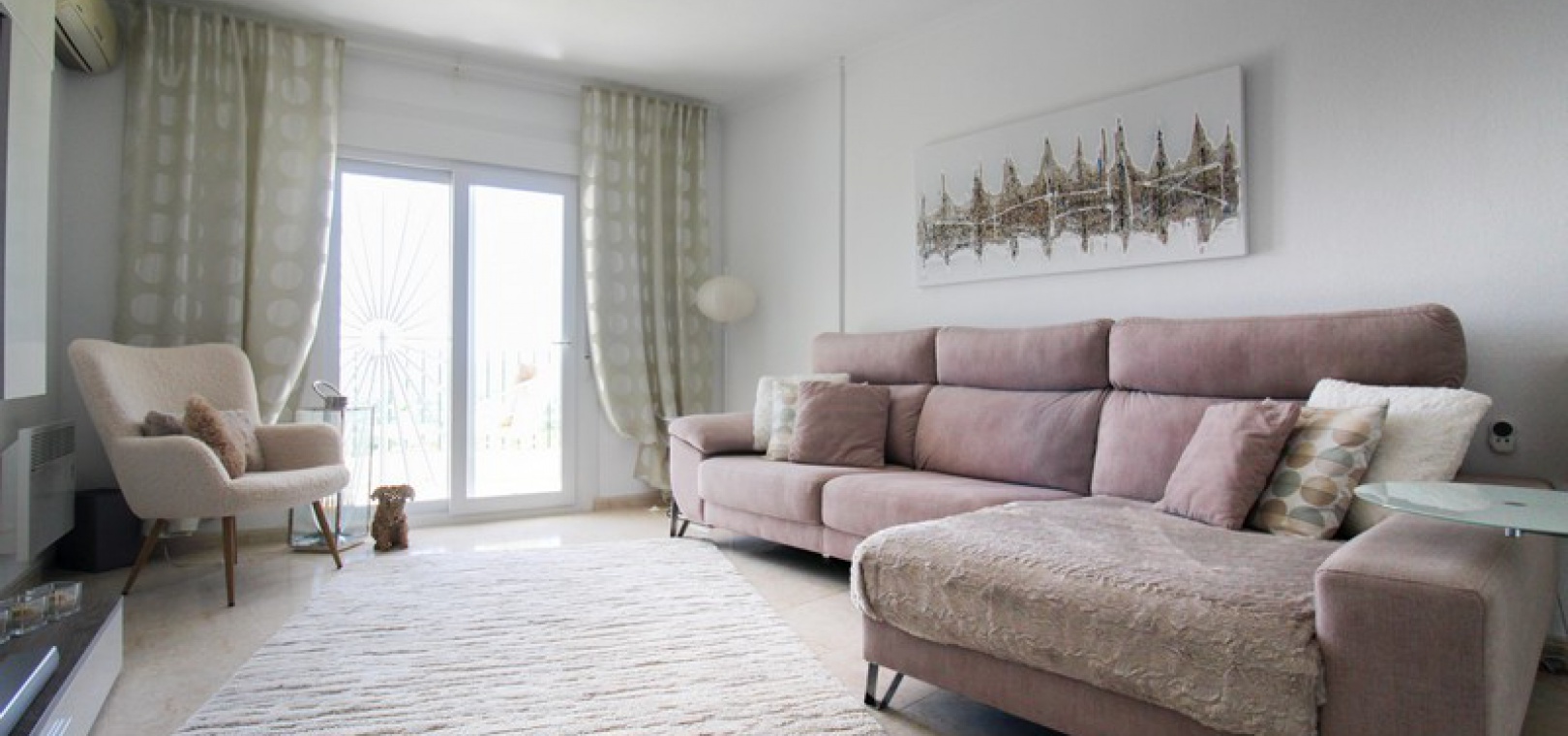 Lounge / eetkamer met warme en koude airconditioning en een plafondventilator, aparte volledig ingerichte keuken, aparte bijkeuken, 2 x tweepersoonsslaapkamers beide met inbouwkasten, vanuit de woonkamer en grote slaapkamer zijn er deuren naar het balkon dat uitkijkt op de gemeenschappelijke zwembad en een prachtig uitzicht op de bergen en de omgeving.