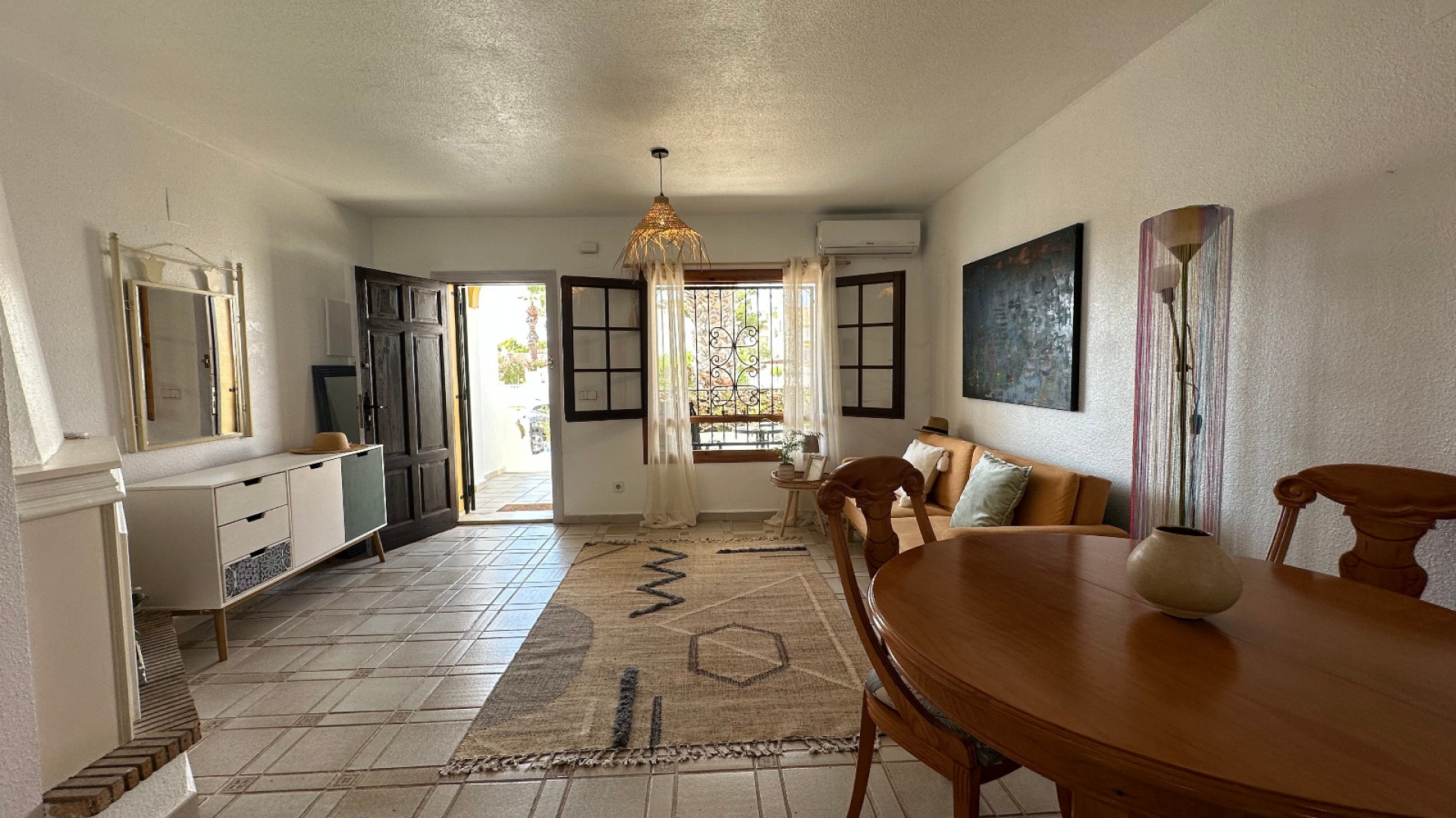 Een op het zuiden gelegen herenhuis met 2 slaapkamers en 1,5 badkamers in Sofia-stijl met een eigen solarium op het dak met uitzicht op het gemeenschappelijke zwembad in Valencia, Villamartin, Costa Blanca.