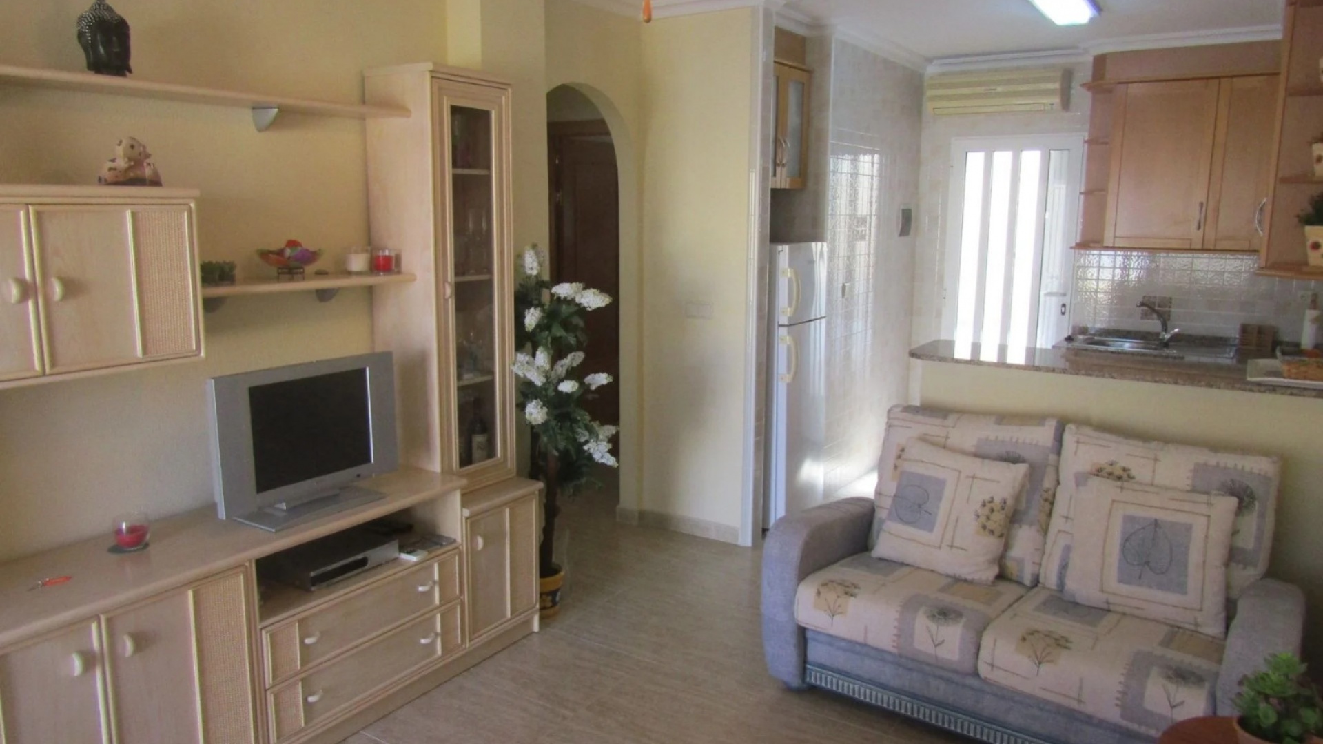 Een bungalow met 2 slaapkamers en 1 badkamer en een privésolarium op het dak gelegen in Arco de Mediterraneo, Montemar, Algorfa, Costa Blanca.