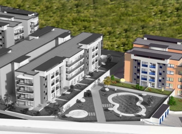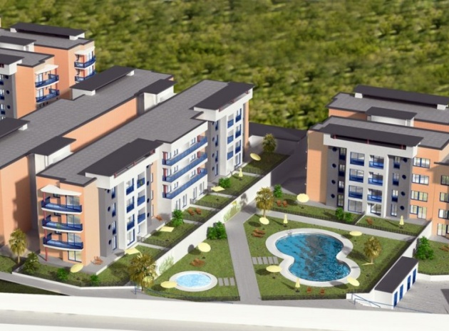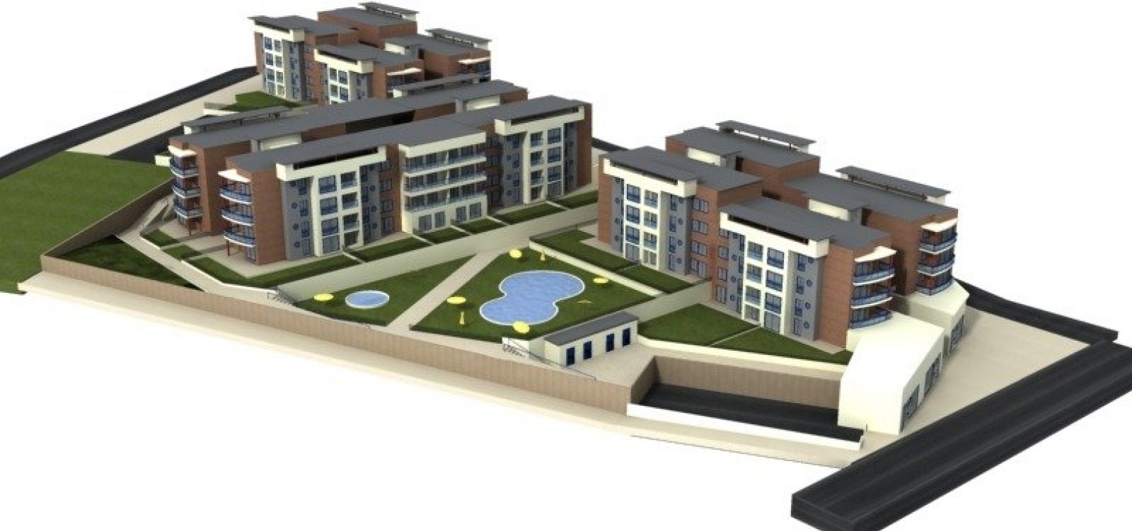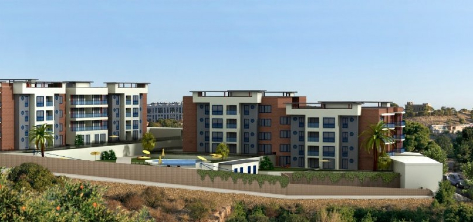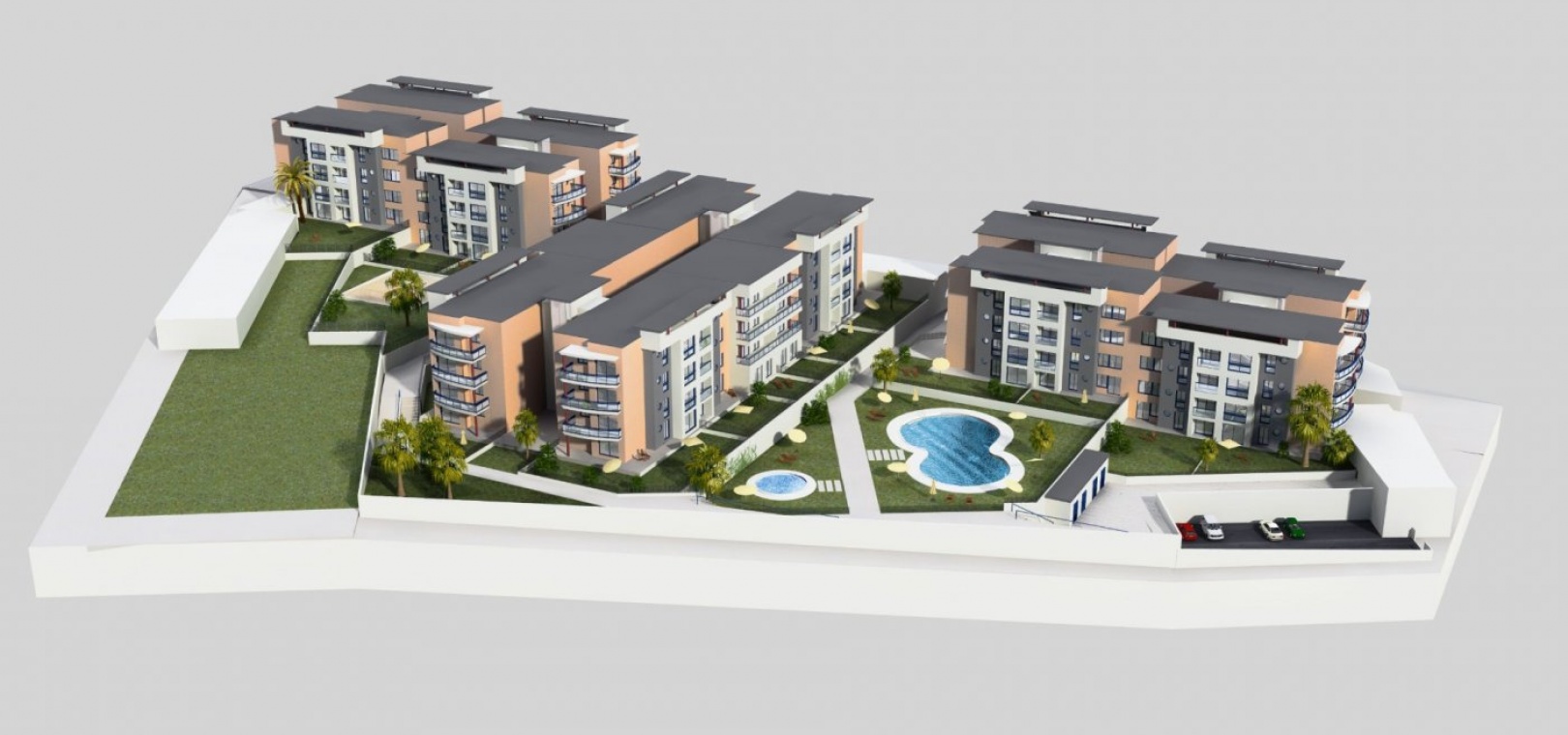 Nieuwbouw residentieel complex van 32 appartementen met 2 en 3 slaapkamers, terrassen, garages en bergingen, gemeenschappelijke ruimte met zwembad.