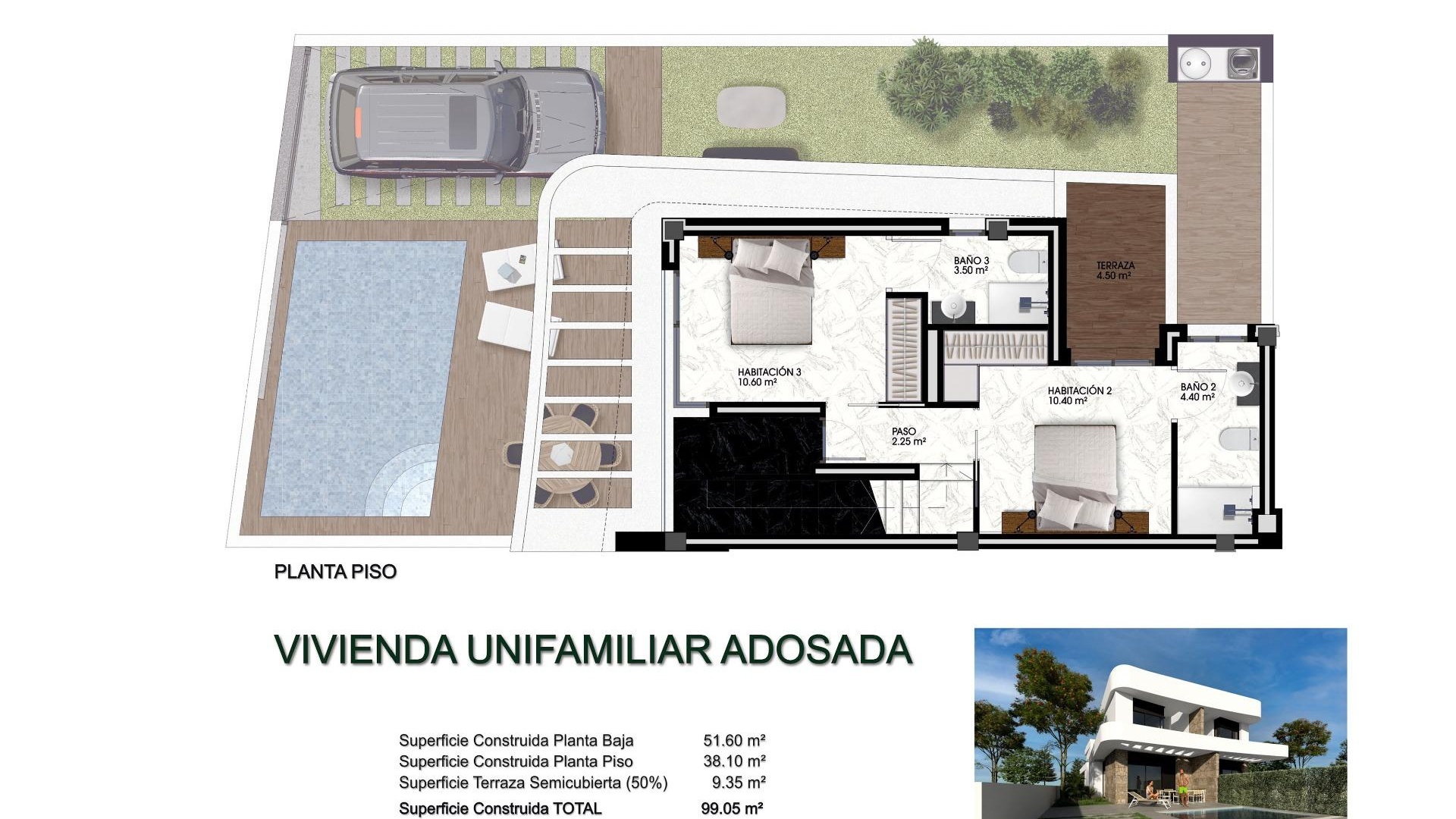 Dit project heeft 32 semi-vrijstaande villa's op twee verdiepingen met ongeveer 150m2 grond, geleverd met de beste apparatuur, waaronder solarium, badschermen, tuin afgewerkt met kunstgras van de beste kwaliteit decoratieve tuinelementen, en pre-installatie voor zonnepanelen, stopcontact en poortmotor voor voertuigen.