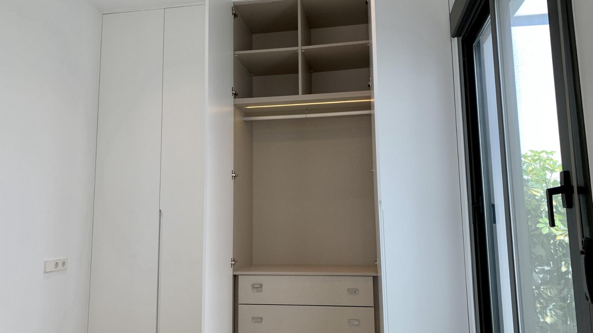 Volledig ingerichte keuken in wit glans of houtkleur. Technologisch kwarts. Roestvrij stalen gootsteen. Inductiekookplaat met geïntegreerde afzuigkap, oven, magnetron, wasmachine, geïntegreerde koelkast, geïntegreerde vaatwasser.