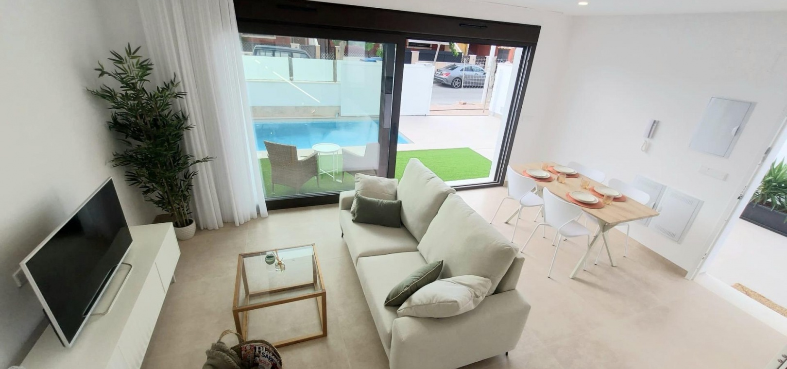 Vanuit de woonkamer heeft u directe toegang tot het terras en het zwembad.