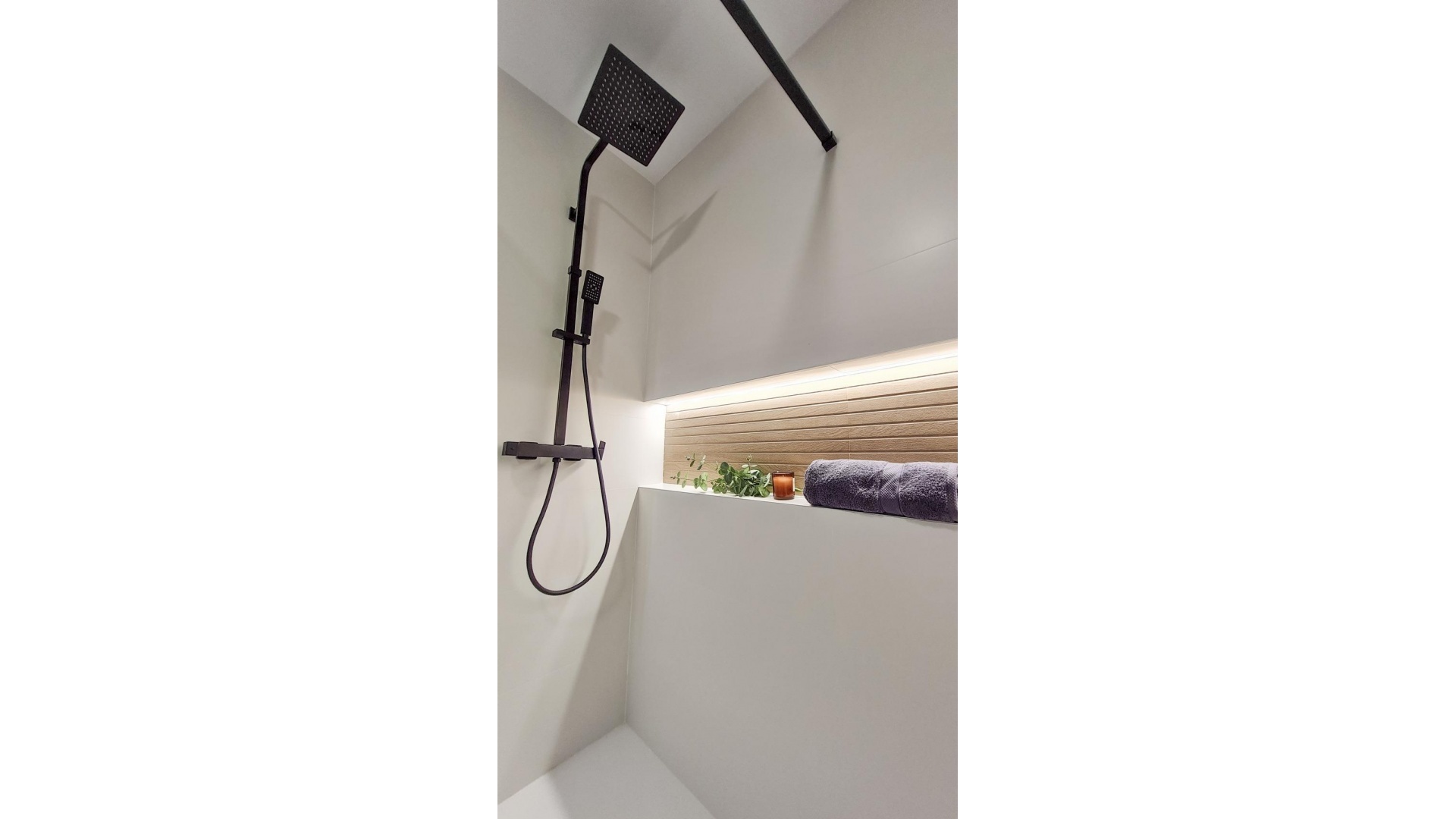 Complete badkamers met wastafelmeubel, hangend toilet met inbouwreservoir, spiegel, regendouche en schermen.