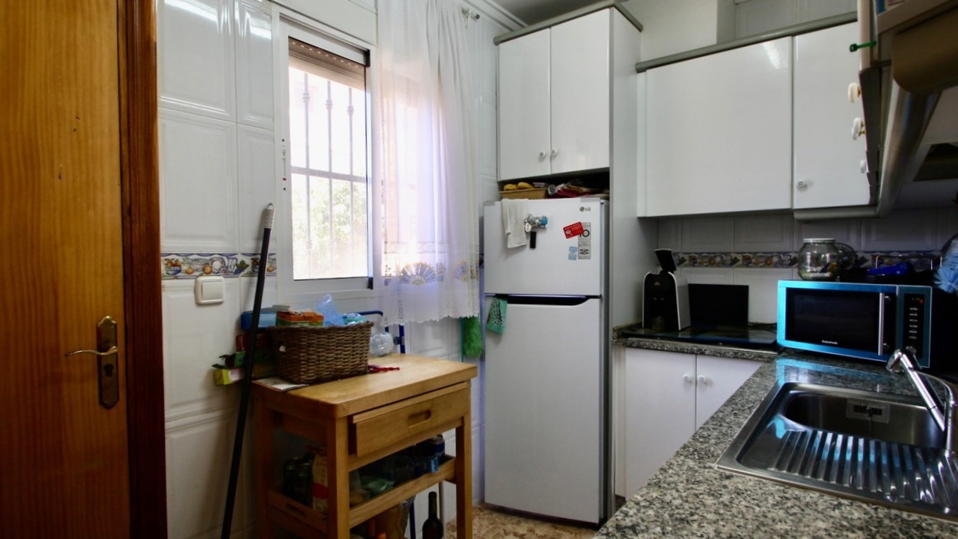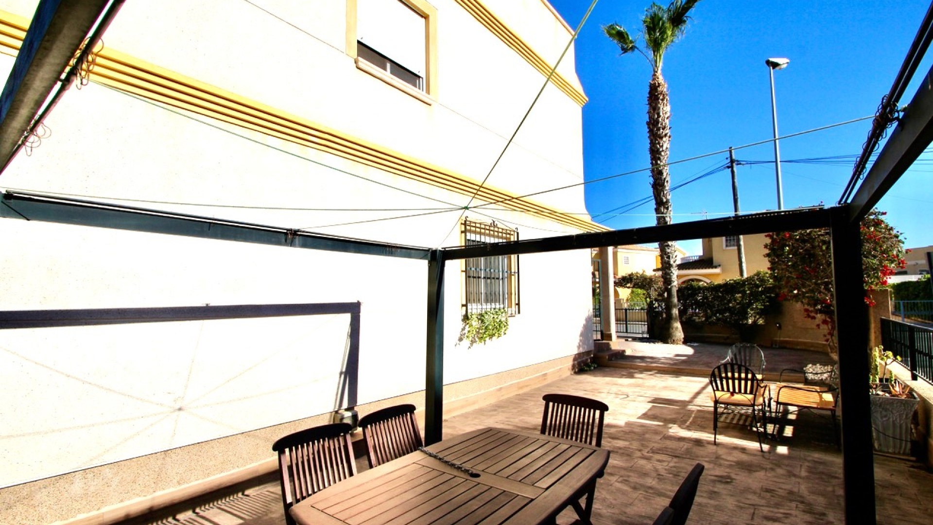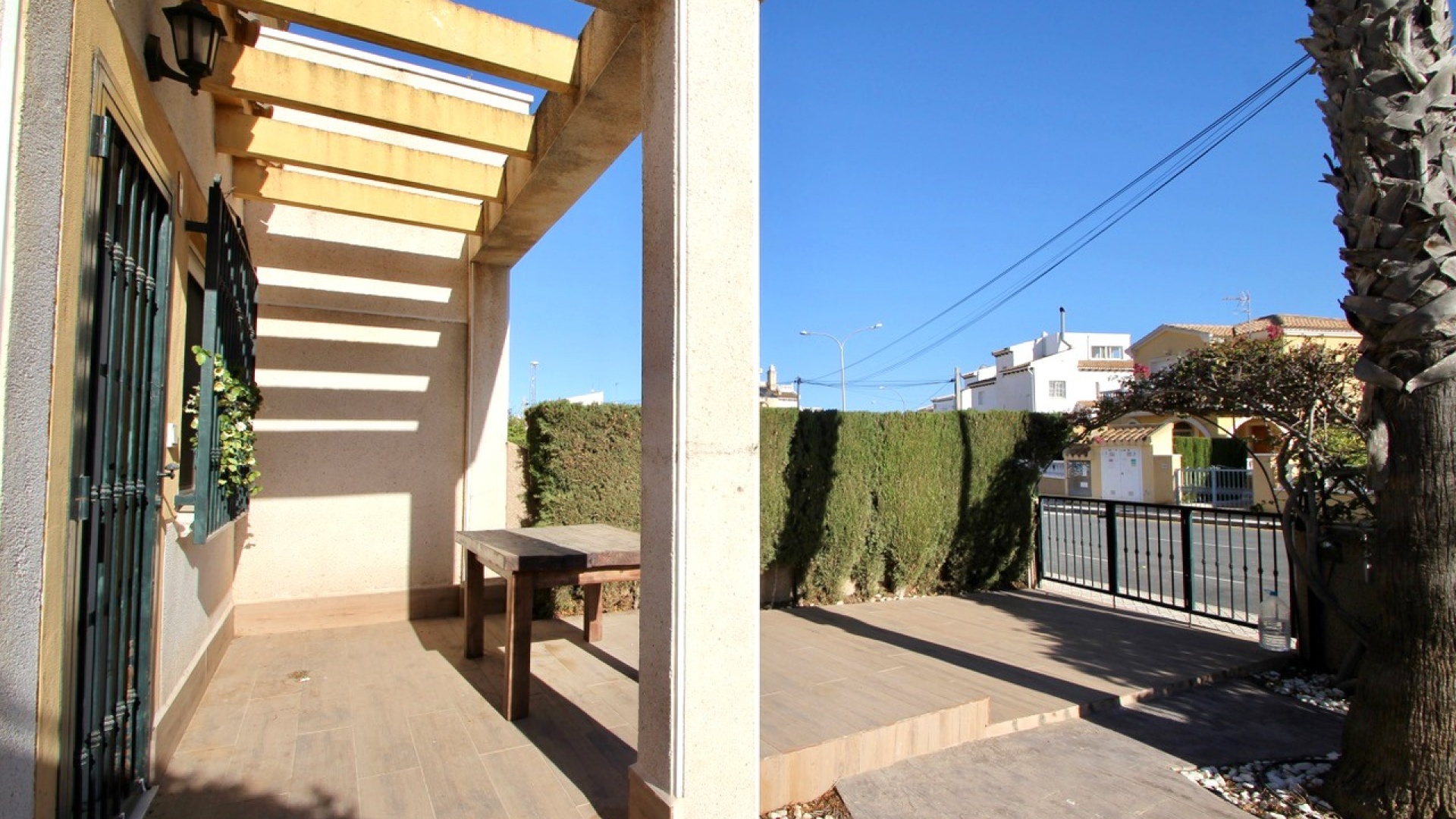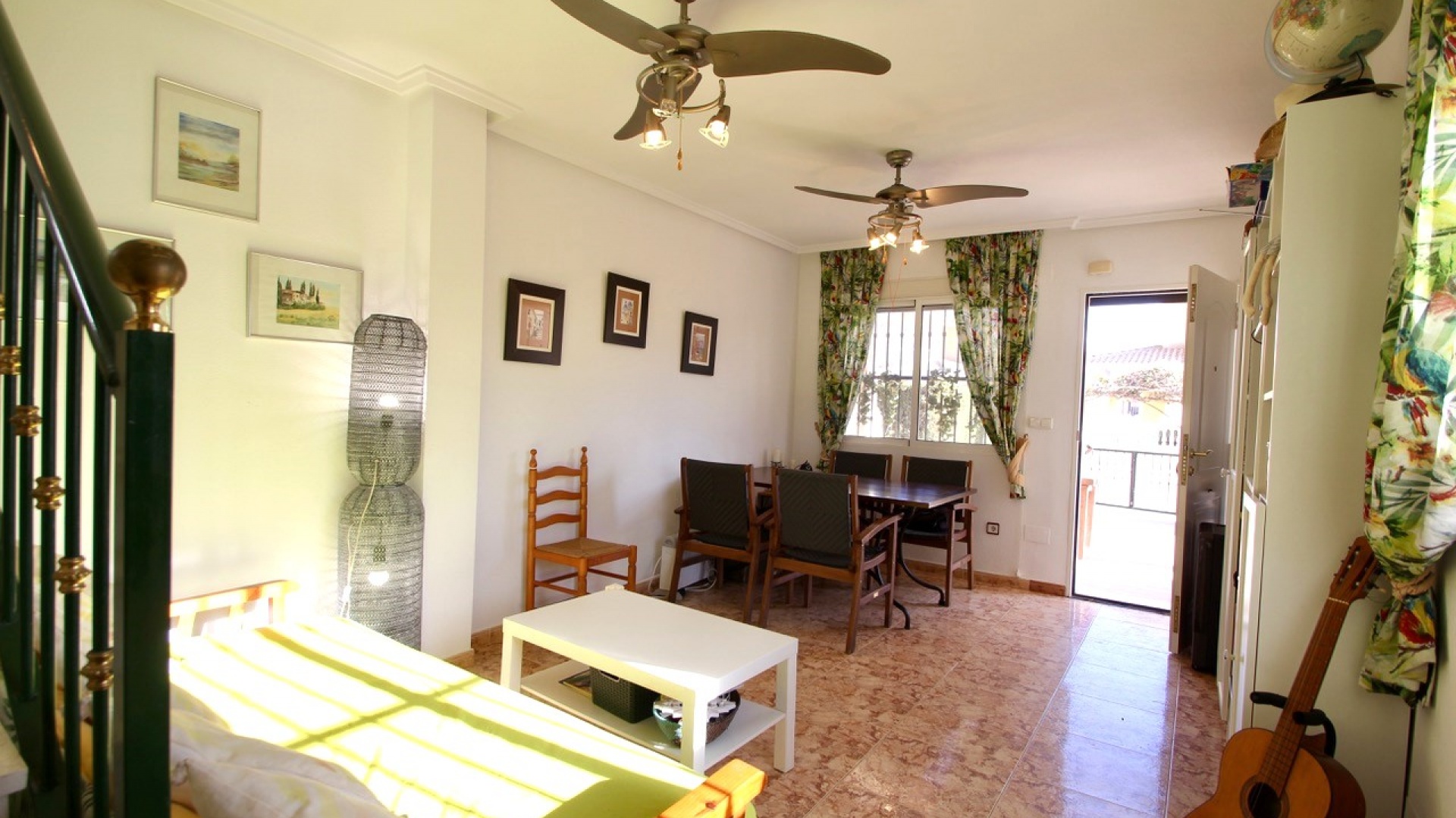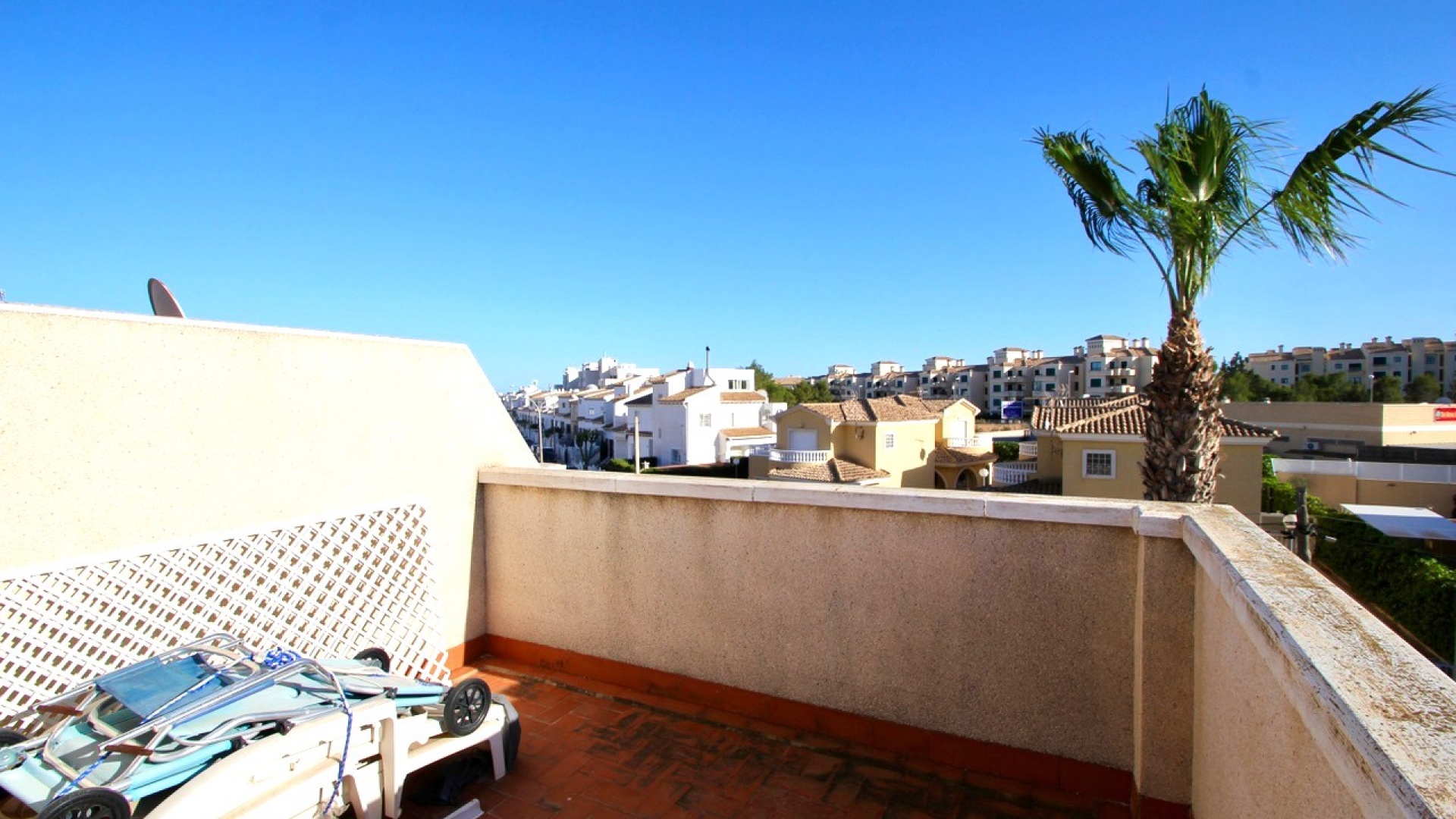 Een op het zuidwesten gelegen halfvrijstaande woning met 2 slaapkamers, 1,5 badkamers en een eigen dakterras, gelegen in St. James Hill, Villamartin, Costa Blanca Zuid.