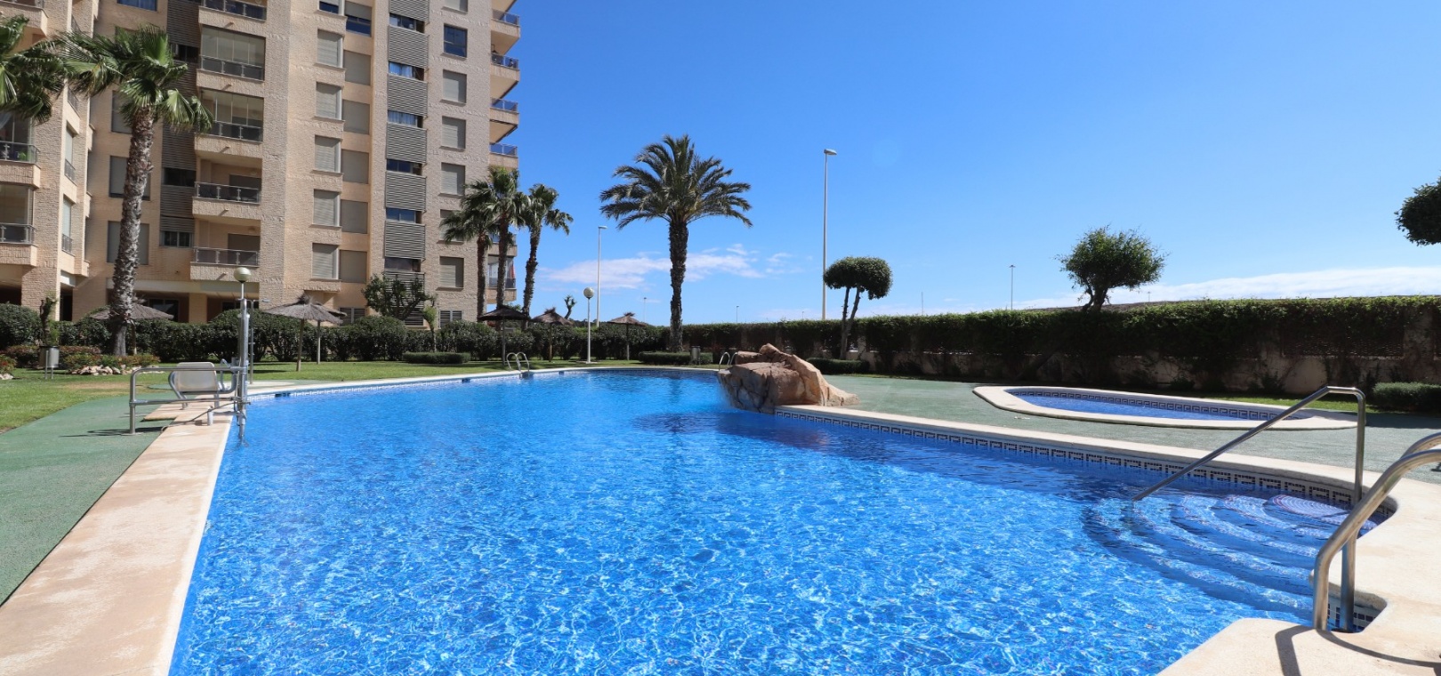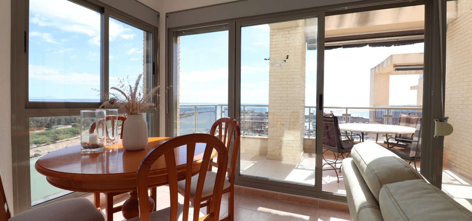 Dit prachtige hoek-, op het oosten gelegen penthouse-duplexappartement met drie slaapkamers in Guardamar del Segura ligt aan de haven, op de 10e verdieping, in een beveiligde gated community met luxe voorzieningen. Met een ruim onoverdekt terras van 10 m2 en een uitgestrekt privésolarium op het dak van 74 m2 biedt deze residentie een ongeëvenaard panoramisch uitzicht over de rivier, de zee, het dennenbos en de bergen daarachter. Binnen is het pand voorzien van inbouwkasten in elk van de drie slaapkamers, waardoor er voldoende opbergruimte is, terwijl airconditioning het hele jaar door voor comfort zorgt. Bewoners kunnen genieten van vrije tijd in het gemeenschappelijke zwembad, de tennisbaan, de speeltuin en het minigolfgebied, allemaal binnen de gated community. Parkeren is handig met twee ondergrondse afgesloten privégarages van respectievelijk 42 m² en 37 m², samen met een eigen ondergrondse parkeerplaats. De aparte keuken met aangrenzende bijkeuken voegt functionaliteit toe aan de woonruimte, terwijl de veiligheid wordt vergroot met een stevige veiligheidsdeur. Het buitenleven wordt vergroot met een zonnescherm op het terras, dat voor schaduw zorgt op zonnige dagen. Dankzij de toplocatie van de accommodatie ligt het op minder dan 500 meter van het strand en de kust, waardoor u gemakkelijk toegang heeft tot de prachtige voorzieningen van de kust. Deze residentie ligt aan de Costa Blanca Zuid, binnen handbereik van de lokale voorzieningen en faciliteiten, waardoor het een ideale keuze is voor mensen die op zoek zijn naar luxe wonen in een levendige kustgemeenschap. Absoluut opmerkelijk uitzicht! Eén die je niet mag missen!!!