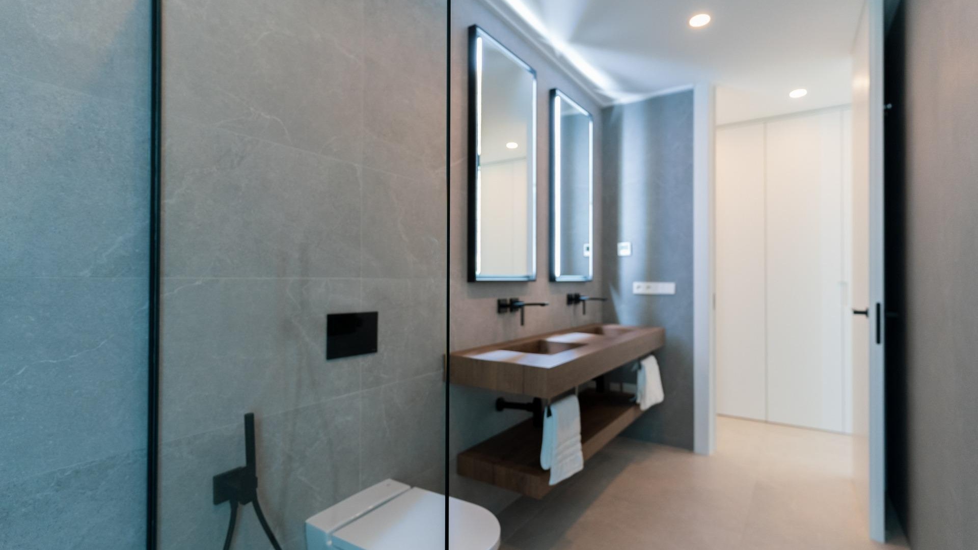 Een van de slaapkamers heeft een aangrenzende kleedkamer, wat een extra vleugje luxe toevoegt.