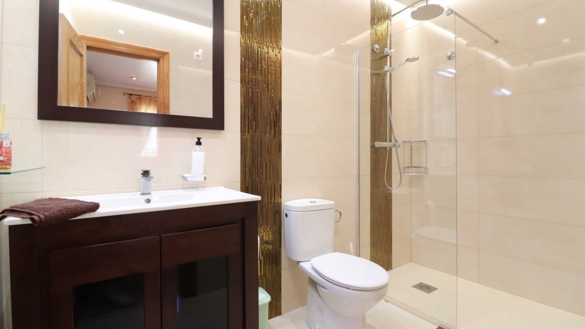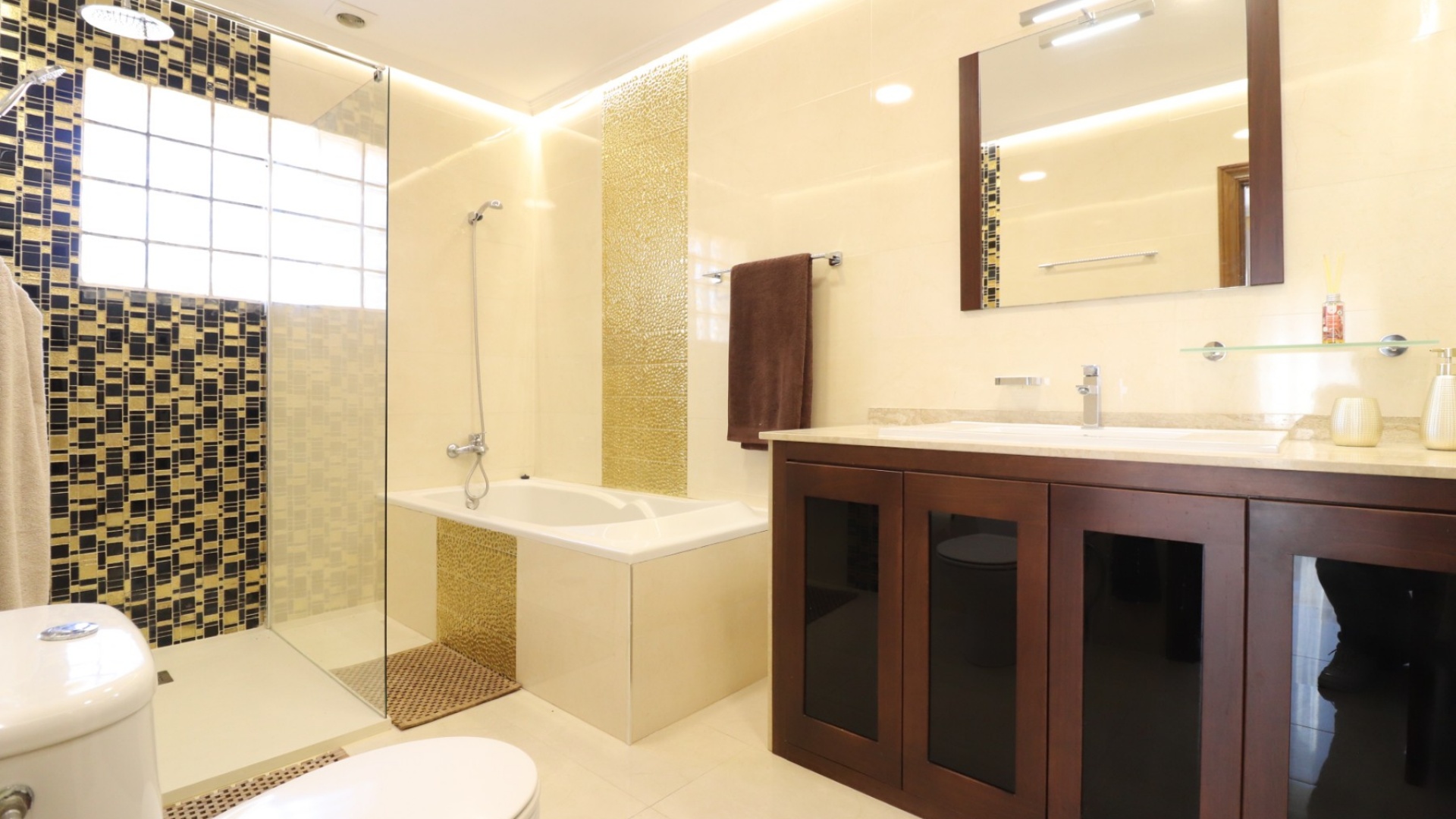 Deze spectaculaire, op het westen gelegen, vrijstaande villa met vier slaapkamers + apart bijgebouw met twee slaapkamers in San Fulgencio ligt in de urb van La Escuera, La Marina, op 15 minuten lopen van voorzieningen en faciliteiten. De hoofdvilla biedt een luxe indeling met vier slaapkamers en vier doucheruimtes, waarbij elke slaapkamer een eigen badkamer heeft. Eén slaapkamer heeft een ruime inloopkast, terwijl de andere drie inbouwkasten hebben. Het pand beschikt over een woonkamer voor het hele gezin met een charmante presentatie in bodega-stijl, evenals een aparte keuken met een kookeiland en een aangrenzende bijkeuken. Airconditioning en raamroosters zijn overal aanwezig en de woonkamer komt uit op een overdekt terras met glazen schuifdeuren die uitkijken op het privézwembad van 8x4. De hoofdslaapkamer heeft ook een solarium met een prachtig uitzicht op de urbanisatie. Het bijgebouw is zorgvuldig ontworpen met twee slaapkamers, twee doucheruimtes, een open, volledig ingerichte keuken en een gezellige woon-/eetkamer die leidt naar een overdekt terras, ideaal om buiten te eten. Buiten beschikt het pand over een ruime privétuin, compleet met een buitenbar, BBQ-plek en een opbergkast. Off-road parkeren is ook beschikbaar, wat gemak en toegankelijkheid garandeert. Deze villa combineert elegantie, comfort en buitenleven, wat het een geweldige optie maakt voor een familiehuis of vakantieverblijf.