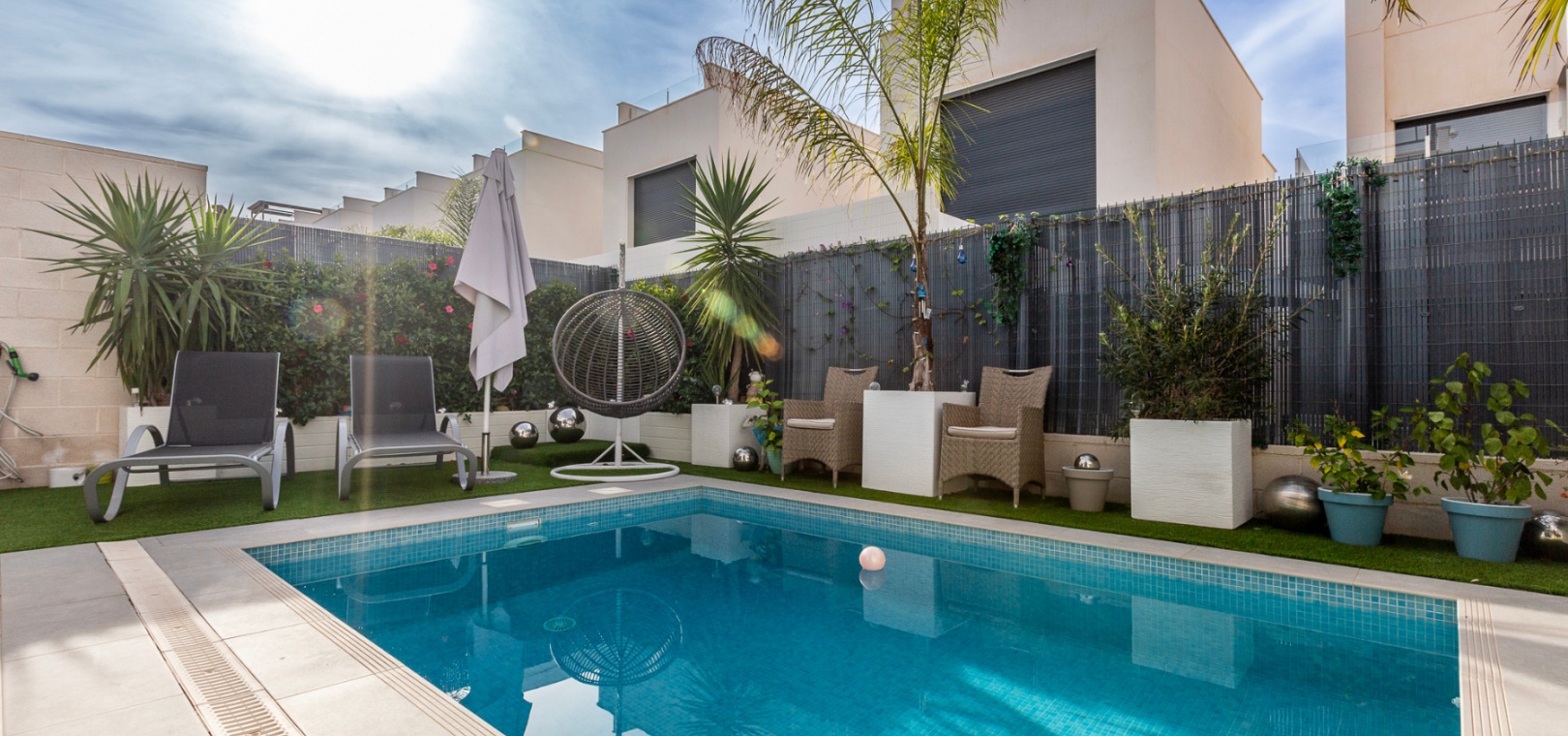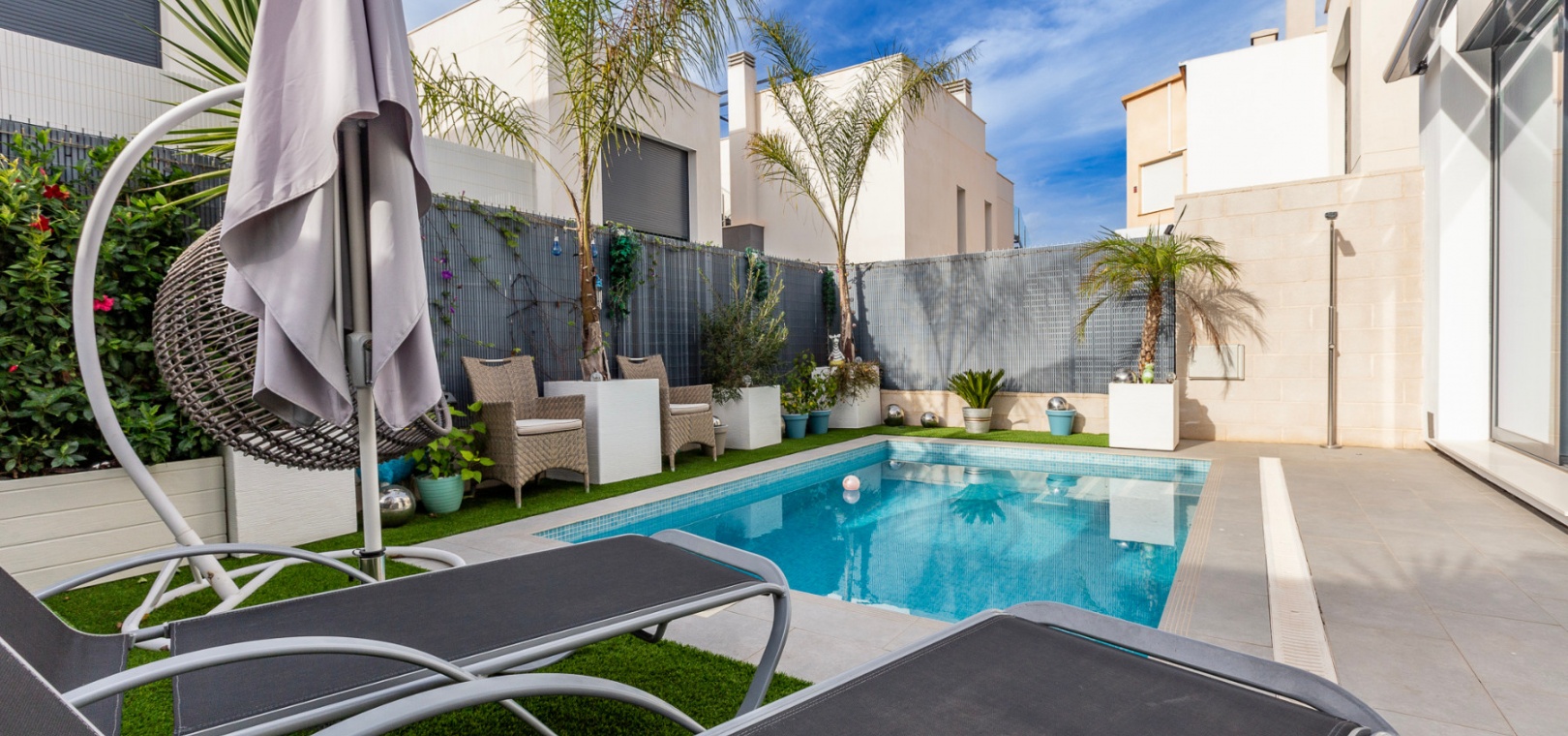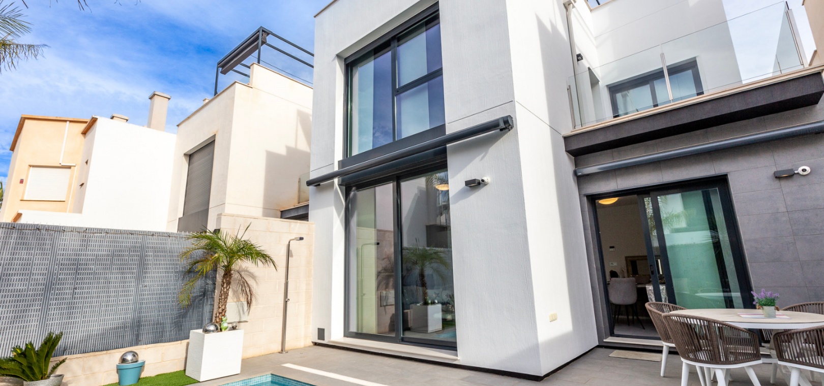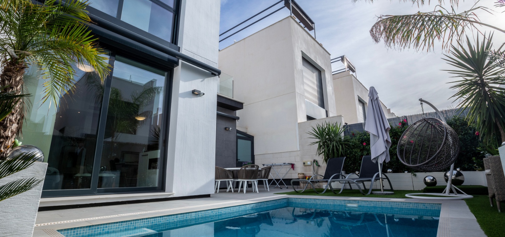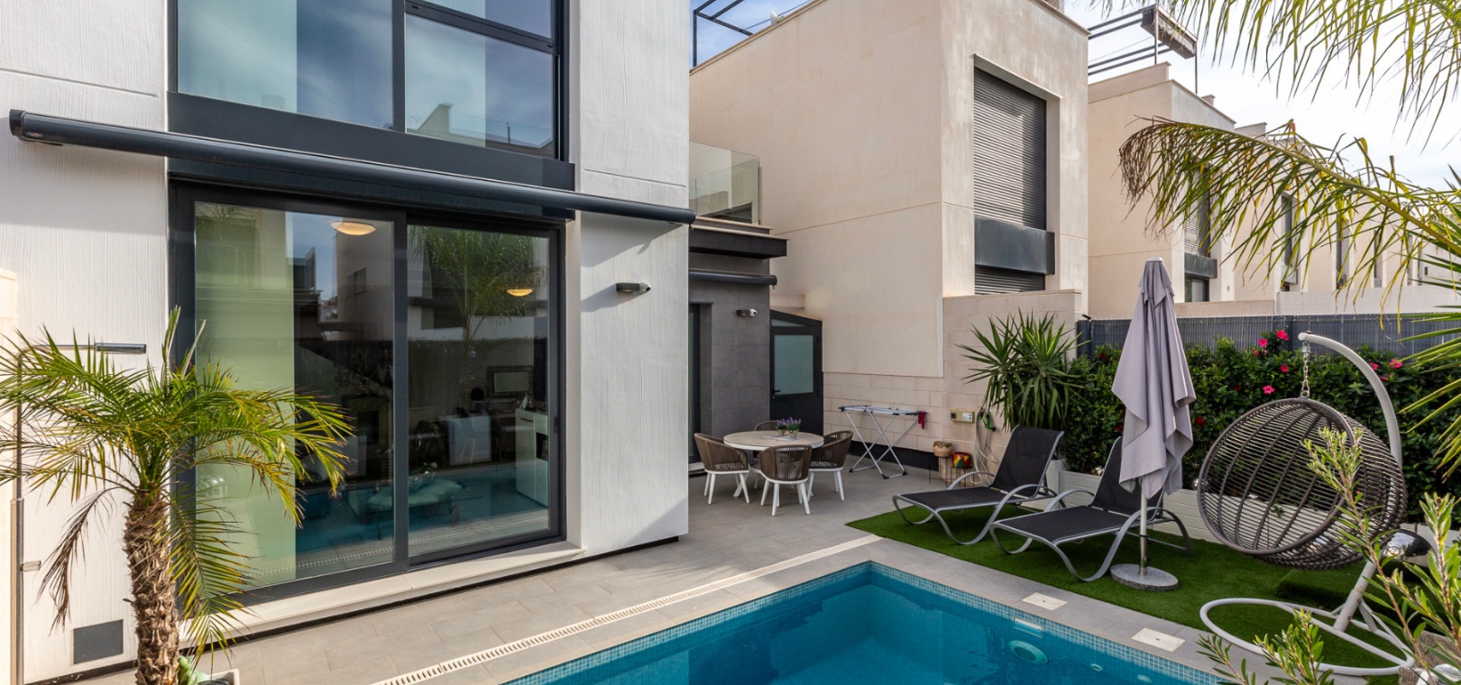 Een vrijstaande moderne villa met 3 slaapkamers, 2 badkamers en een privézwembad, gelegen op het westen, in PAU26, Villamartin, Costa Blanca.