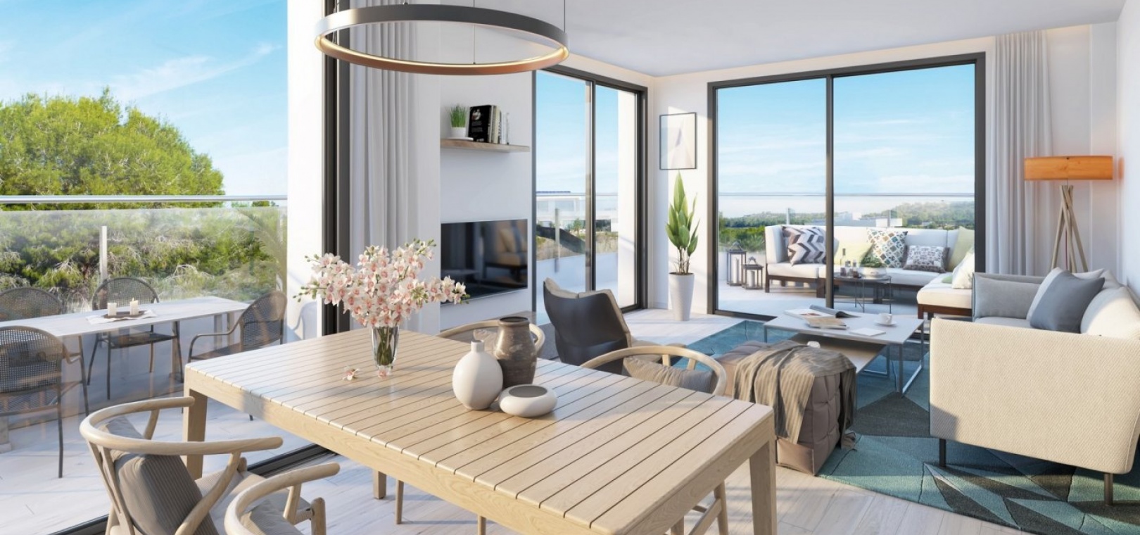Grote verscheidenheid aan typen om uit te kiezen: studio's, appartementen met 1, 2 of 3 slaapkamers. Lage verdiepingen met privétuinen of bovenste verdiepingen met privésolariums. Alle woningen hebben een parkeerplaats en een berging inbegrepen in de prijs.