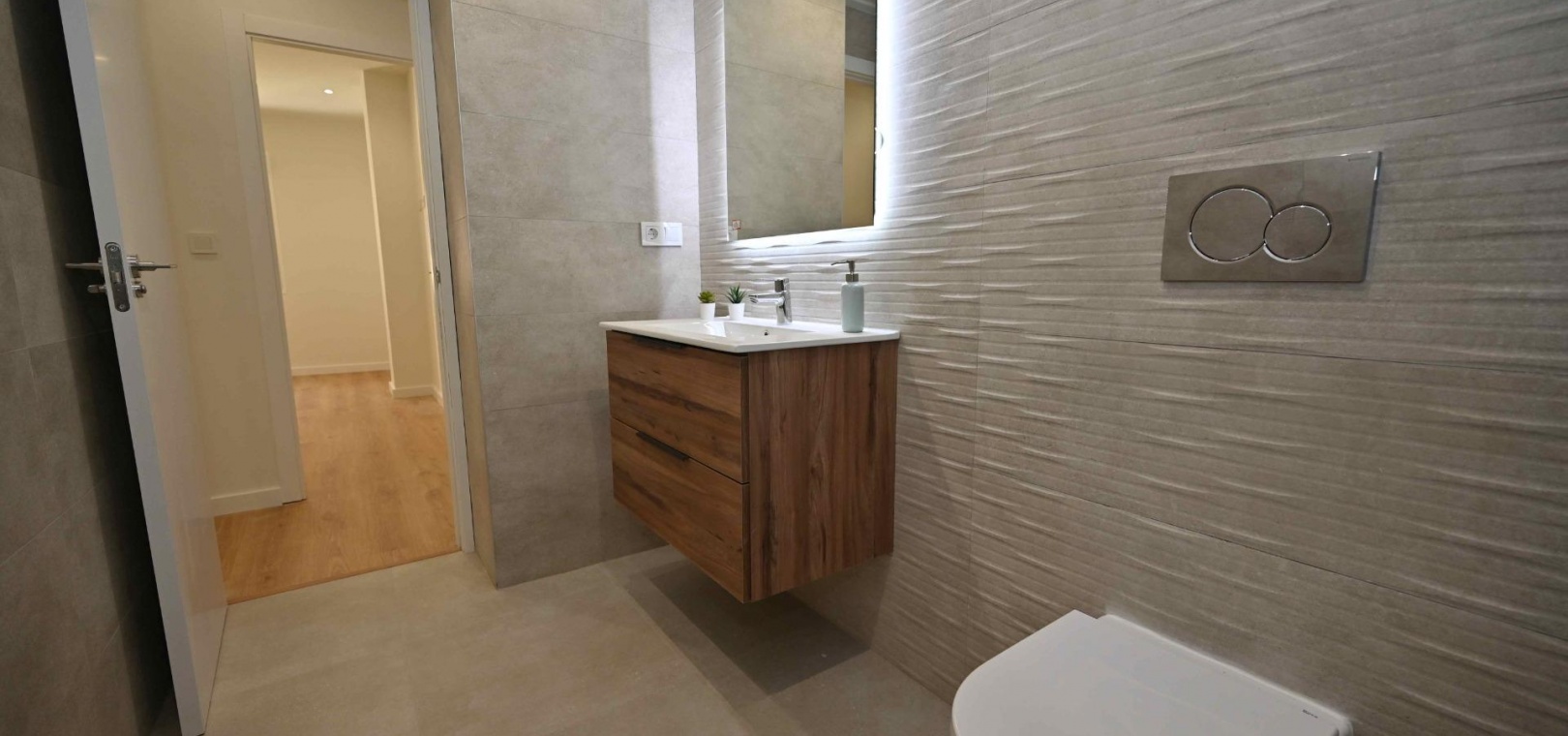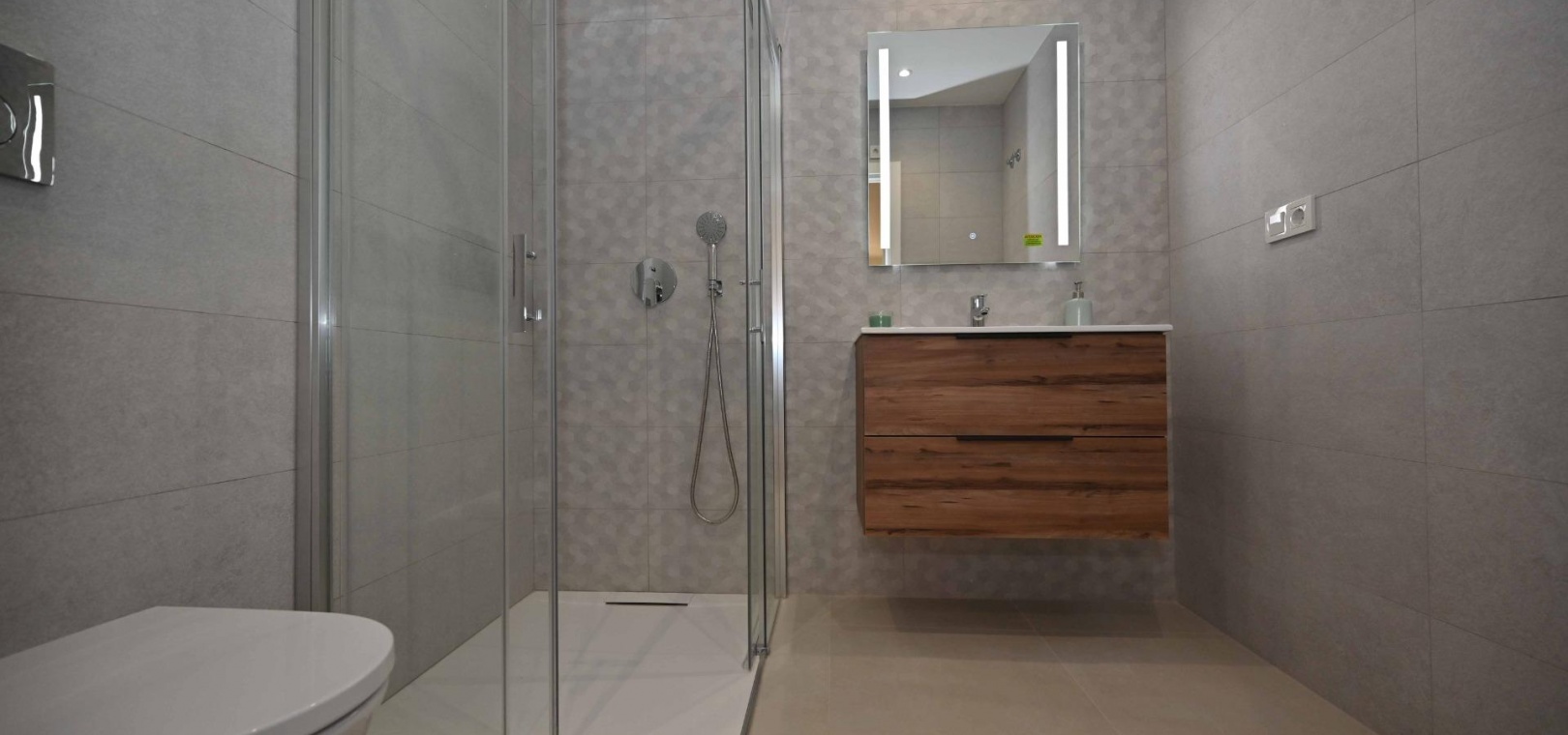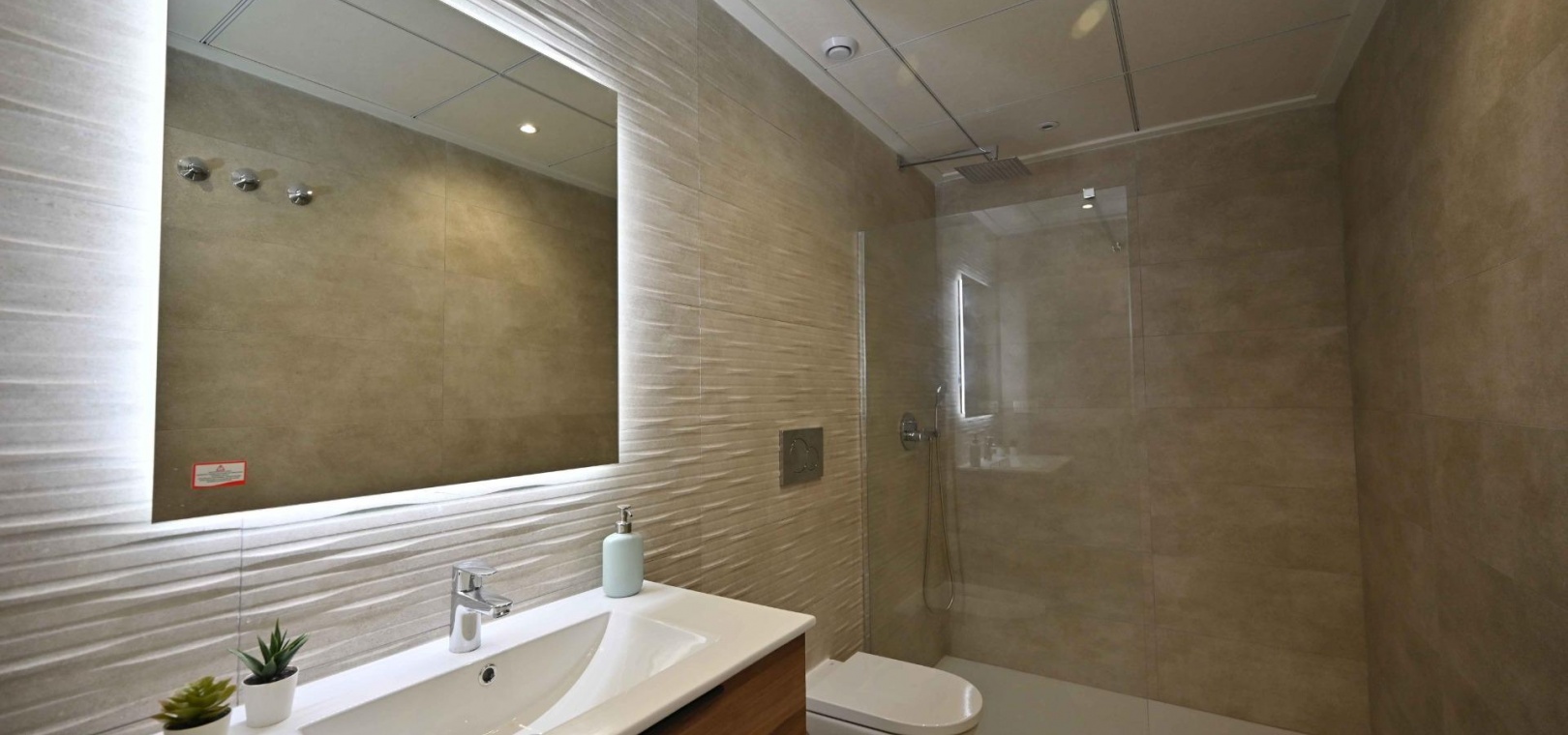 Badkamers: Porseleinen sanitair, spiegels met LED-verlichting en doucheschermen van gehard glas.