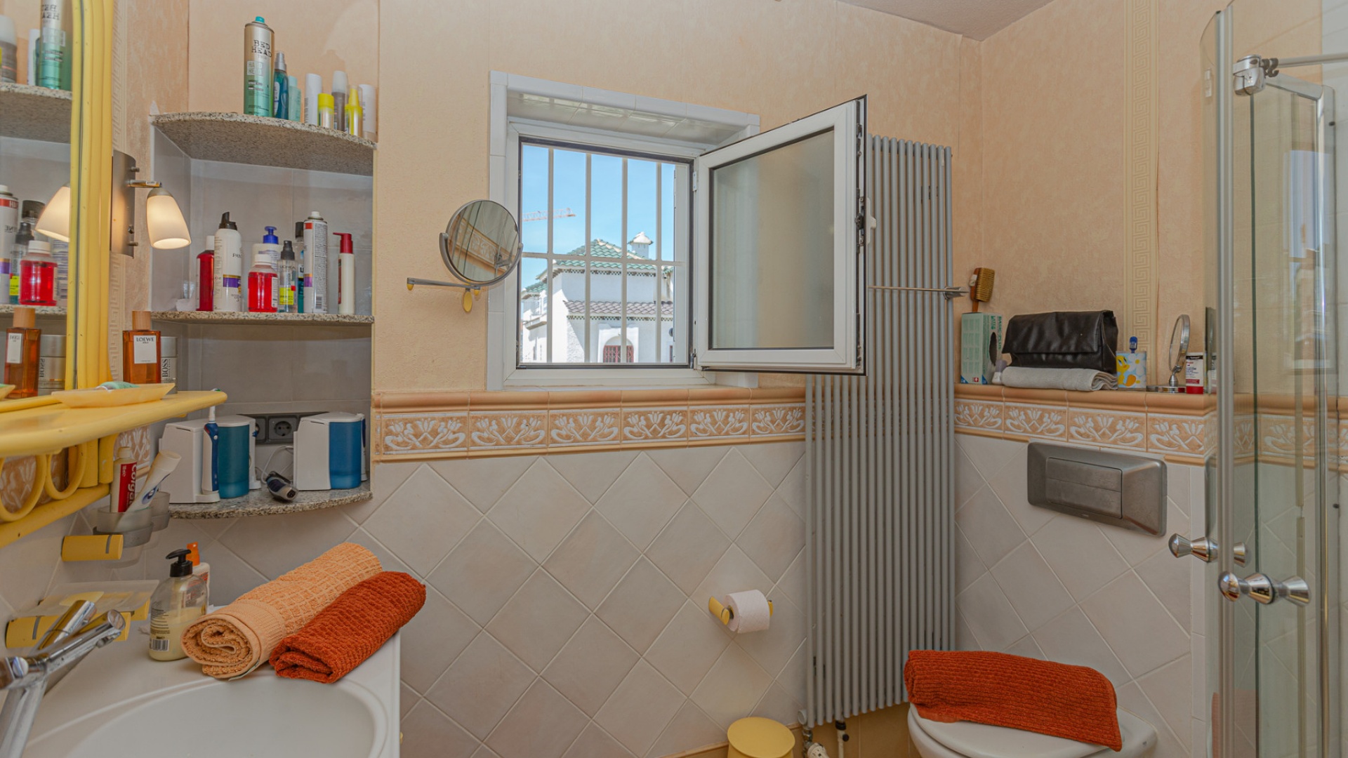 Op de eerste verdieping zijn er 3 slaapkamers, elk uitgerust met airconditioning om alleen te koelen, wat zorgt voor een koele en aangename omgeving tijdens de warmere maanden van het jaar. Twee van de slaapkamers hebben toegang tot een terras met een prachtig uitzicht op Cabo Roig Beach, waardoor deze ruimte een bevoorrechte plek is om te ontspannen en te genieten van de zeebries.
