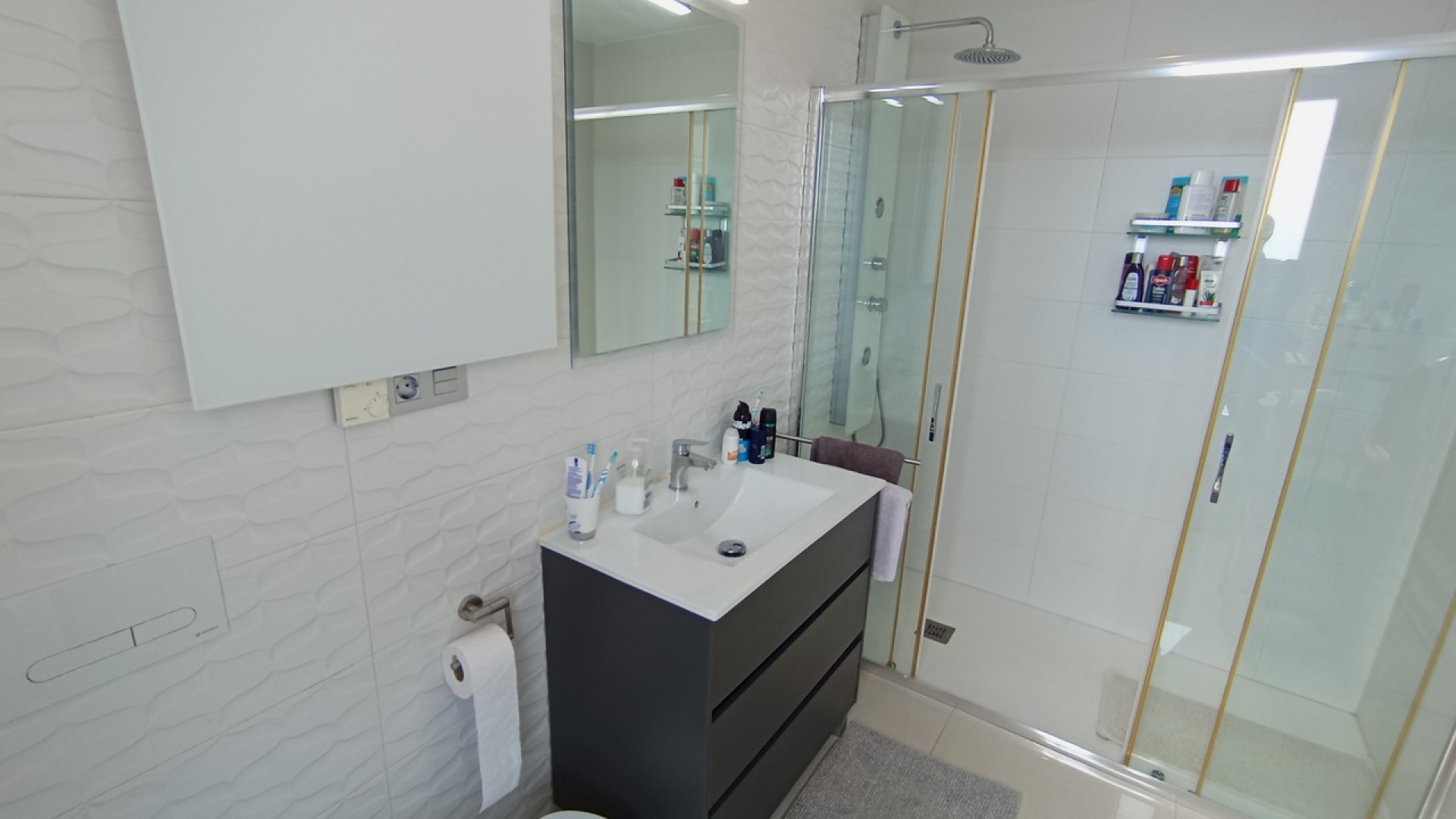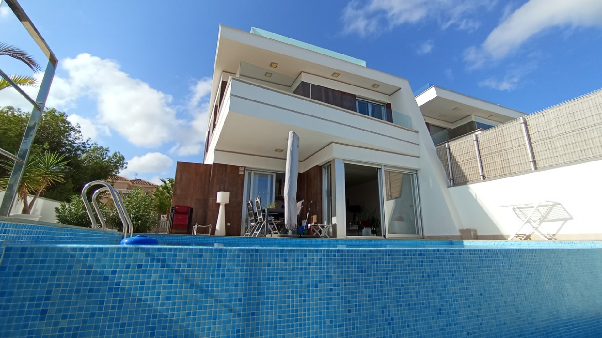 Een kwaliteitsvolle, moderne villa met 3 slaapkamers, 3 badkamers, 1 gastentoilet en een privé-infinityzwembad, dichtbij voorzieningen in het Las Filipinas-gebied van Villamartin met off-street, beveiligde parkeergelegenheid en een dakterras met uitzicht op zee. Een van de slaapkamers met een eigen badkamer bevindt zich op de begane grond en de twee slaapkamers op de bovenverdieping hebben inloopkasten. De woning heeft een moderne keuken met inbouwapparatuur, infraroodradiatorverwarming, warme en koude airconditioning, elektrische toegangspoort, een alarmsysteem, elektrische rolluiken, een waterontharder en filtersysteem en eigen badkamers met vloerverwarming. Wordt voornamelijk gemeubileerd verkocht.