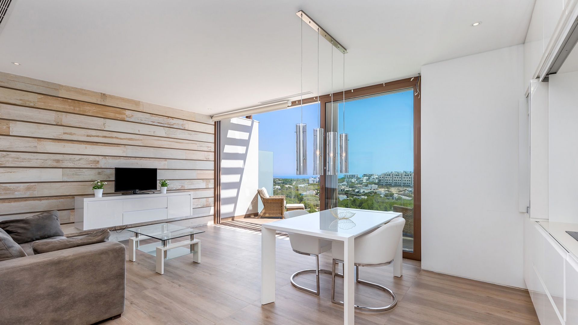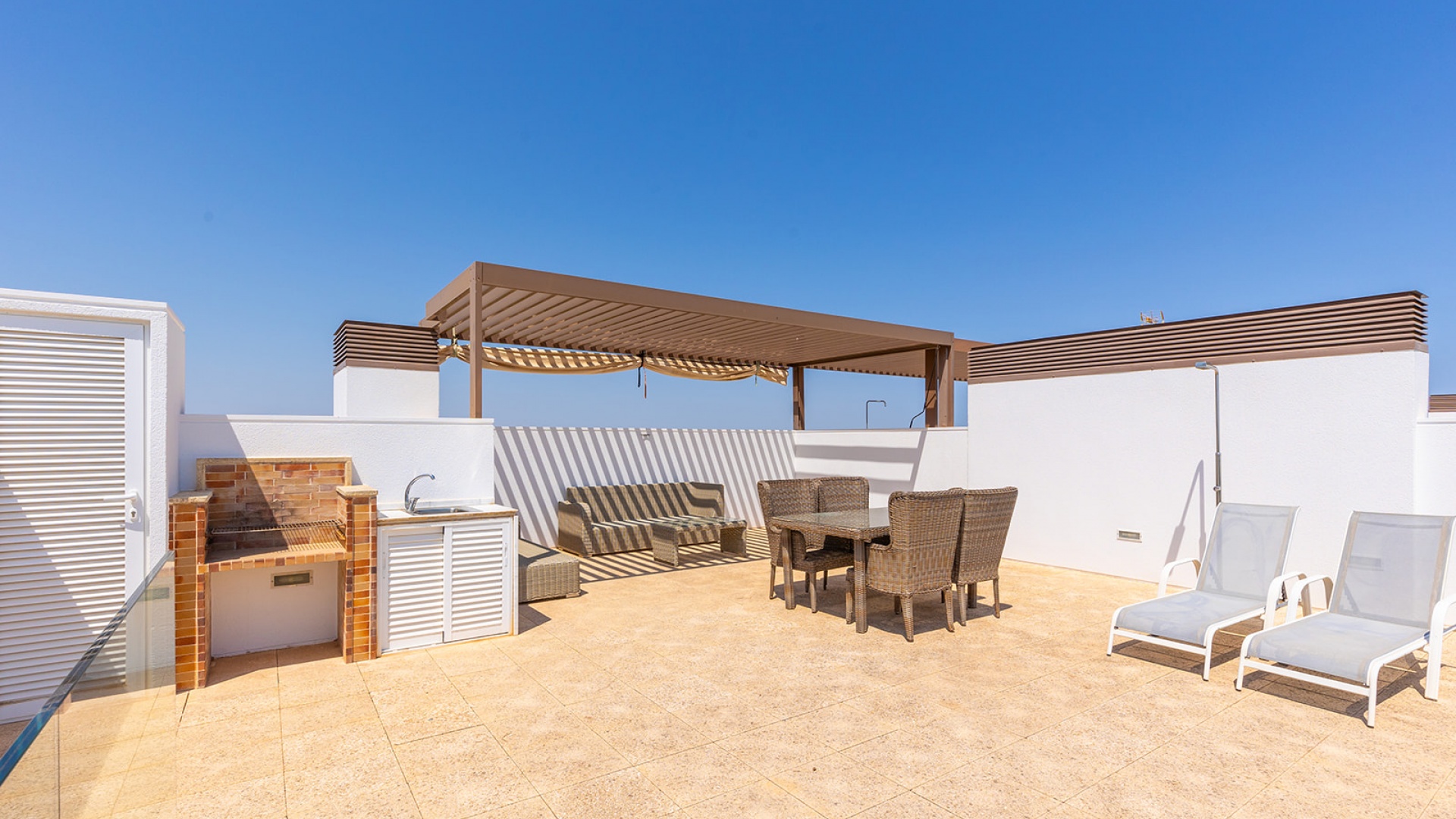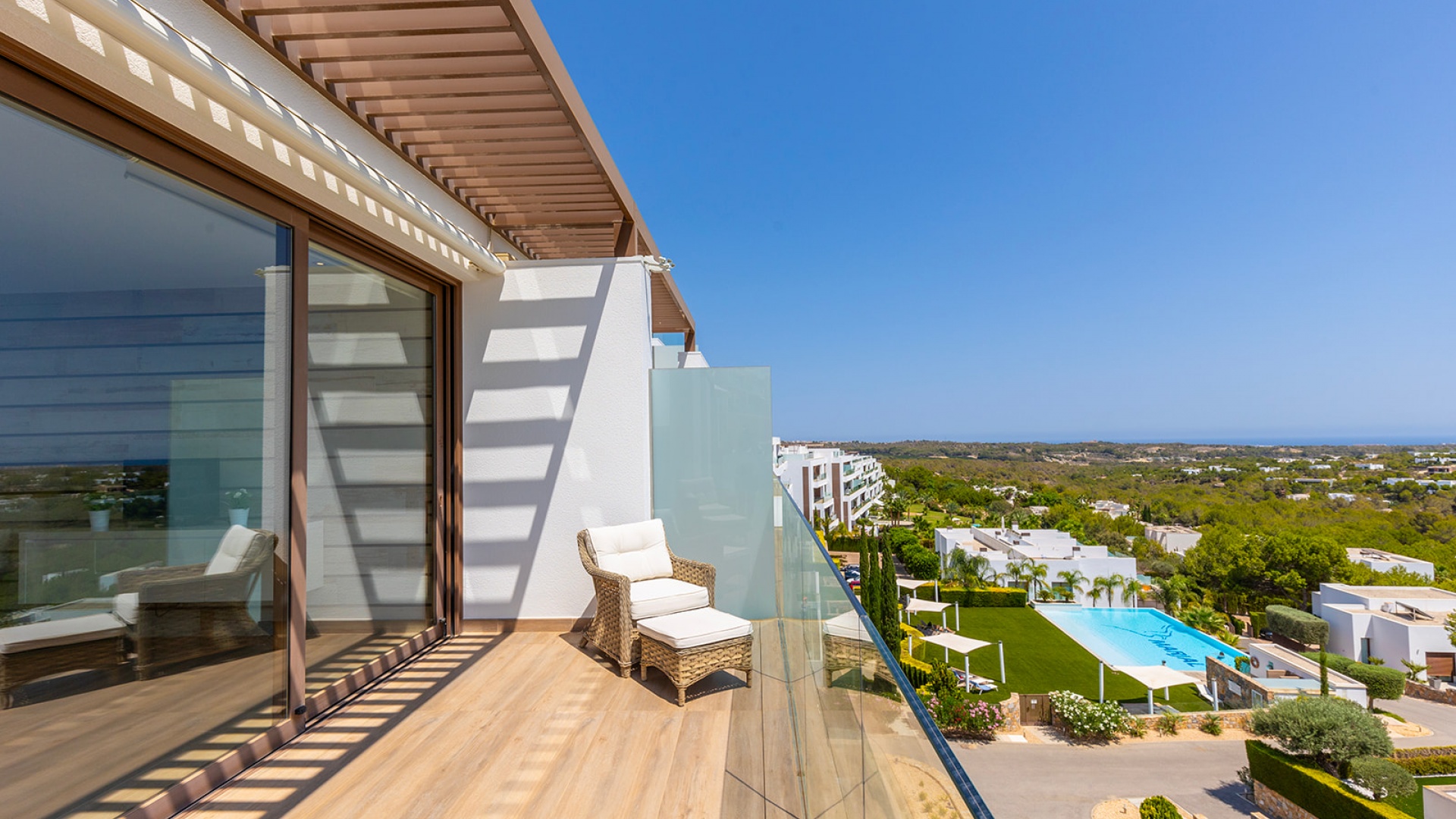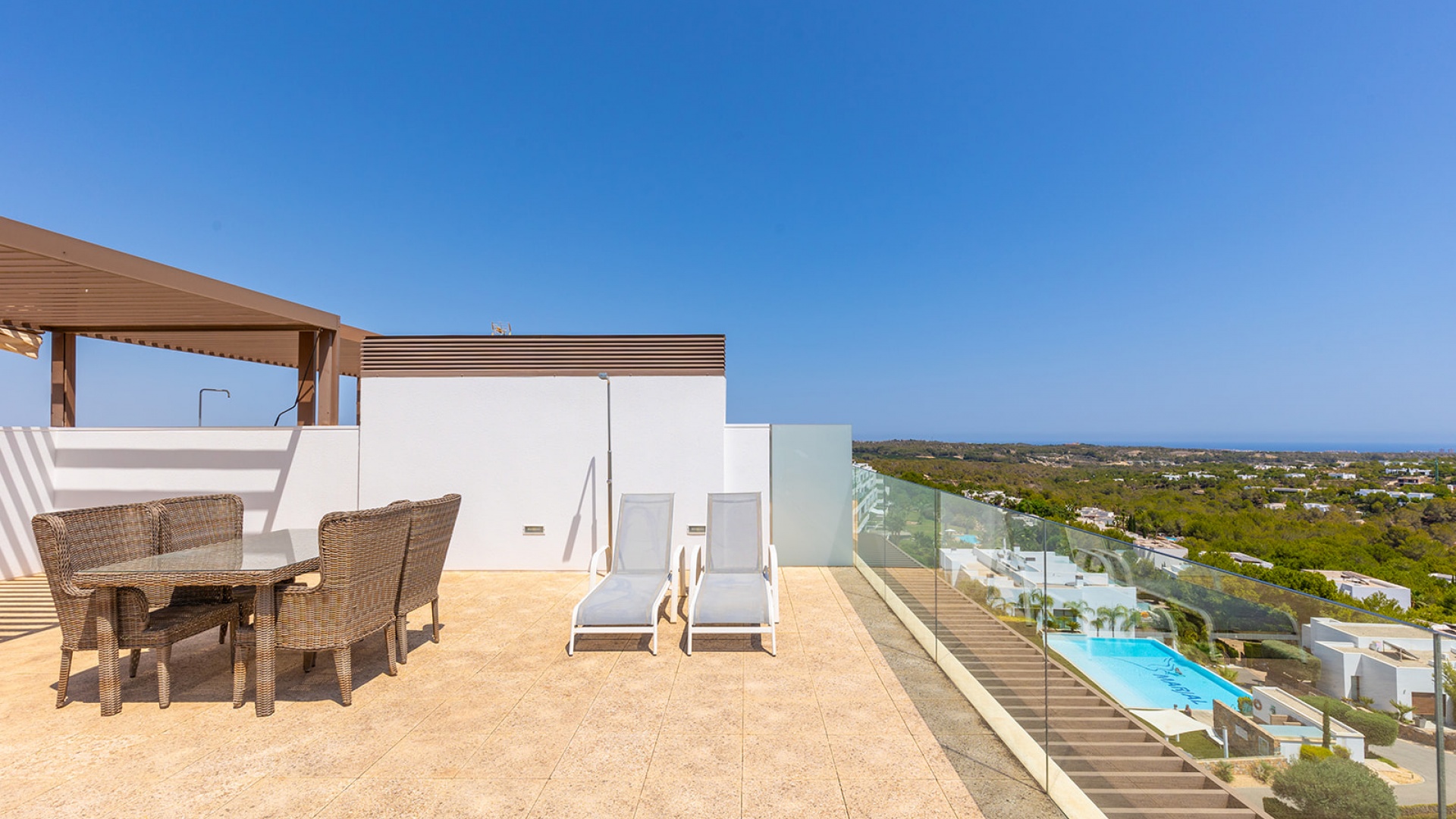 Luxe penthouse in Las Colinas Golf. Dit prachtige appartement op de bovenste verdieping biedt een ruime woon-eetkamer en open keuken, volledig uitgerust met apparatuur, samen met een terras met uitzicht op het gemeenschappelijke zwembad en groene gebieden. De woning heeft twee lichte slaapkamers en een eigen solarium met open keuken. Bij het appartement is een parkeerplaats en een eigen berging in de kelder inbegrepen.