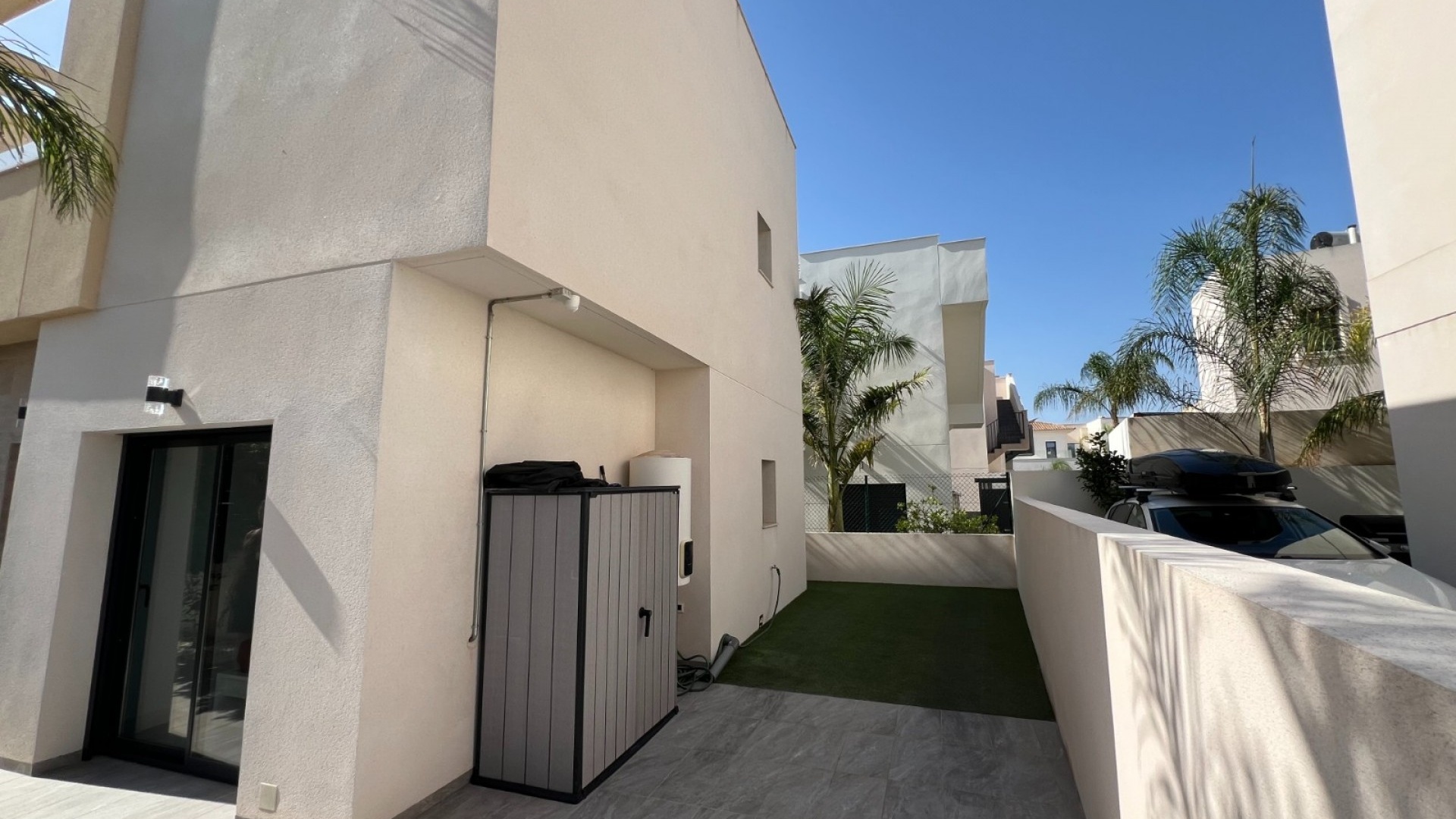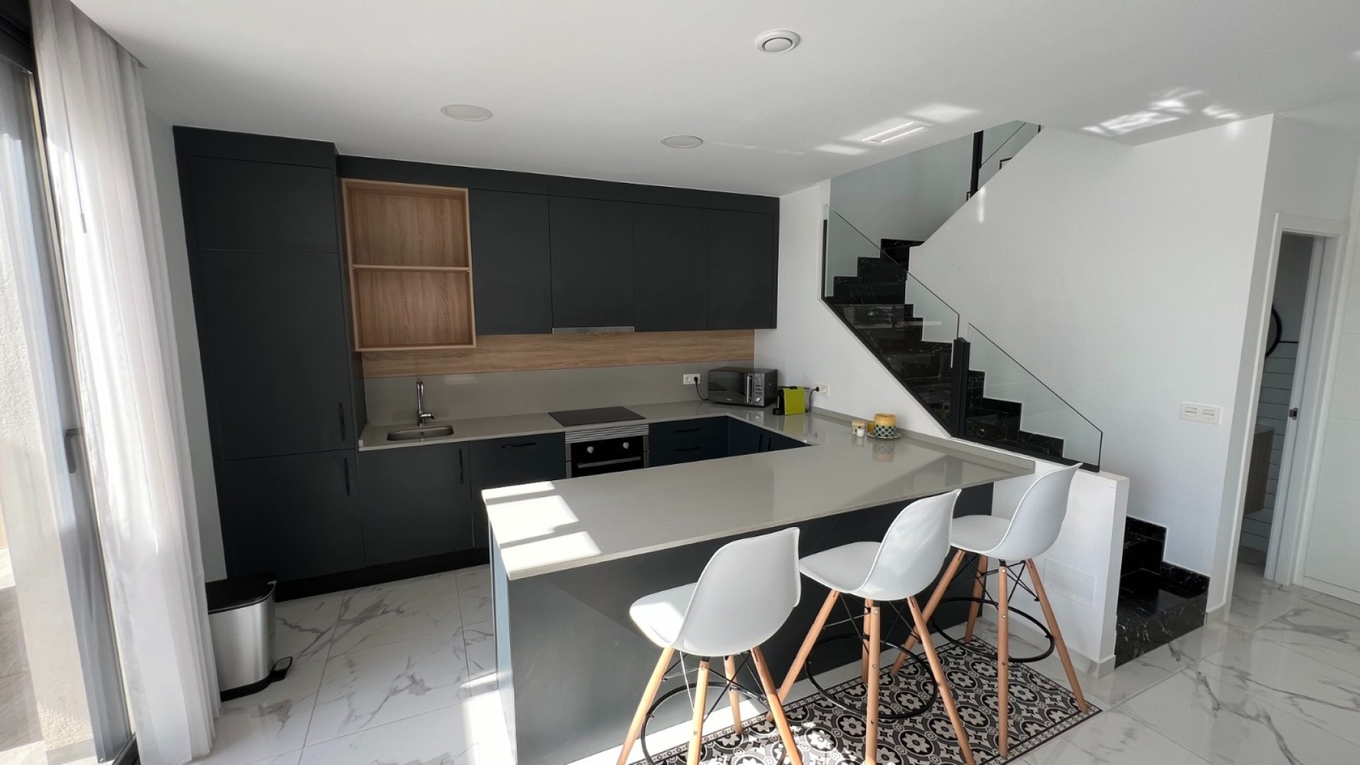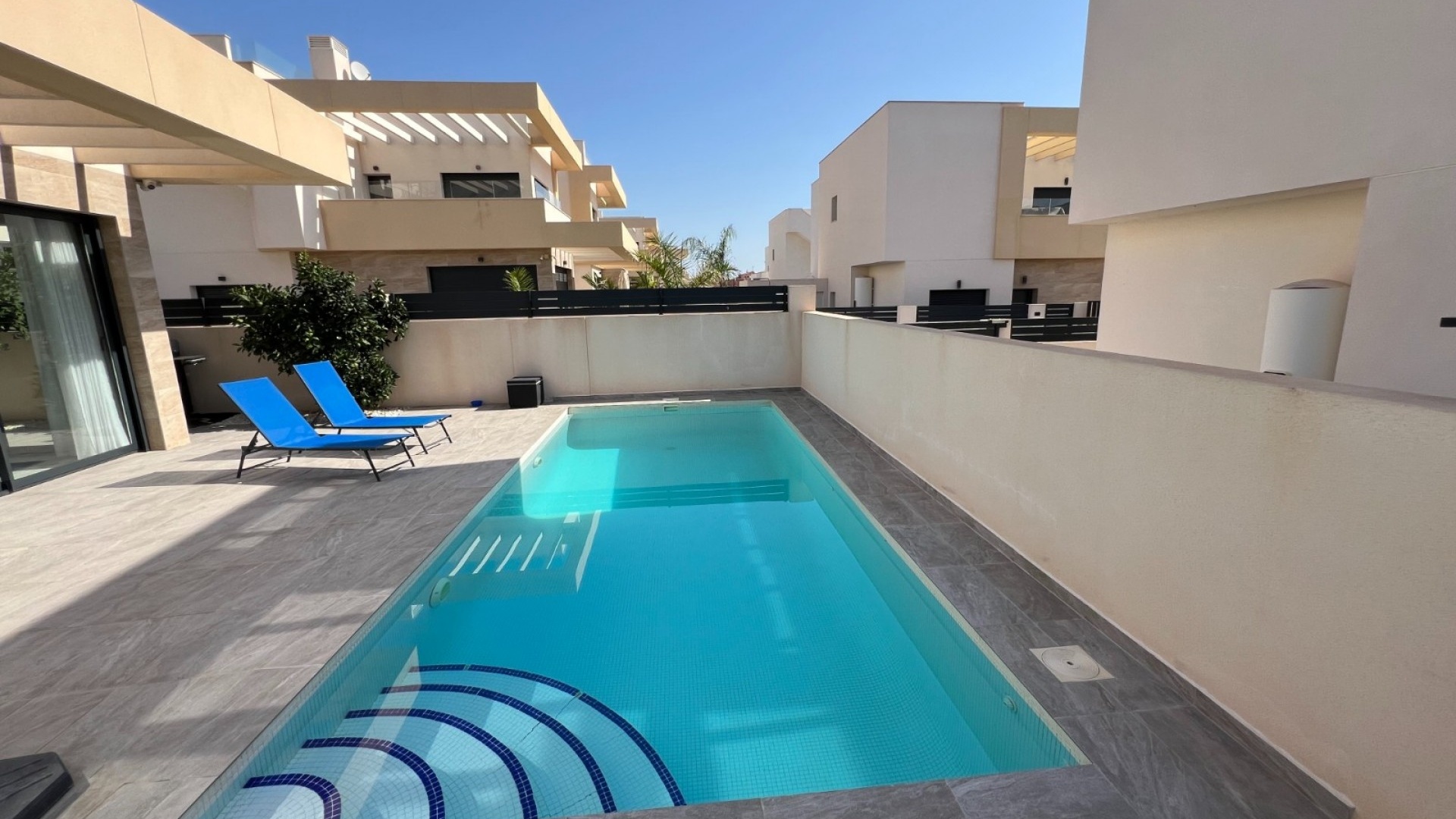 Deze moderne villa, gebouwd in 2021, is het toonbeeld van hedendaags design en luxe wonen. De villa ligt in La Herrada, Los Montesinos, en beslaat een bebouwde oppervlakte van ongeveer 115 m² op een perceel van 225 m² op het zuiden en oosten, waardoor er de hele dag door voldoende natuurlijk licht is. De begane grond is een bewijs van open woonruimte, met een ruime keuken die naadloos is geïntegreerd met een lounge en eethoek. Drie grote ramen overspoelen de ruimte met licht en bieden een onbelemmerd uitzicht op het privézwembad en een groot zonneterras, perfect voor ontspanning en entertainment buitenshuis. De villa beschikt over drie ruime slaapkamers, elk voorzien van voldoende kastruimte. Twee van deze slaapkamers hebben een eigen badkamer, wat privacy en gemak biedt. Eén slaapkamer valt op door de toegang tot een groot balkon, een ideale plek voor een kopje koffie in de ochtend of ontspanning in de avond. Naast het terras en het balkon beschikt de villa over een groot solarium, met adembenemend uitzicht op de omgeving, inclusief de prachtige zoutmeren. Deze woning is een uitstekende keuze voor wie op zoek is naar een modern, stijlvol huis in een rustige, maar toch goed bereikbare omgeving.