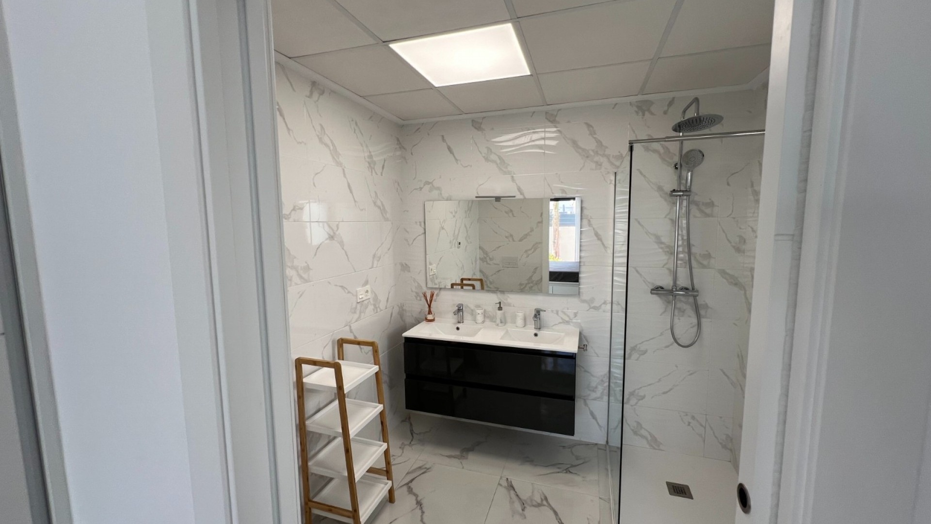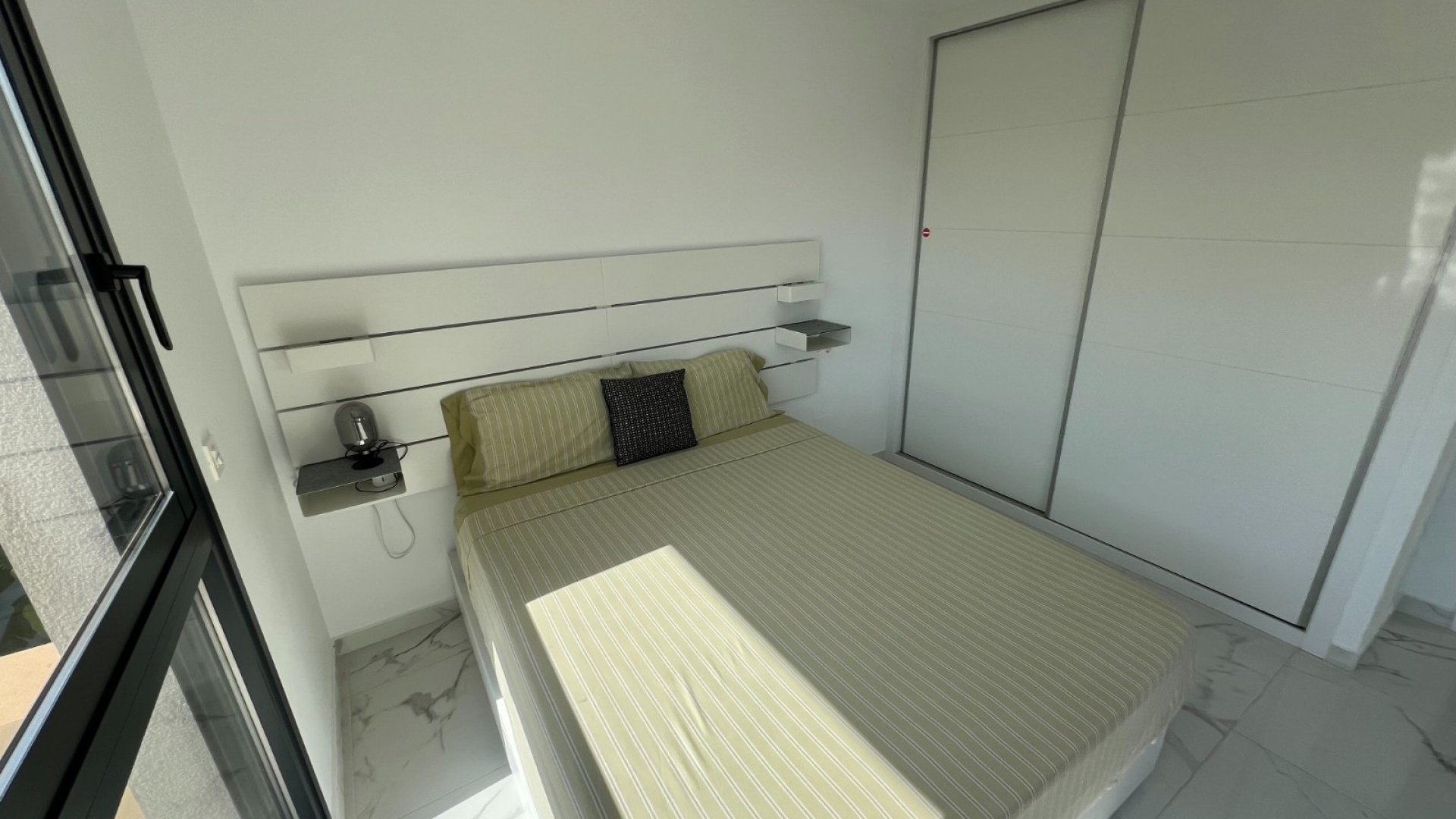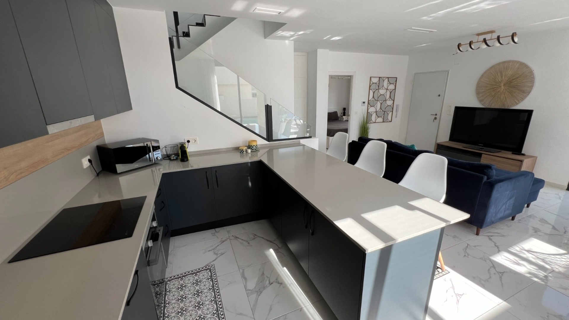 Deze moderne villa, gebouwd in 2021, is het toonbeeld van hedendaags design en luxe wonen. De villa ligt in La Herrada, Los Montesinos, en beslaat een bebouwde oppervlakte van ongeveer 115 m² op een perceel van 225 m² op het zuiden en oosten, waardoor er de hele dag door voldoende natuurlijk licht is. De begane grond is een bewijs van open woonruimte, met een ruime keuken die naadloos is geïntegreerd met een lounge en eethoek. Drie grote ramen overspoelen de ruimte met licht en bieden een onbelemmerd uitzicht op het privézwembad en een groot zonneterras, perfect voor ontspanning en entertainment buitenshuis. De villa beschikt over drie ruime slaapkamers, elk voorzien van voldoende kastruimte. Twee van deze slaapkamers hebben een eigen badkamer, wat privacy en gemak biedt. Eén slaapkamer valt op door de toegang tot een groot balkon, een ideale plek voor een kopje koffie in de ochtend of ontspanning in de avond. Naast het terras en het balkon beschikt de villa over een groot solarium, met adembenemend uitzicht op de omgeving, inclusief de prachtige zoutmeren. Deze woning is een uitstekende keuze voor wie op zoek is naar een modern, stijlvol huis in een rustige, maar toch goed bereikbare omgeving.