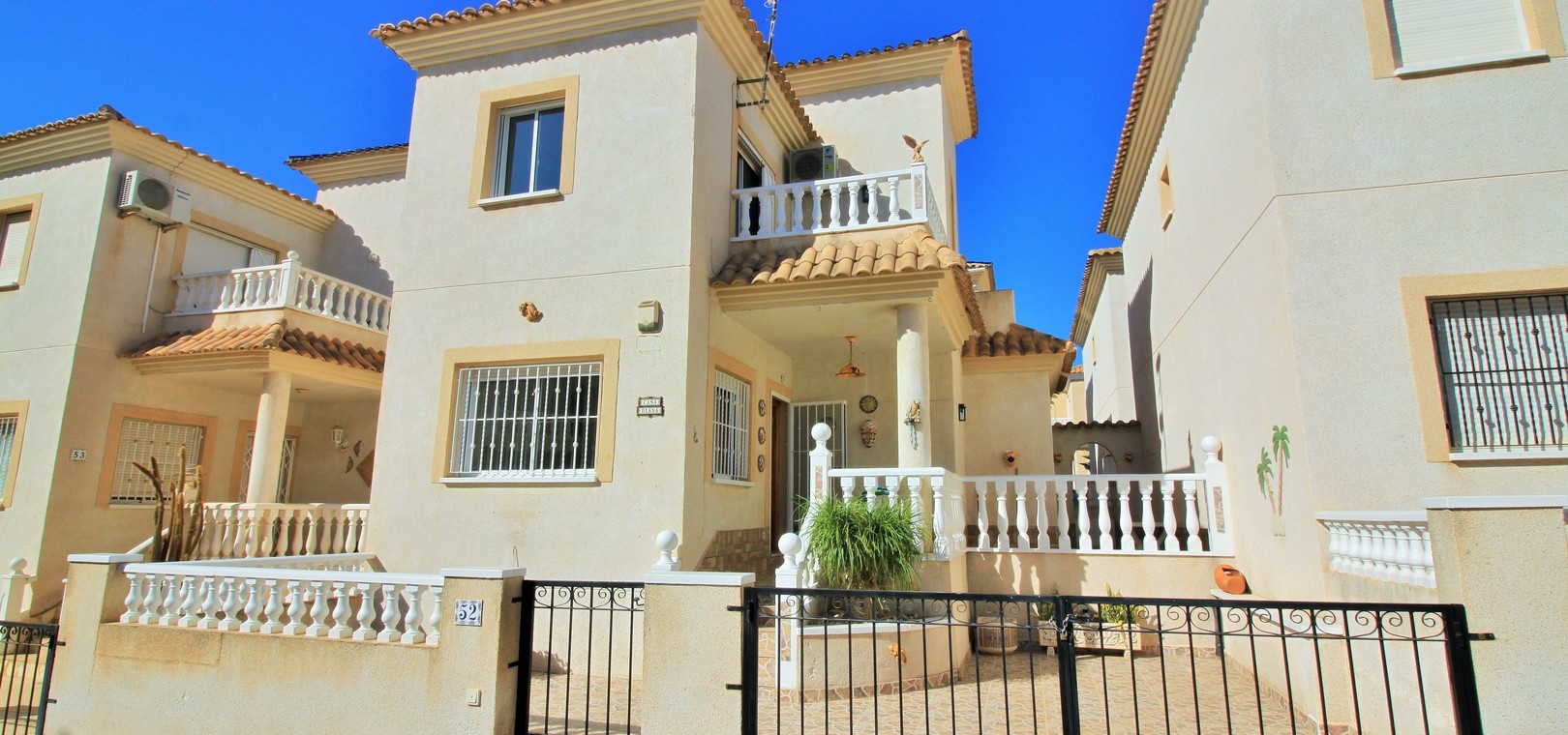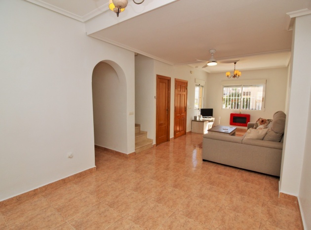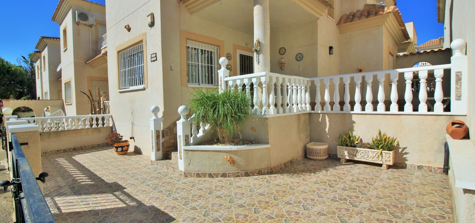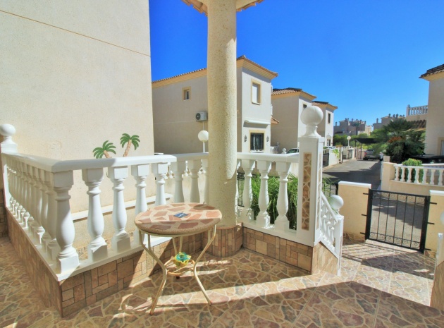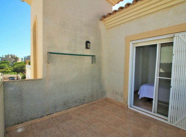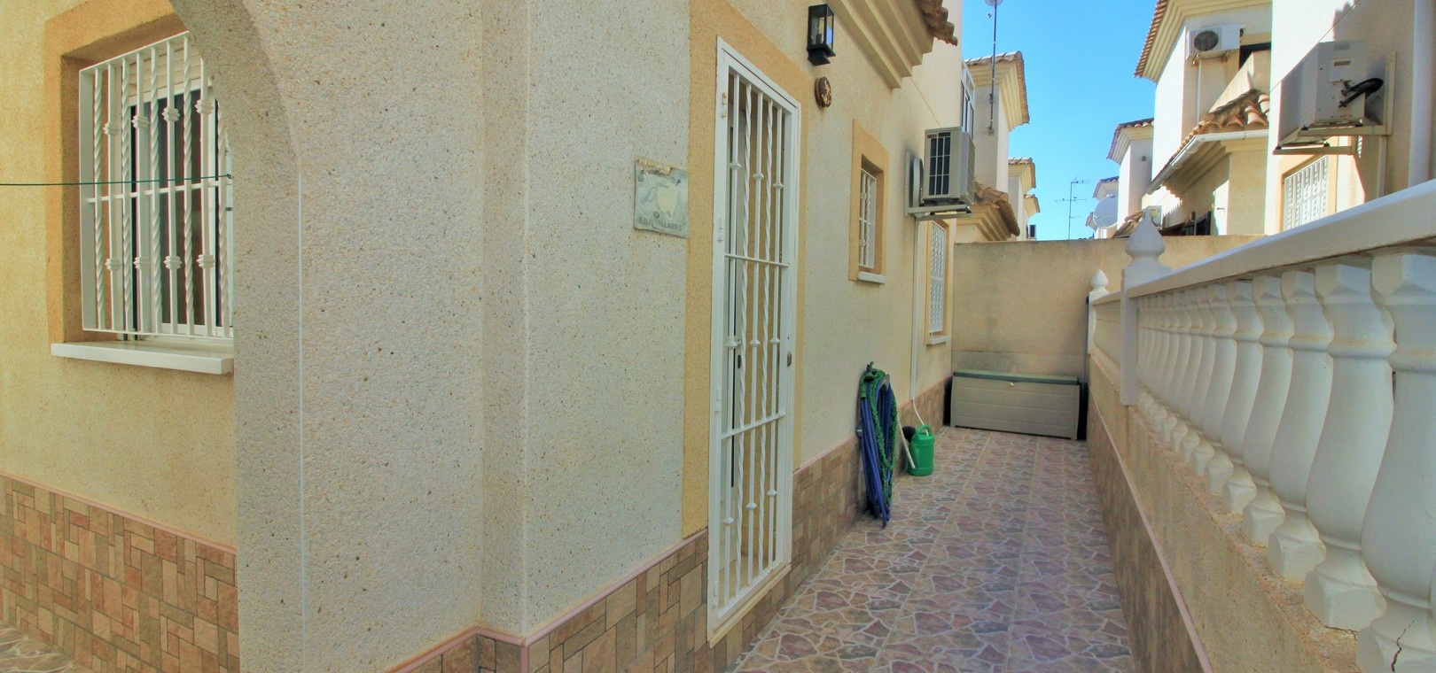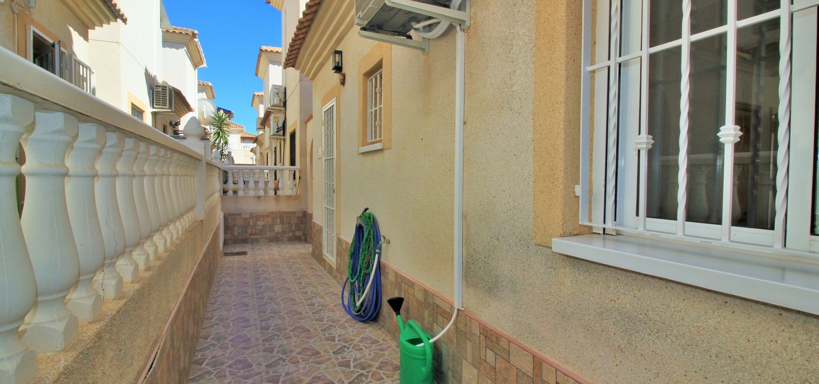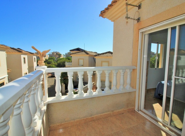 VERLAAGD MET €10.000! Prachtig gepresenteerde vrijstaande villa op het zuiden met gemeenschappelijk zwembad te koop in het wooncomplex La Pinada in Playa Flamenca. De villa verkeert in onberispelijke staat en is gelegen op een ideale locatie, op loopafstand van de lokale bars, restaurants, winkels, de zaterdagmarkt en het winkelcentrum Zenia Boulevard, met meer dan 155 winkels. De villa bevindt zich in de gemeenschap zonder doorgaand verkeer. Bezichtigingen worden ten zeerste aangeraden! Het pand is verdeeld over 2 verdiepingen, met op de begane grond een betegelde tuin met oprit, een verhoogd terras/porch die leidt naar de lichte en luchtige woon-eetkamer met aparte volledig uitgeruste keuken en een gerenoveerde badkamer beneden met inloopdouche. Vanuit de keuken heeft u ook toegang tot het buitenterras. Boven zijn 2 tweepersoonsslaapkamers met inbouwkasten en een gerenoveerde familiebadkamer met inloopdouche. Beide slaapkamers hebben een eigen balkon. De villa is goed onderhouden met nieuwe airconditioningunits, meubels, badkamers en overal opnieuw geverfd. Een perfect sleutelklaar pand, op een fantastische locatie in de buurt van de stranden en allerlei voorzieningen en diensten! La Pinada is een kleine en goed onderhouden gemeenschap die huiseigenaren gebruik biedt van een gemeenschappelijk zwembad. Neem vandaag nog contact met ons op om een bezichtiging te regelen!