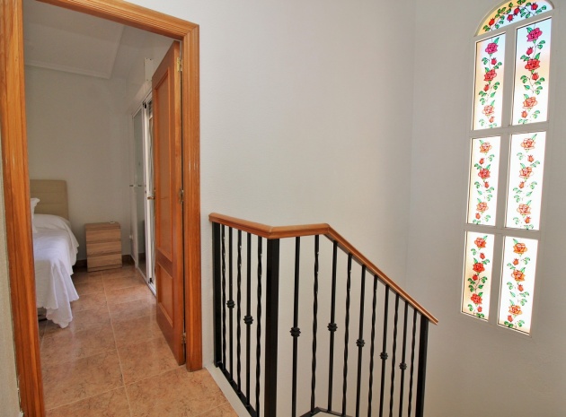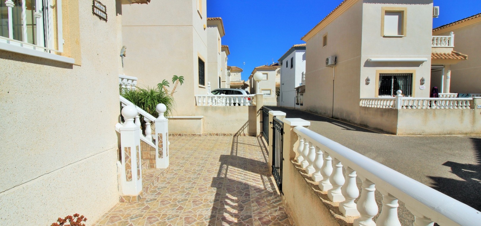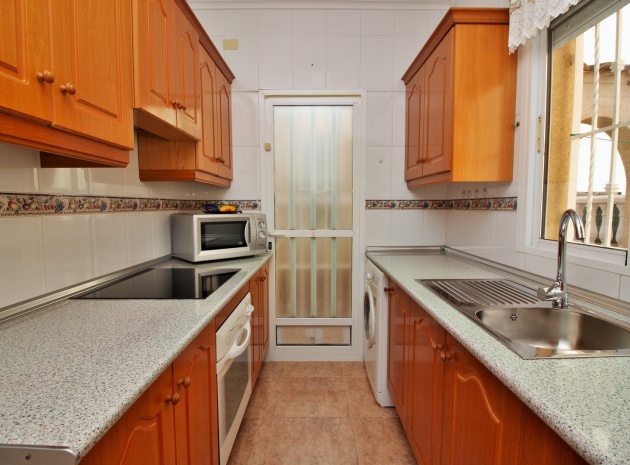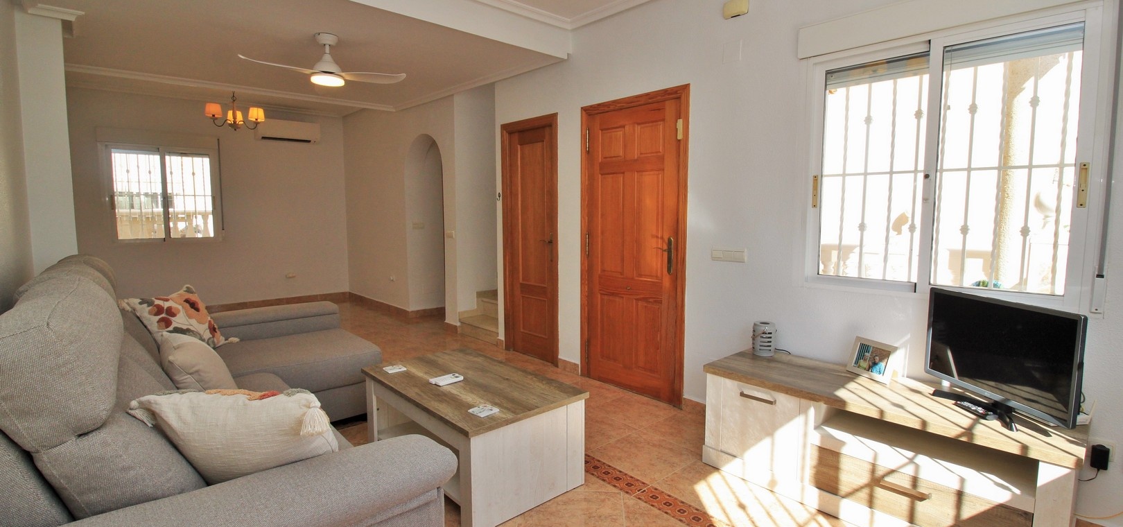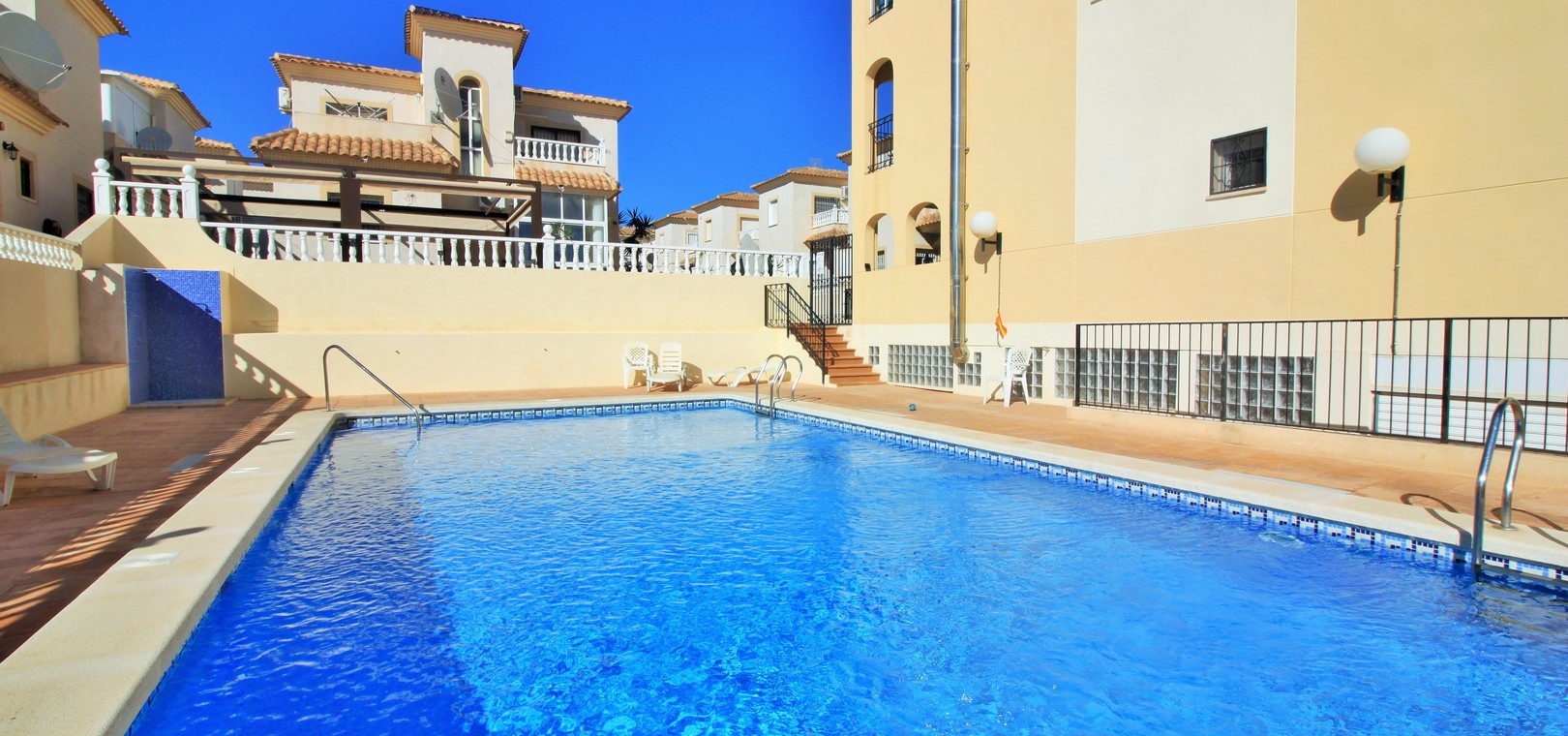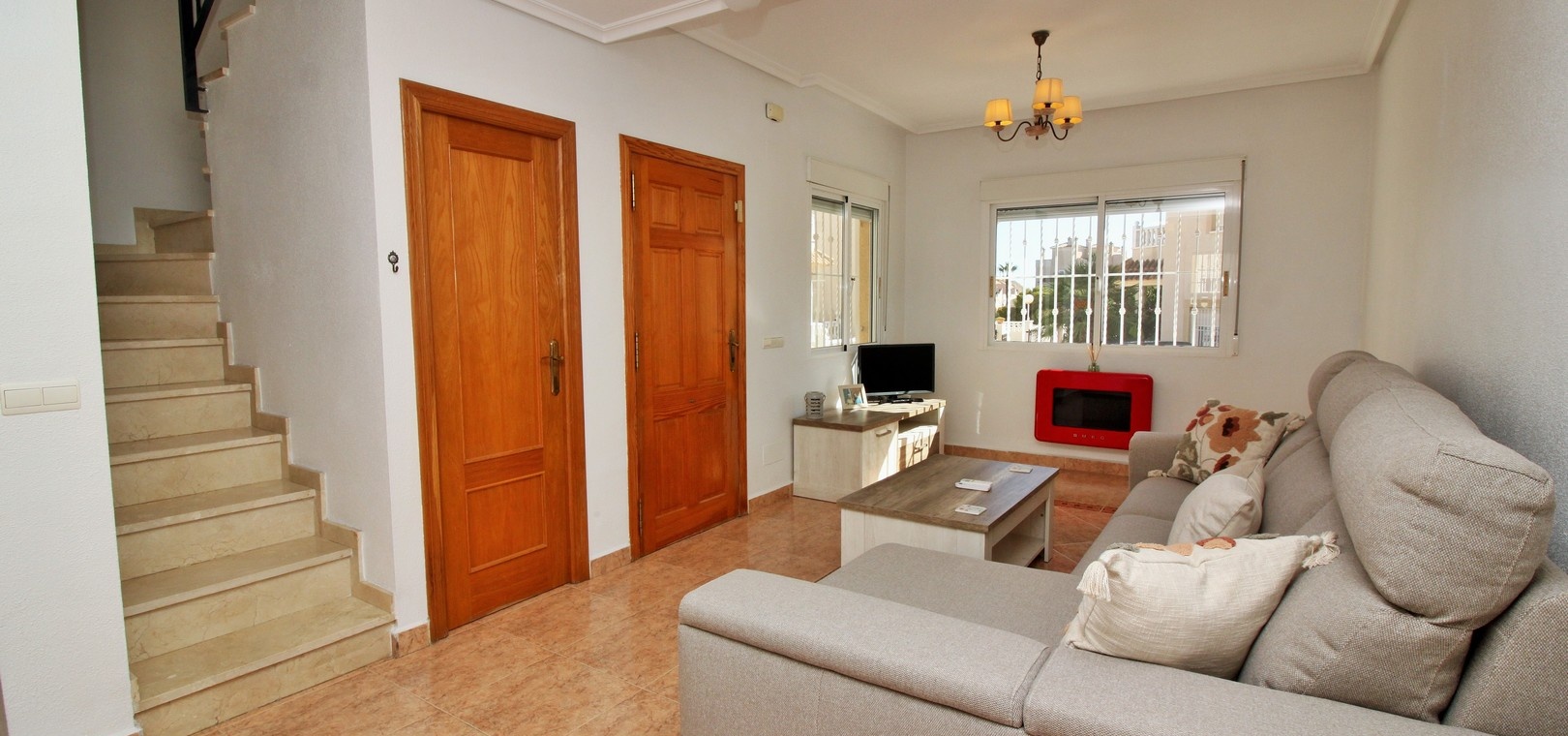 VERLAAGD MET €10.000! Prachtig gepresenteerde vrijstaande villa op het zuiden met gemeenschappelijk zwembad te koop in het wooncomplex La Pinada in Playa Flamenca. De villa verkeert in onberispelijke staat en is gelegen op een ideale locatie, op loopafstand van de lokale bars, restaurants, winkels, de zaterdagmarkt en het winkelcentrum Zenia Boulevard, met meer dan 155 winkels. De villa bevindt zich in de gemeenschap zonder doorgaand verkeer. Bezichtigingen worden ten zeerste aangeraden! Het pand is verdeeld over 2 verdiepingen, met op de begane grond een betegelde tuin met oprit, een verhoogd terras/porch die leidt naar de lichte en luchtige woon-eetkamer met aparte volledig uitgeruste keuken en een gerenoveerde badkamer beneden met inloopdouche. Vanuit de keuken heeft u ook toegang tot het buitenterras. Boven zijn 2 tweepersoonsslaapkamers met inbouwkasten en een gerenoveerde familiebadkamer met inloopdouche. Beide slaapkamers hebben een eigen balkon. De villa is goed onderhouden met nieuwe airconditioningunits, meubels, badkamers en overal opnieuw geverfd. Een perfect sleutelklaar pand, op een fantastische locatie in de buurt van de stranden en allerlei voorzieningen en diensten! La Pinada is een kleine en goed onderhouden gemeenschap die huiseigenaren gebruik biedt van een gemeenschappelijk zwembad. Neem vandaag nog contact met ons op om een bezichtiging te regelen!