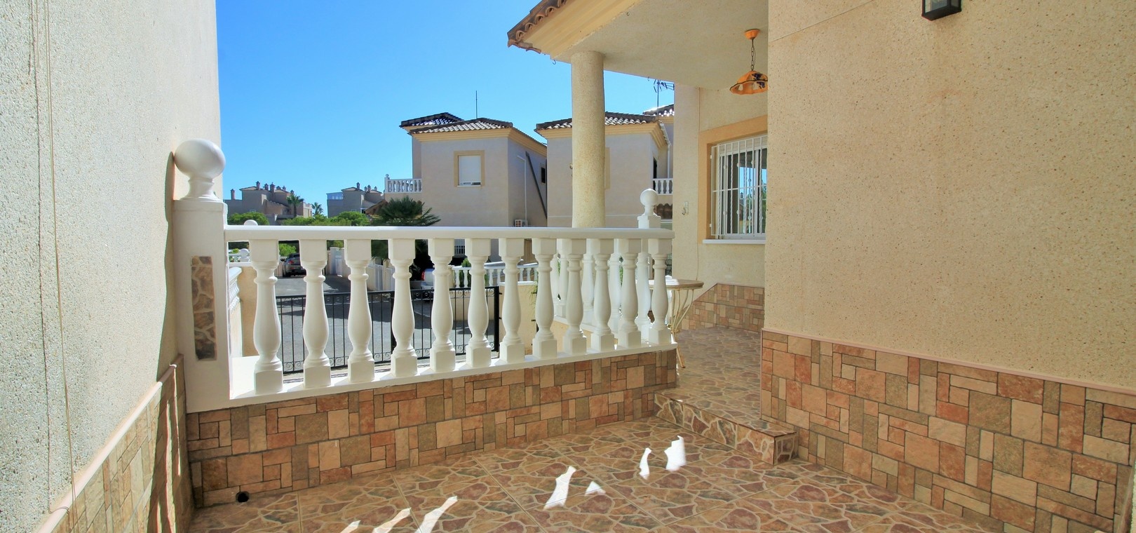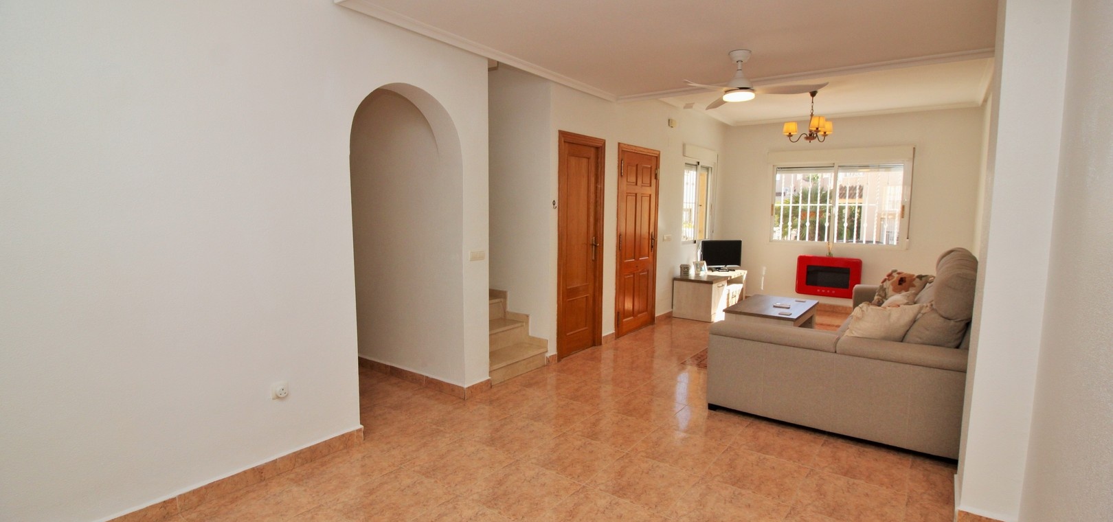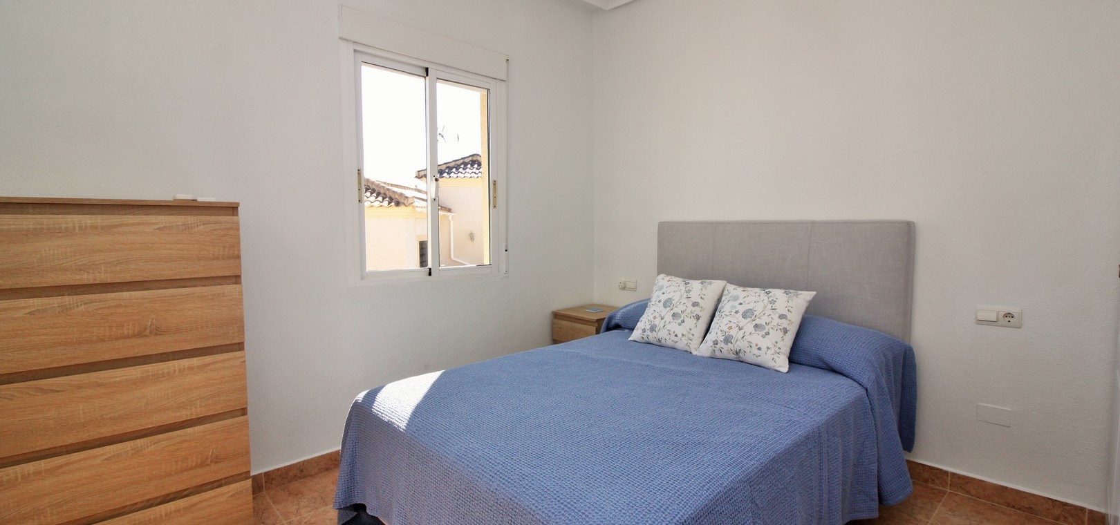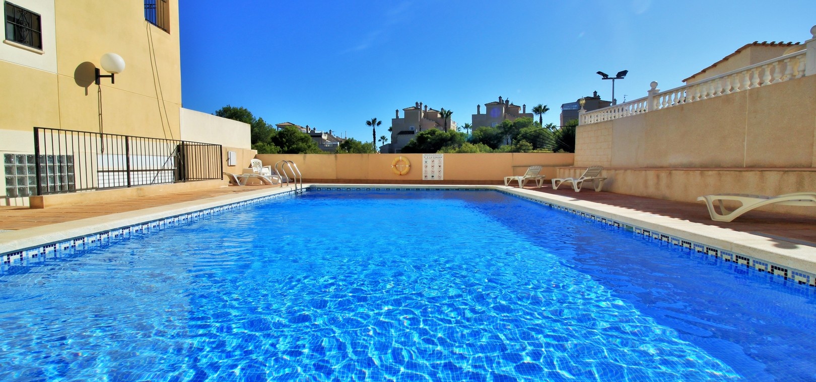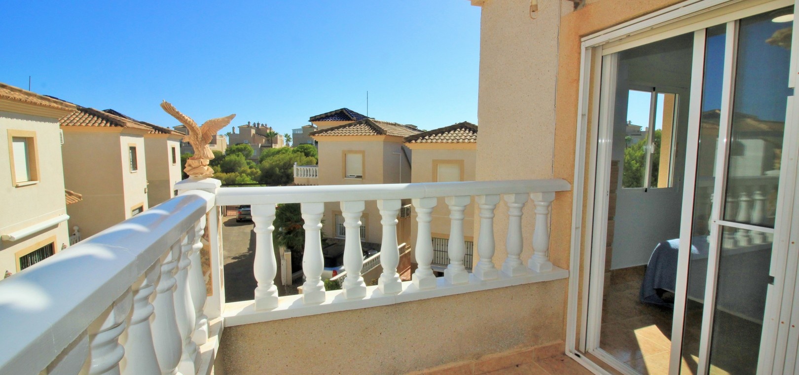 VERLAAGD MET €10.000! Prachtig gepresenteerde vrijstaande villa op het zuiden met gemeenschappelijk zwembad te koop in het wooncomplex La Pinada in Playa Flamenca. De villa verkeert in onberispelijke staat en is gelegen op een ideale locatie, op loopafstand van de lokale bars, restaurants, winkels, de zaterdagmarkt en het winkelcentrum Zenia Boulevard, met meer dan 155 winkels. De villa bevindt zich in de gemeenschap zonder doorgaand verkeer. Bezichtigingen worden ten zeerste aangeraden! Het pand is verdeeld over 2 verdiepingen, met op de begane grond een betegelde tuin met oprit, een verhoogd terras/porch die leidt naar de lichte en luchtige woon-eetkamer met aparte volledig uitgeruste keuken en een gerenoveerde badkamer beneden met inloopdouche. Vanuit de keuken heeft u ook toegang tot het buitenterras. Boven zijn 2 tweepersoonsslaapkamers met inbouwkasten en een gerenoveerde familiebadkamer met inloopdouche. Beide slaapkamers hebben een eigen balkon. De villa is goed onderhouden met nieuwe airconditioningunits, meubels, badkamers en overal opnieuw geverfd. Een perfect sleutelklaar pand, op een fantastische locatie in de buurt van de stranden en allerlei voorzieningen en diensten! La Pinada is een kleine en goed onderhouden gemeenschap die huiseigenaren gebruik biedt van een gemeenschappelijk zwembad. Neem vandaag nog contact met ons op om een bezichtiging te regelen!