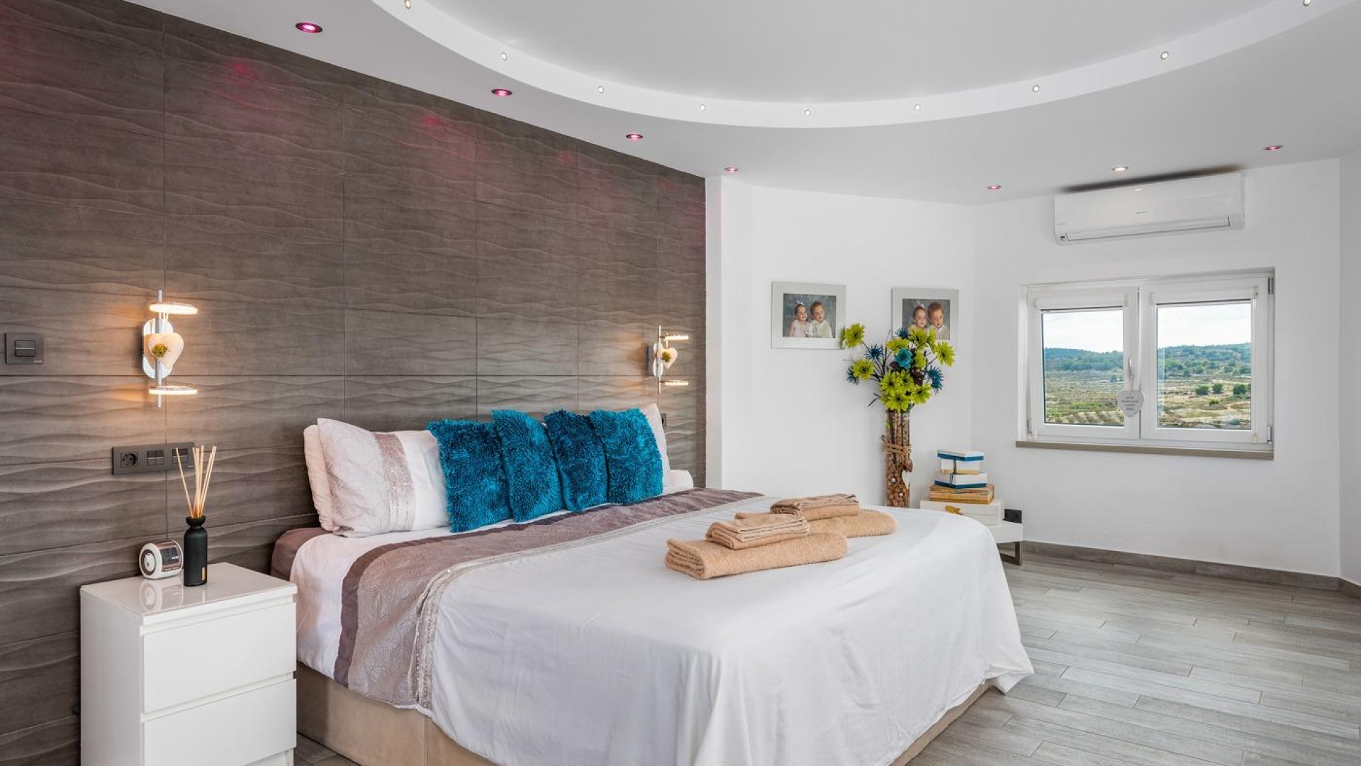 De unieke ramen die in alle richtingen gericht zijn, bieden een fantastisch uitzicht over het landschap en laten al het natuurlijke licht in de villa binnen. Vanaf hier is er een terras op het westen voor de avondzon en een groot terras dat naar het zwembad en de jacuzzi leidt. Op dit niveau zijn er ook twee slaapkamers, een fitnessruimte en een badkamer.
