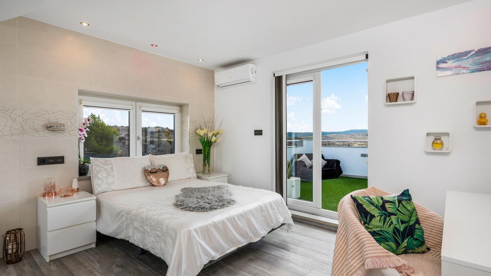 De gym kan worden omgebouwd tot een 6e slaapkamer met een en-suite badkamer. Op de eerste verdieping komt u in de hoofdslaapkamer met een eigen en-suite badkamer met een diep bad en een groot privéterras. Ook deze kamer heeft een panoramisch uitzicht over de bergen.