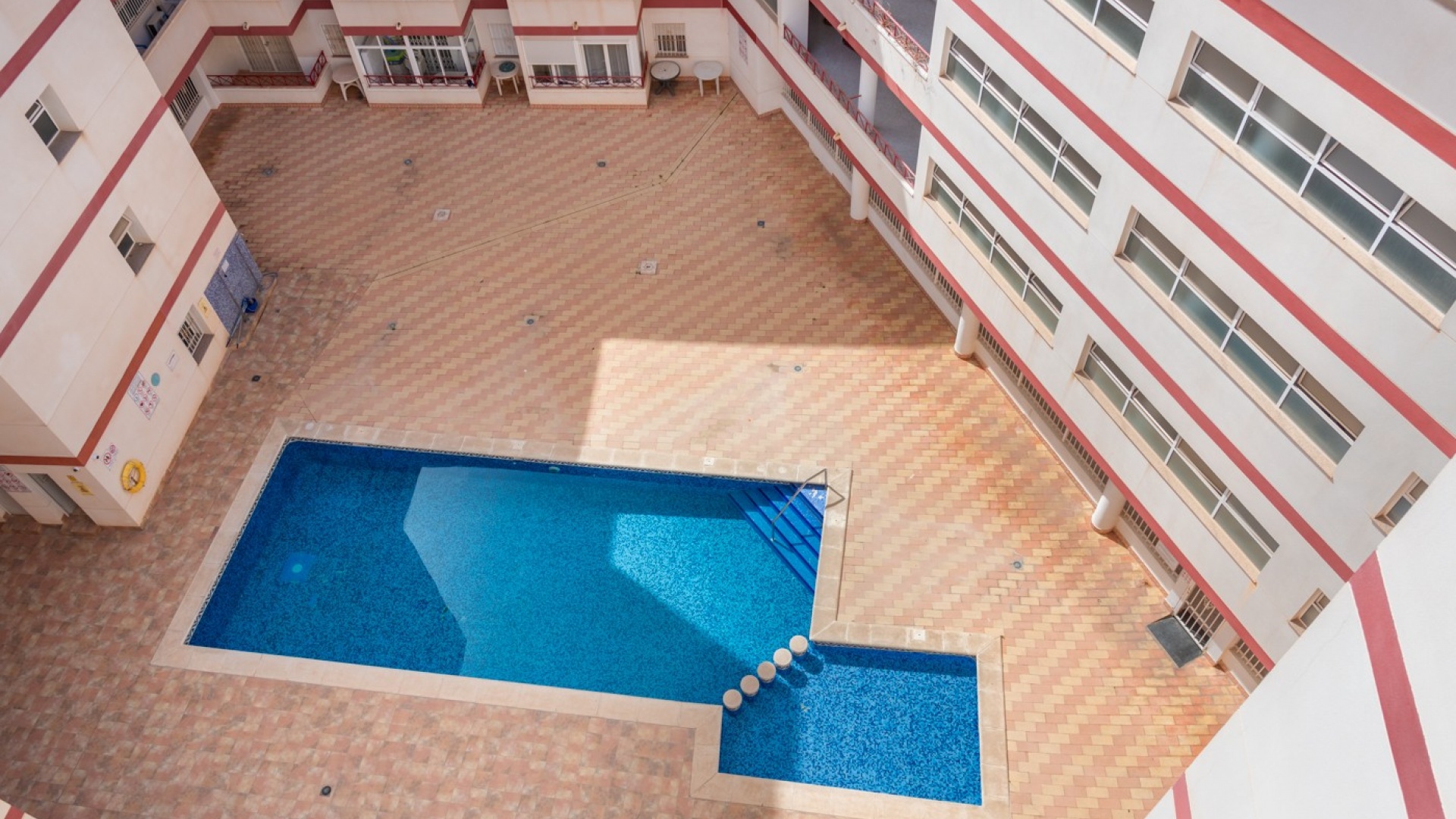 Gelegen op de vierde verdieping van een gebouw met lift, is het appartement onderdeel van een goed onderhouden gemeenschap met een heerlijk gemeenschappelijk zwembad. Omringd door tafels en stoelen, is dit de perfecte plek om te ontspannen en te genieten van een hele dag bij het zwembad.