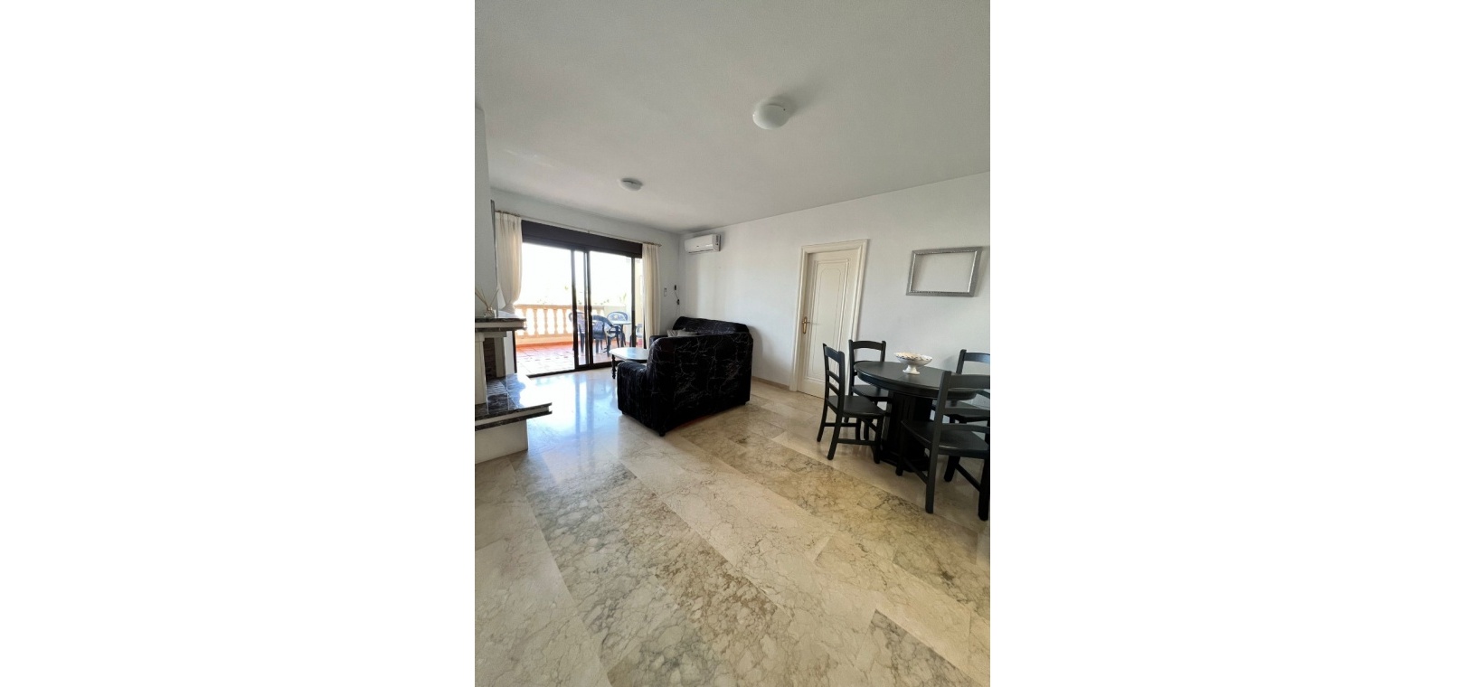 Woonkamer/eetkamer met open haard, warme en koude airconditioning en deuren naar het balkon, open keuken, aparte bijkeuken, 2 slaapkamers met inbouwkasten, de hoofdslaapkamer heeft een eigen badkamer, 1 doucheruimte, ondergrondse parkeergarage, berging, toegang tot een gemeenschappelijk zwembad en nog veel meer.