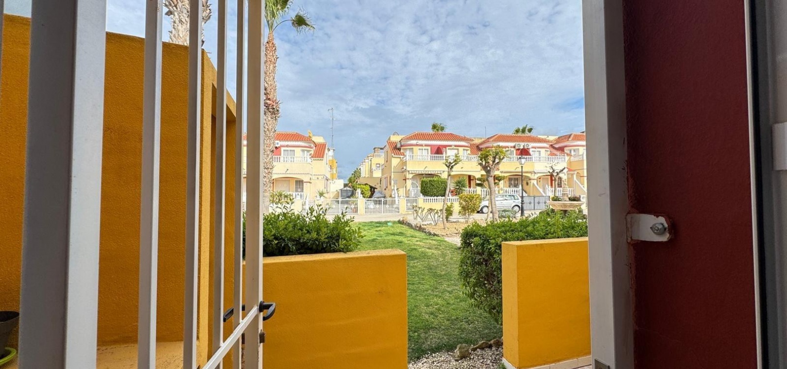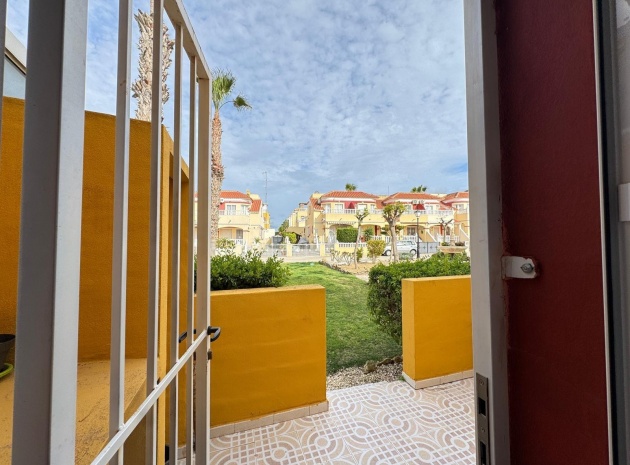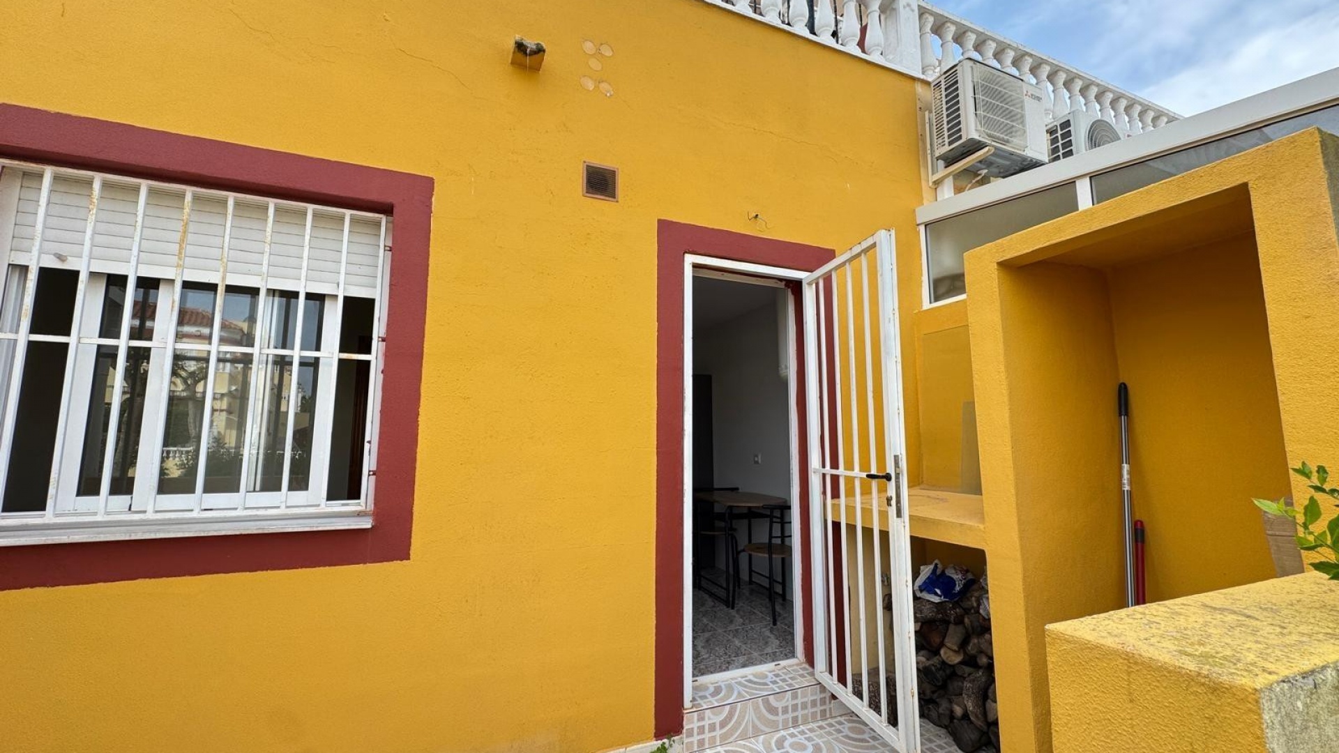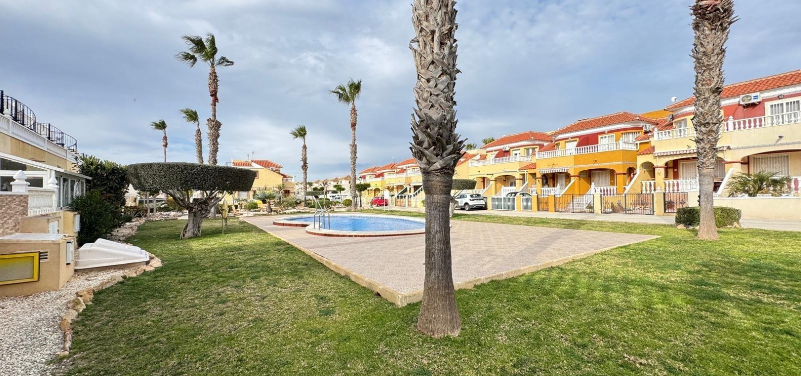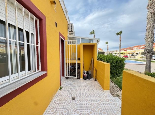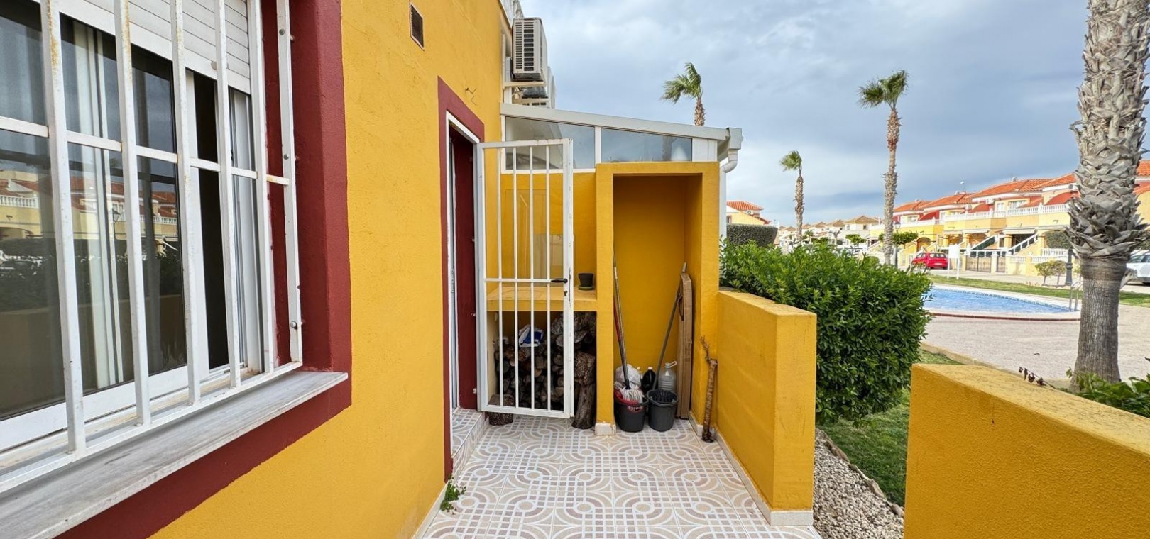 Op de begane grond bevinden zich een woon-/eetkamer met warme en koude airconditioning, een aparte ingerichte keuken, een aparte bijkeuken, een achtertuin met directe toegang tot het gemeenschappelijke zwembad, 1 slaapkamer met tweepersoonsbed en 1 toilet.