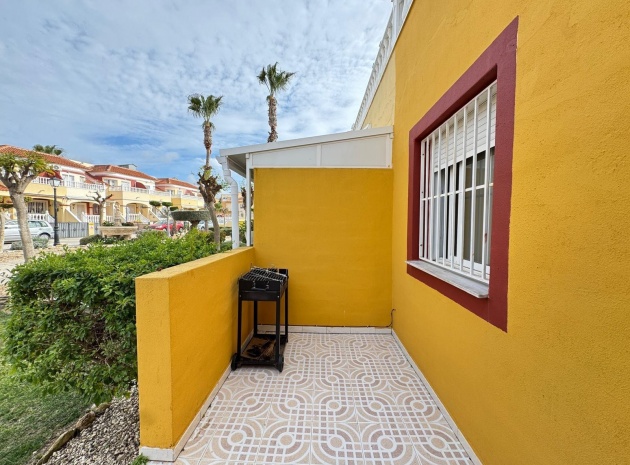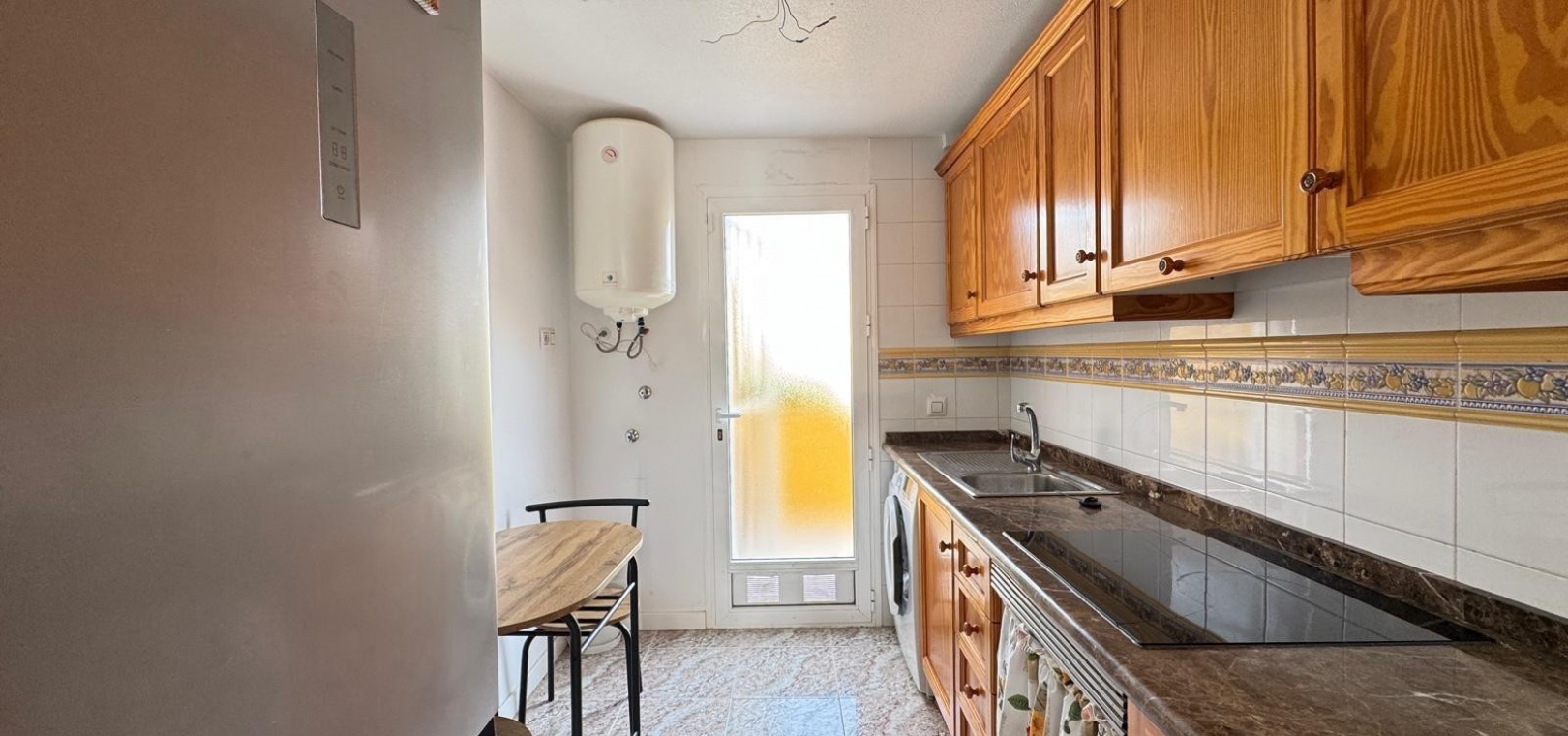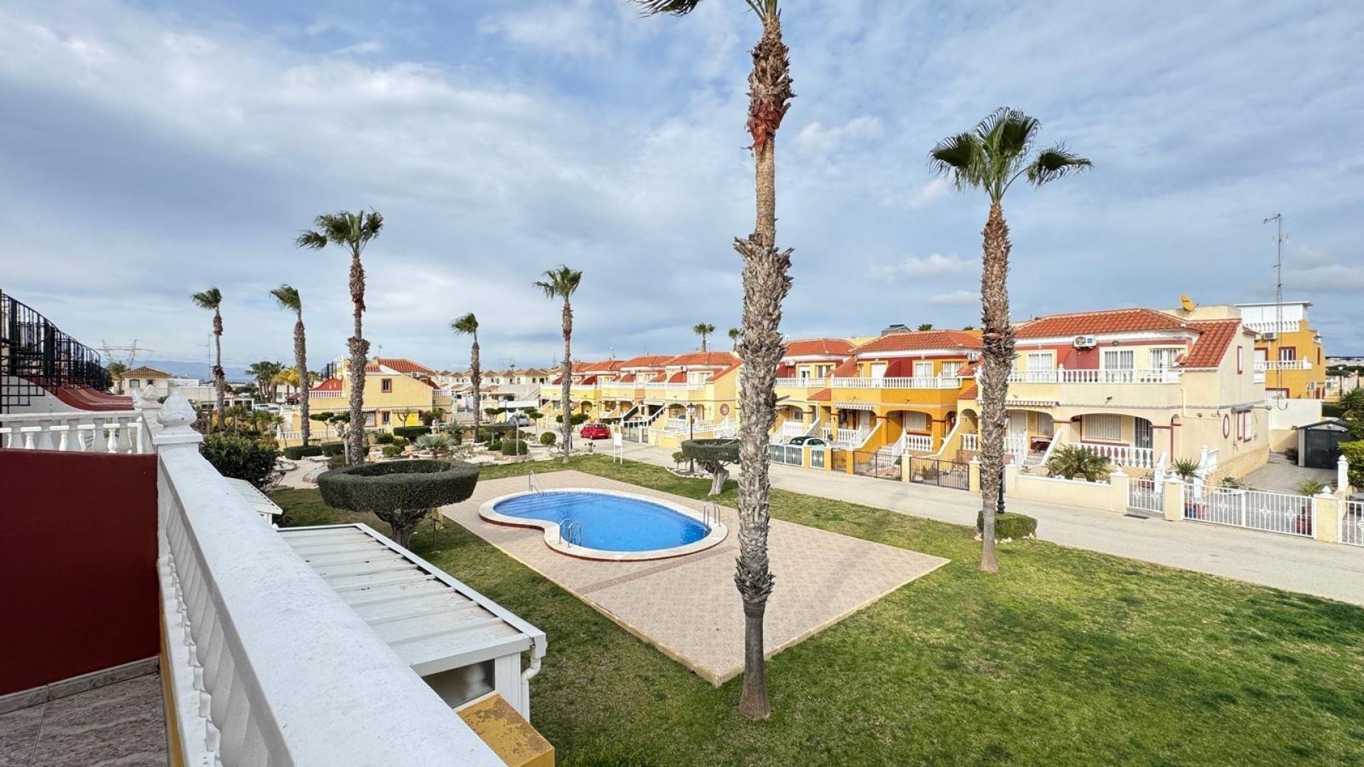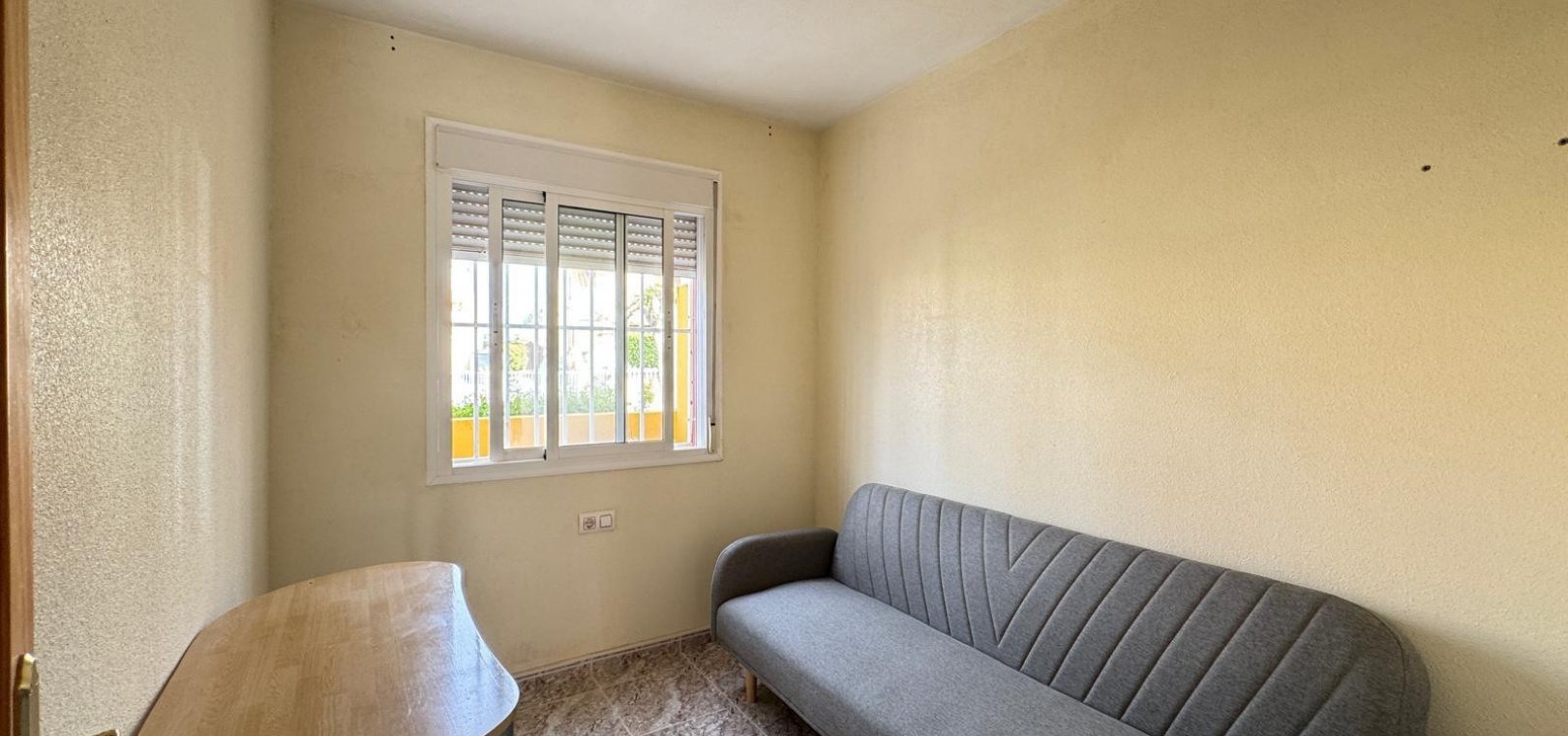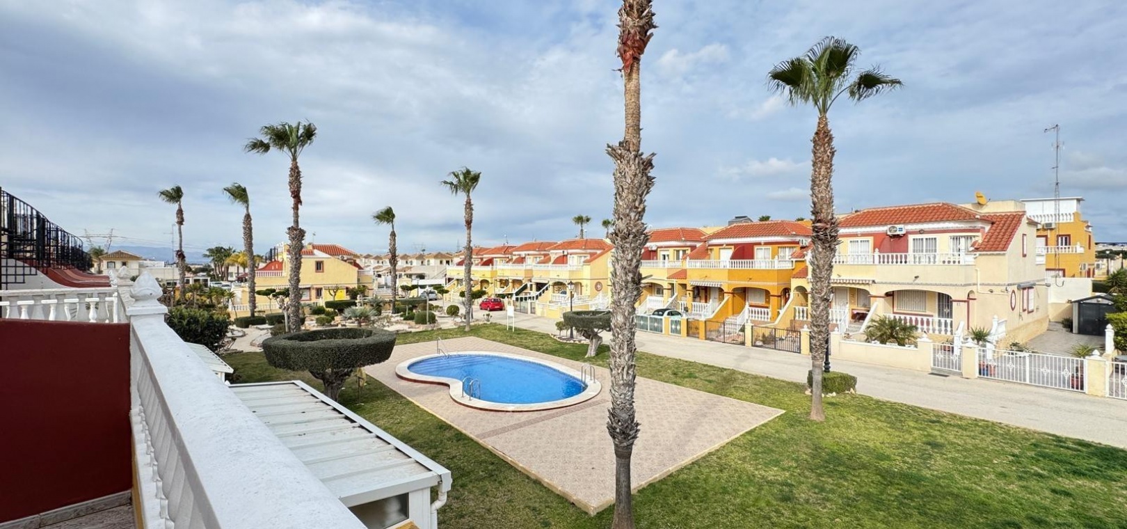 Op de begane grond bevinden zich een woon-/eetkamer met warme en koude airconditioning, een aparte ingerichte keuken, een aparte bijkeuken, een achtertuin met directe toegang tot het gemeenschappelijke zwembad, 1 slaapkamer met tweepersoonsbed en 1 toilet.